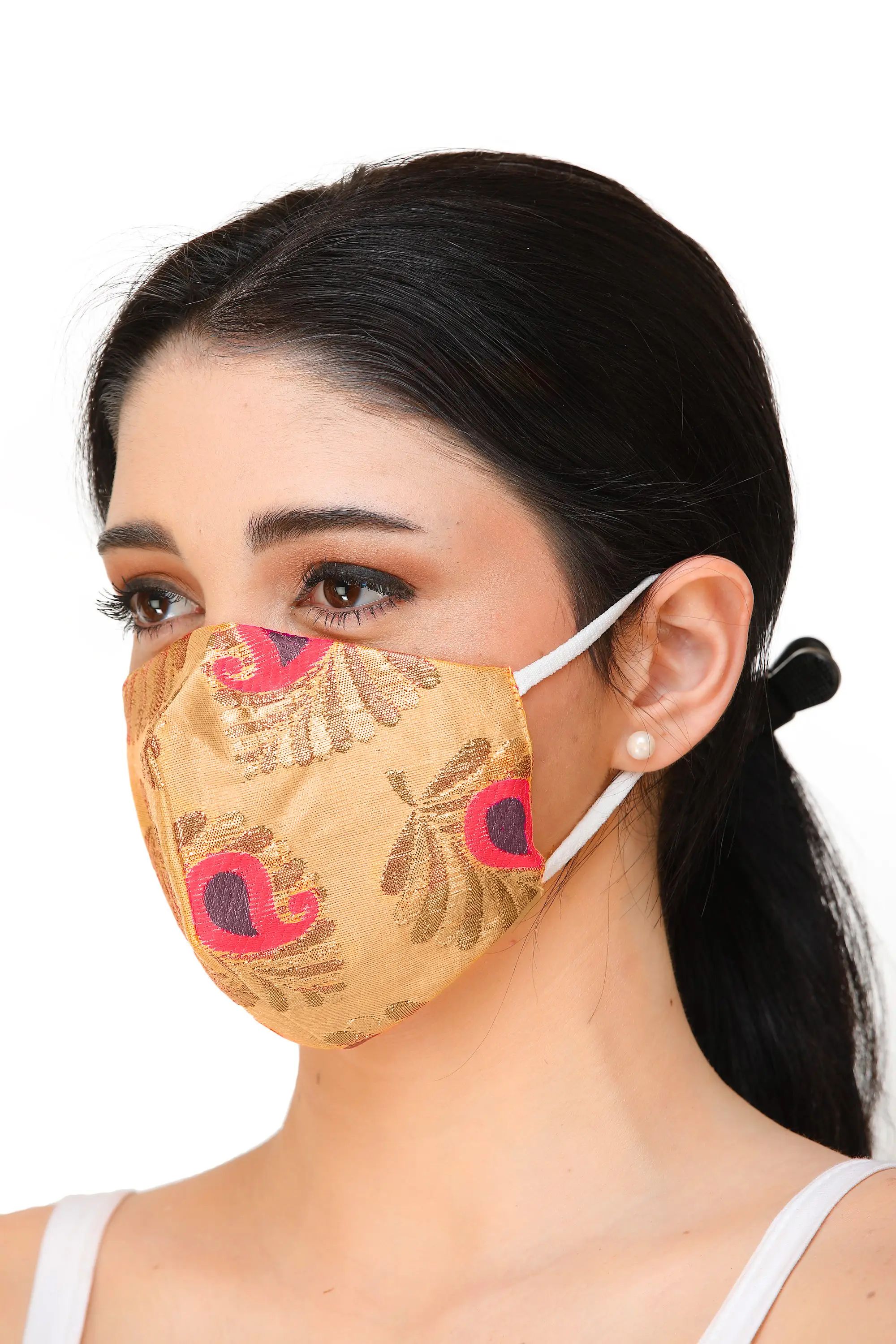 This Mask, a symbol of elegance and protection, features delicately woven flowers on a canvas of Art Silk, evoking the enchanting charm of Banarasi craftsmanship. Beyond its aesthetic allure, this mask stands as a silent guardian, with a robust two-ply structure and a comforting cotton backing. This masterpiece is more than a shield rather it is a cultural ode, embodying the artisan’s legacy and the resilience of tradition. Wearing it is not just an act of prudence; it is a celebration of heritage, a subtle dance between practicality and artistry.