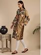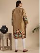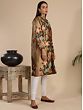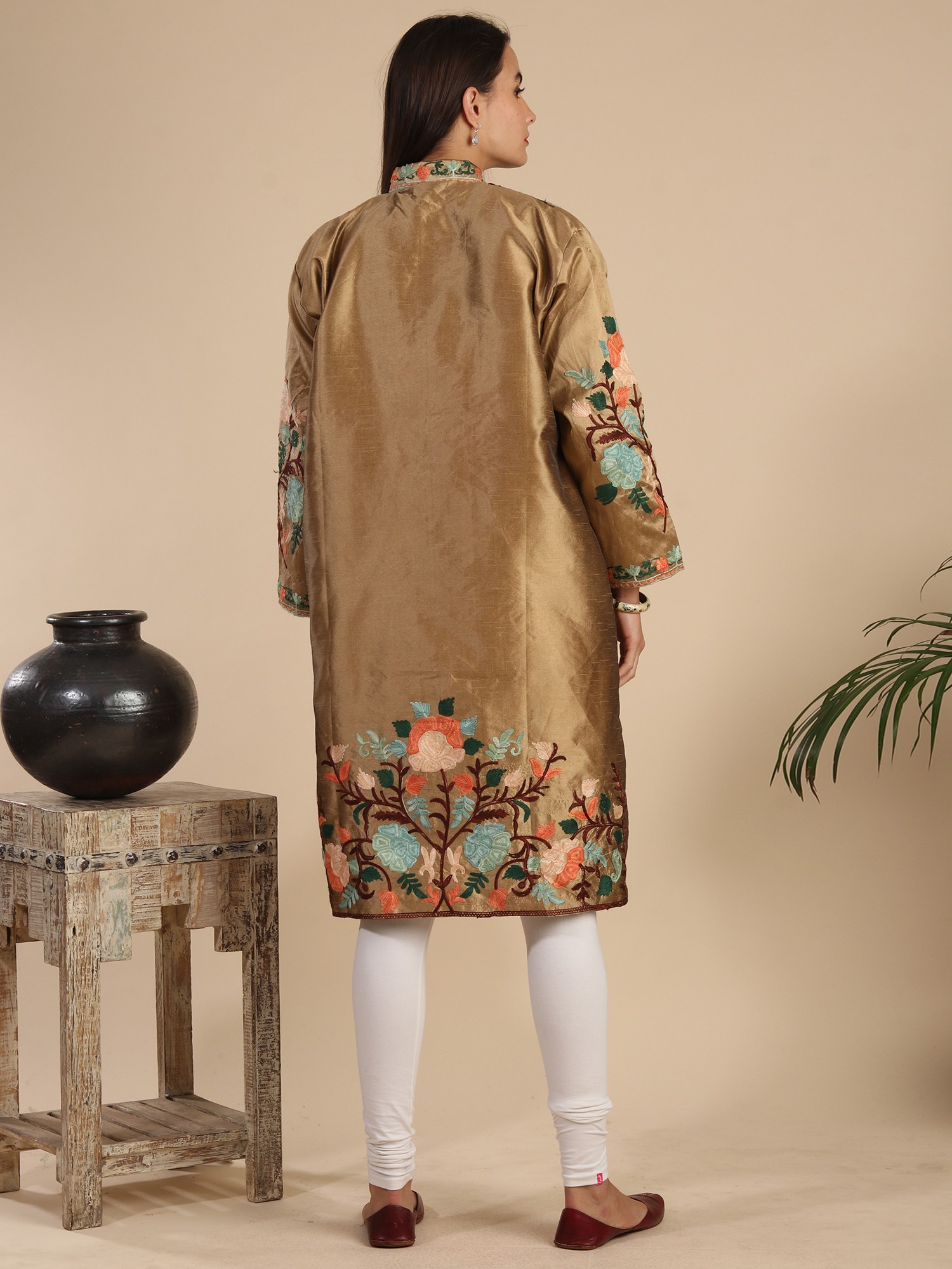 Embrace sophistication with our Bronze-Blue Art Silk Long Jacket from Kashmir, adorned with an Aari-Embroidered All-Over Bold Floral Vine Pattern. The rich bronze-blue hue and intricate floral vine pattern showcase the artistic mastery of Kashmiri craftsmanship. The Aari embroidery adds a touch of regal elegance to the ensemble, making it a wearable piece of art. This jacket is a celebration of Kashmir's cultural richness and the timeless allure of Aari embroidery. Step into refined allure with this Bronze-Blue Art Silk Long Jacket, a perfect choice for those who appreciate the beauty of bold floral patterns and desire to make a statement with their style.