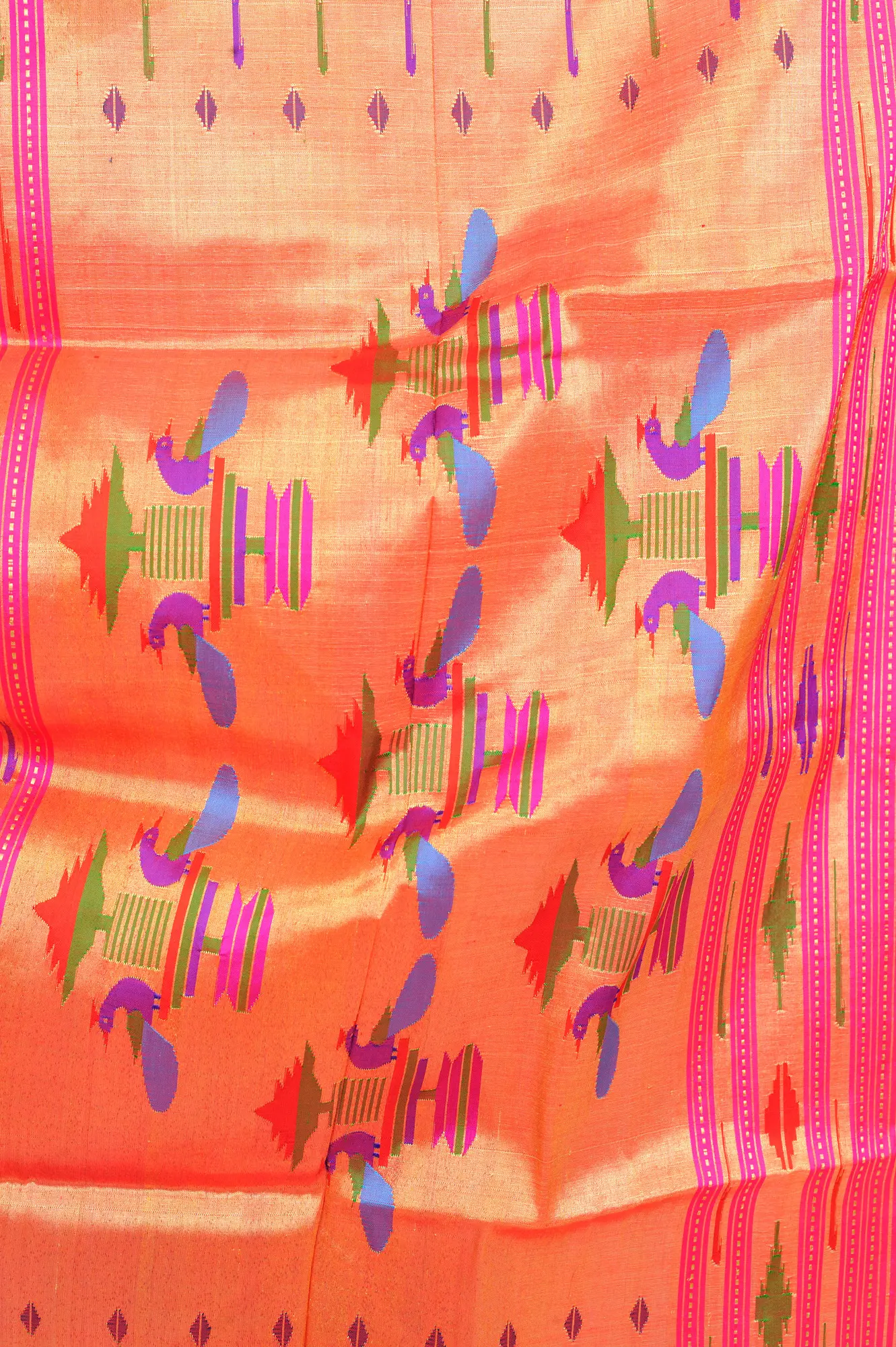 Paithani silk sarees are woven with the Tapestry technique in which the weft yarn of small lengths is returned being interlaced or interlocked with the threads of different weft colors as per the required designs. This is the most time-consuming step and is done very carefully. It usually takes around 1.5 years to complete weaving.