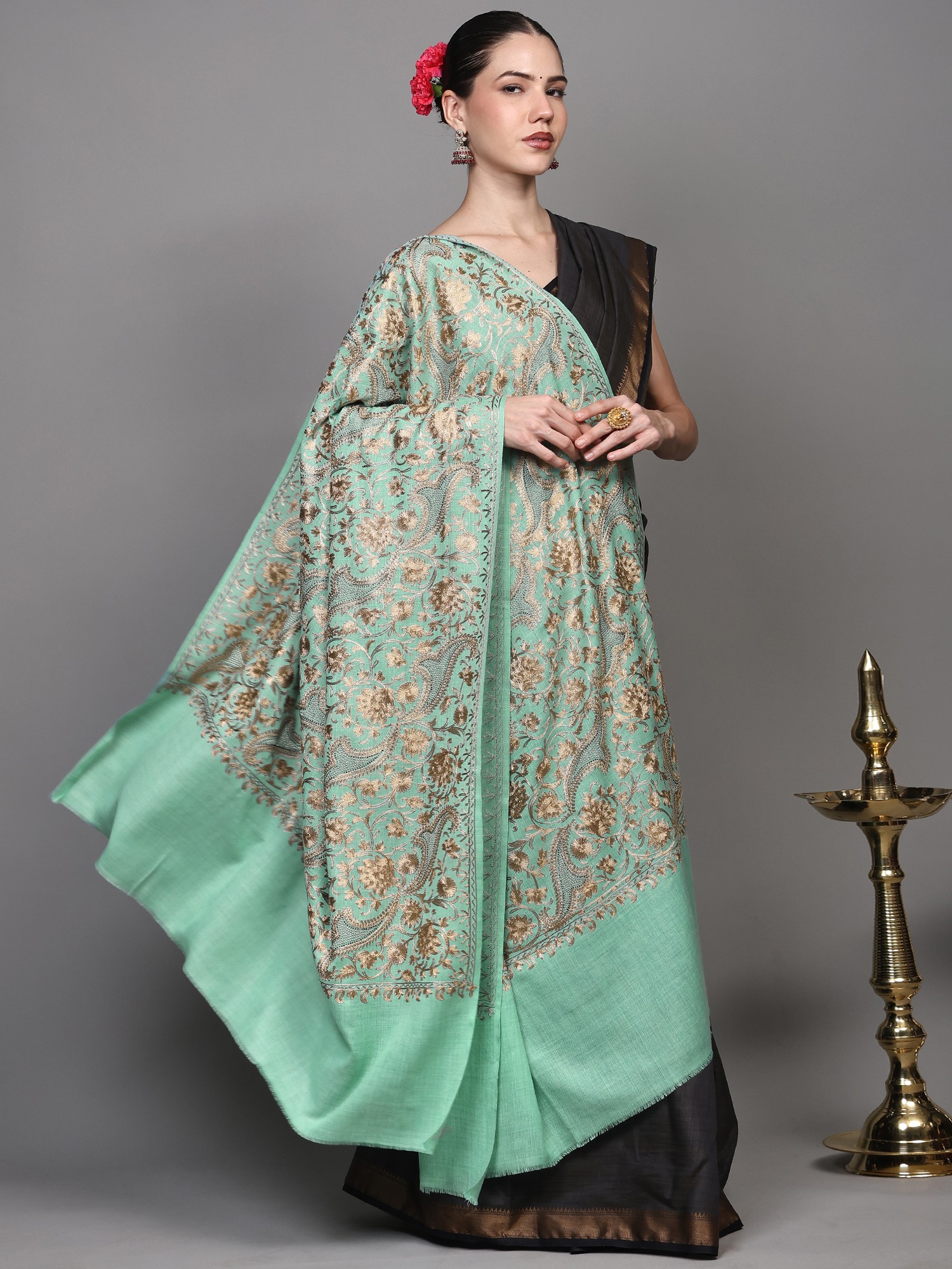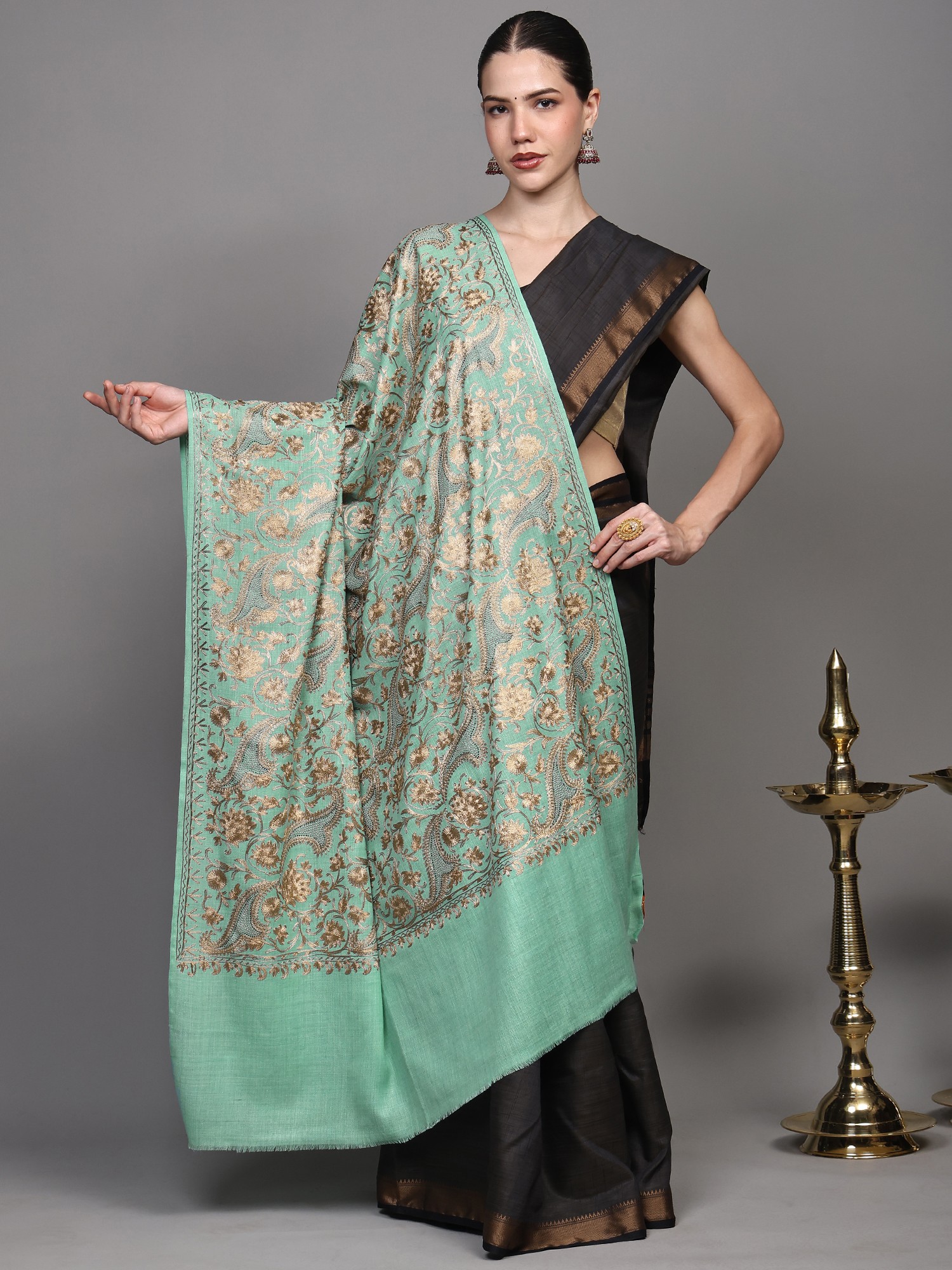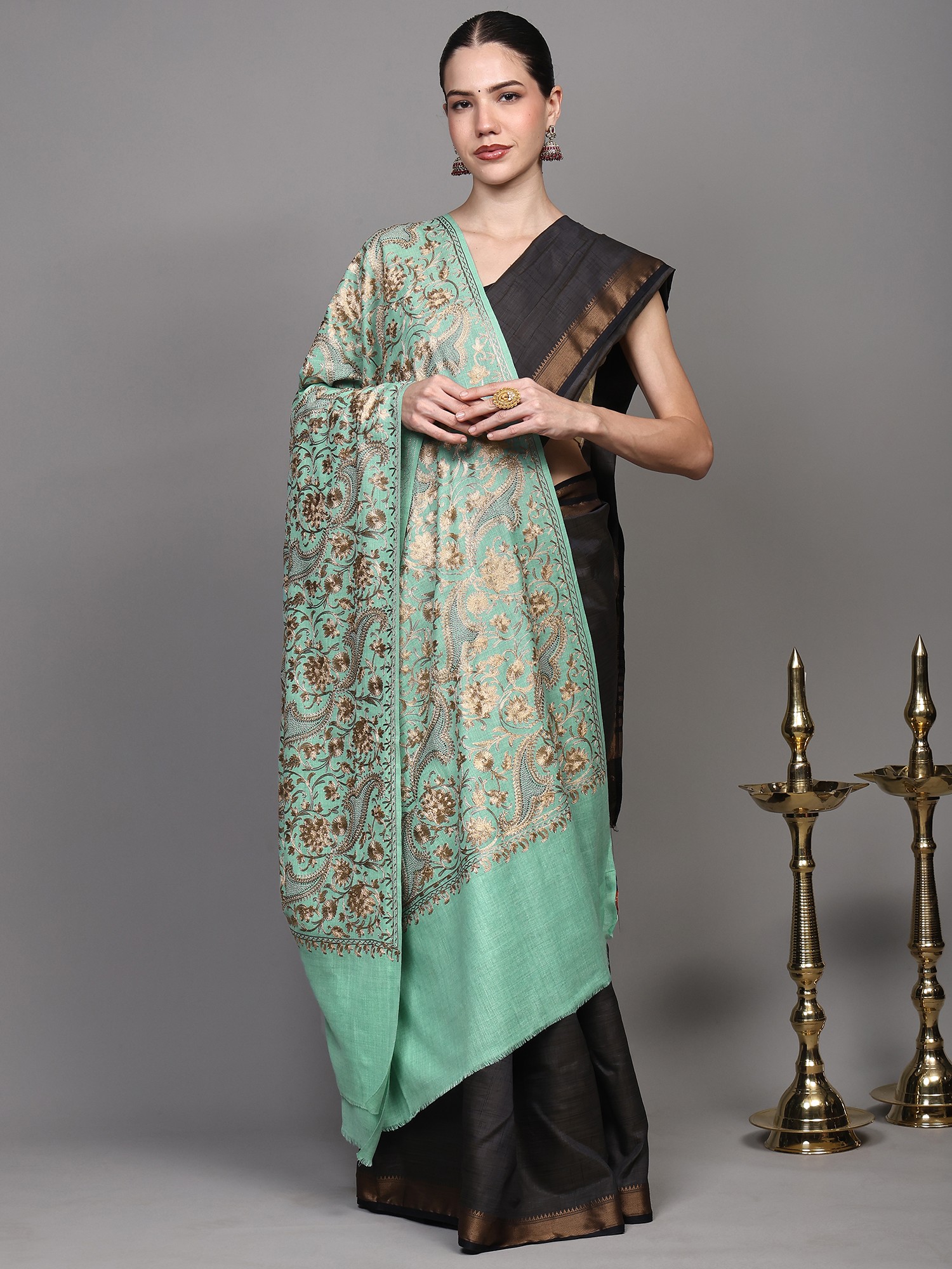Nile-Green Pure Pashmina Handloom Shawl from Kashmir with Sozni Embroidered Flowers and Paisleys