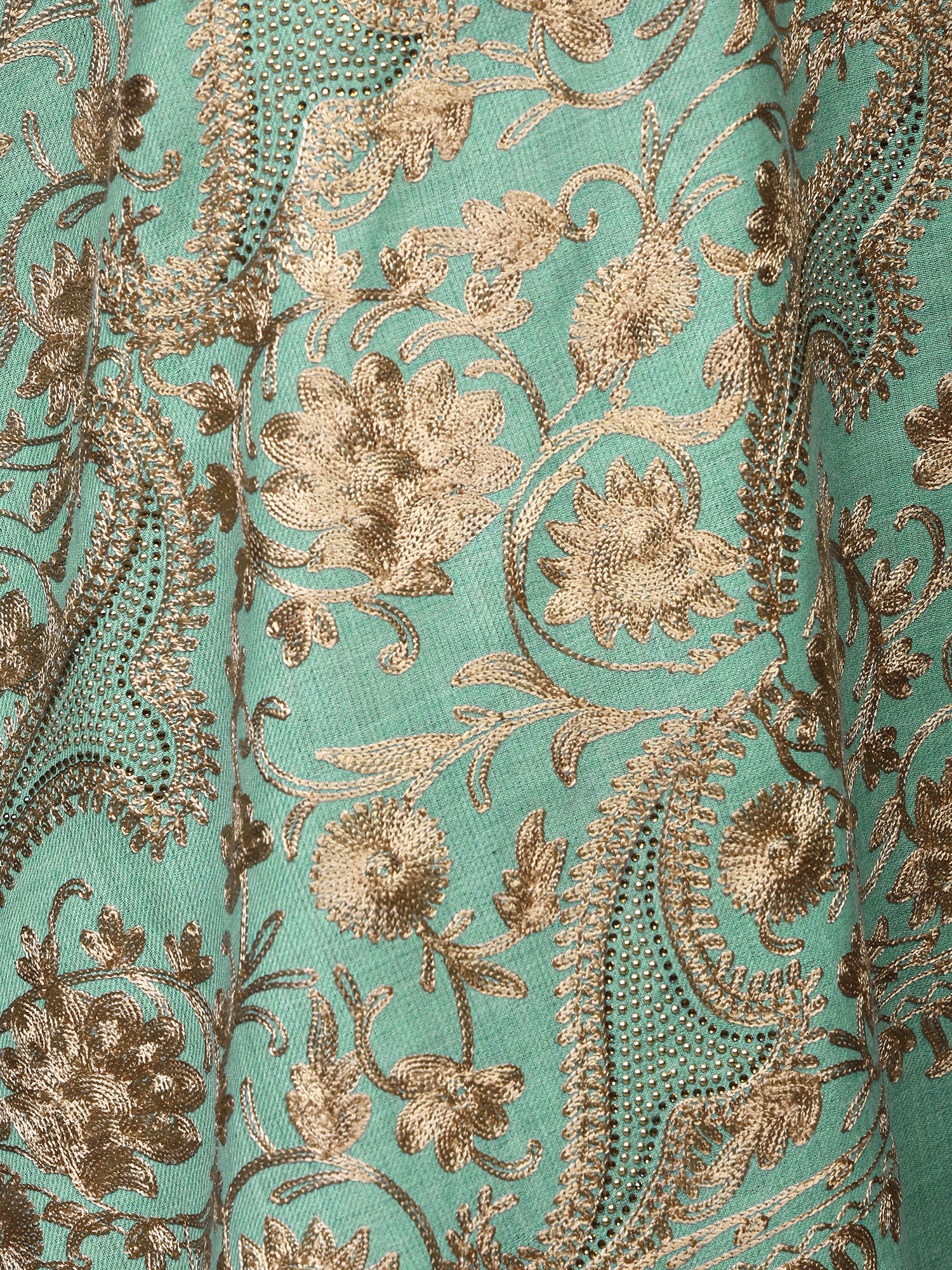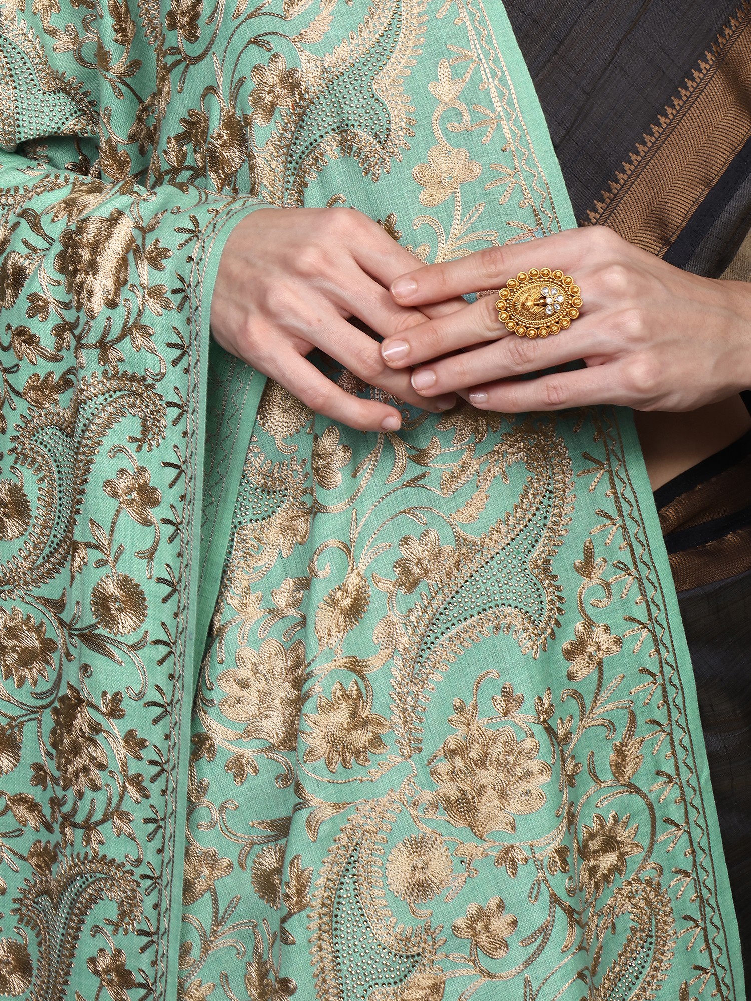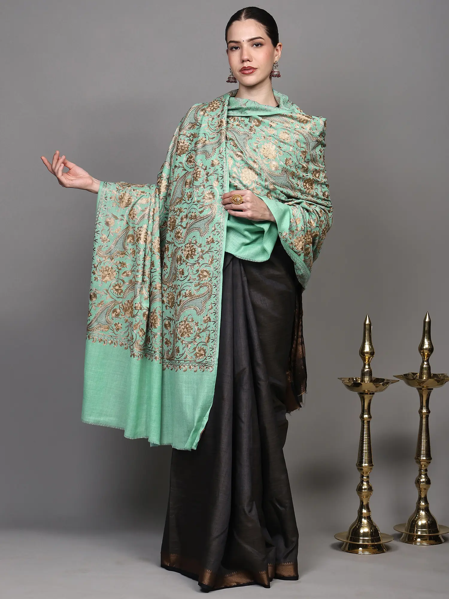 Mist-Green Pure Pashmina Palledar Shawl with Sozni Embroidery by Hand