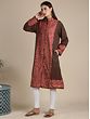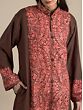 Experience the epitome of Kashmiri elegance without our brown all-over aari embroidered floral kalka pattern wool long jacket. Crafted from sumptuous wool, this jacket is a tribute to the intricate artistry of the region. Adorned with an all-over Aari embroidery, each delicate stitch brings to life the timeless beauty of the floral kalka pattern, evoking the mesmerizing charm of Kashmir’s natural landscapes.