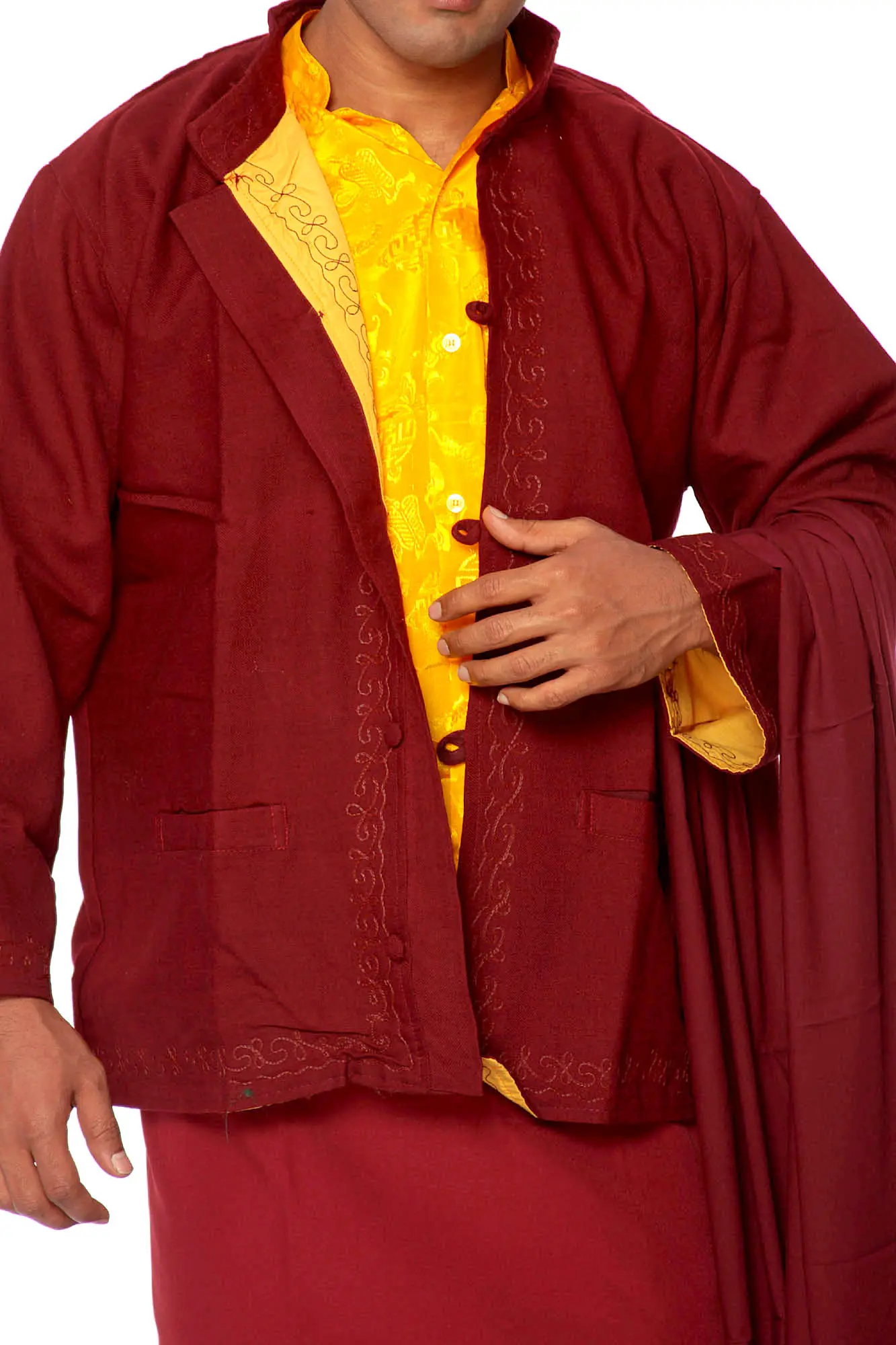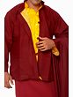 The costume features a vibrant yellow inner tunic, a symbol of enlightenment and purity, that peeks through from beneath a rich, deep maroon outer robe. The outer robe is a testament to traditional craftsmanship, adorned with subtle yet intricate embroidered detailing along the collar and cuffs. This embroidery adds a touch of refined artistry, enhancing the overall aesthetic of the garment. The maroon color of the robe is deeply symbolic, often representing monastic life and spiritual authority, imbuing the wearer with a sense of gravitas and devotion. The inclusion of a complementing maroon shawl further completes the authentic look, allowing for graceful draping and a layered silhouette.