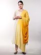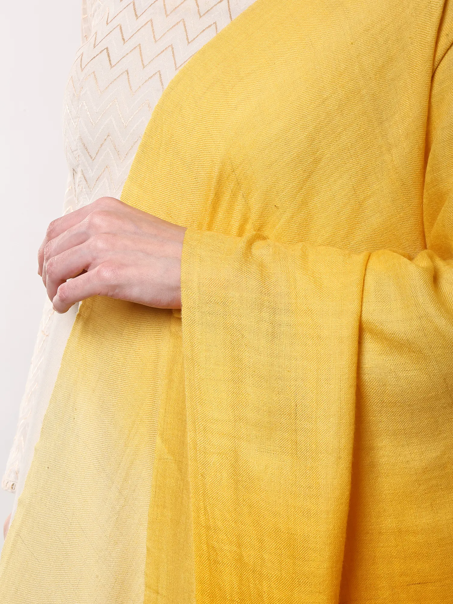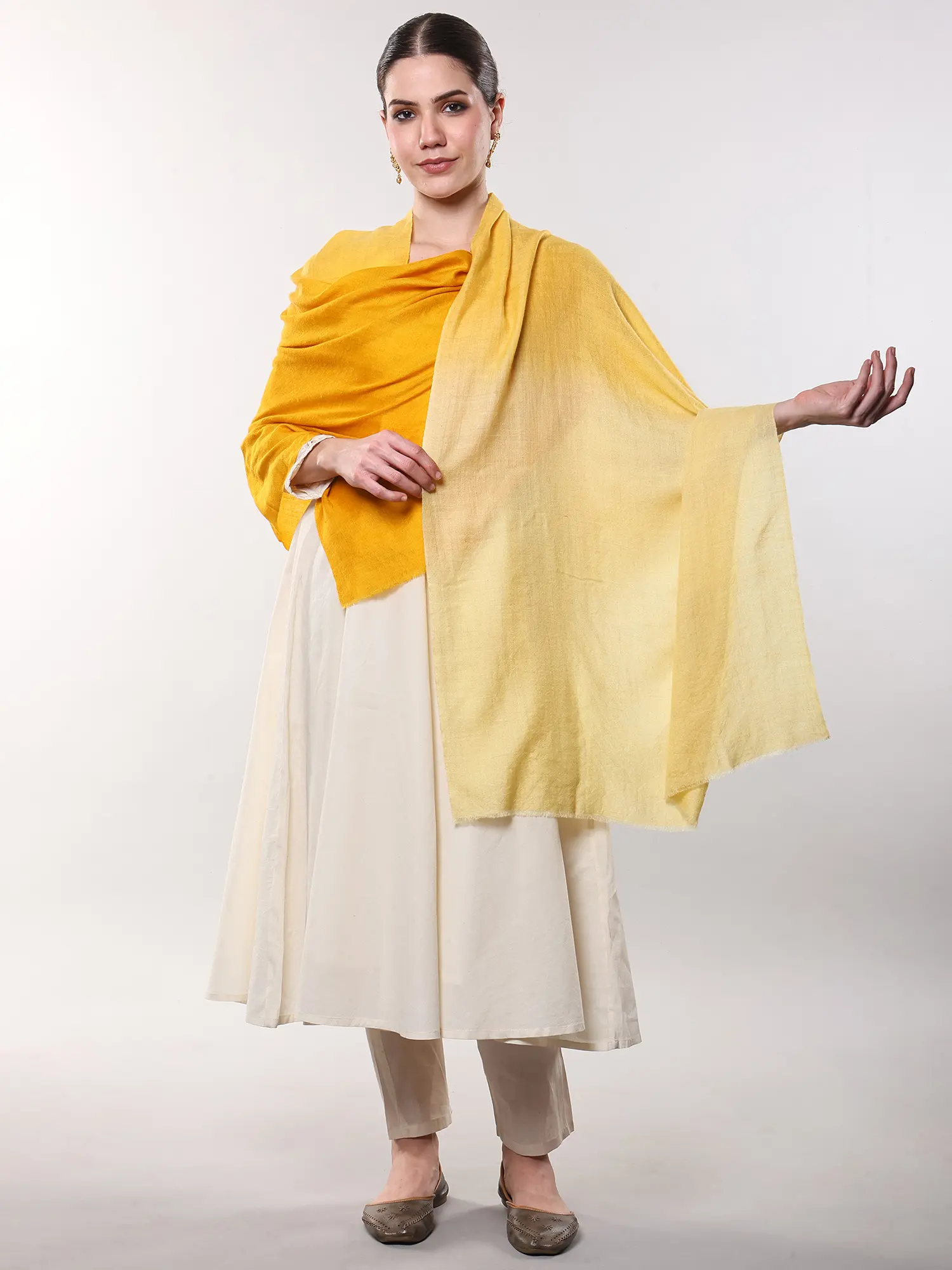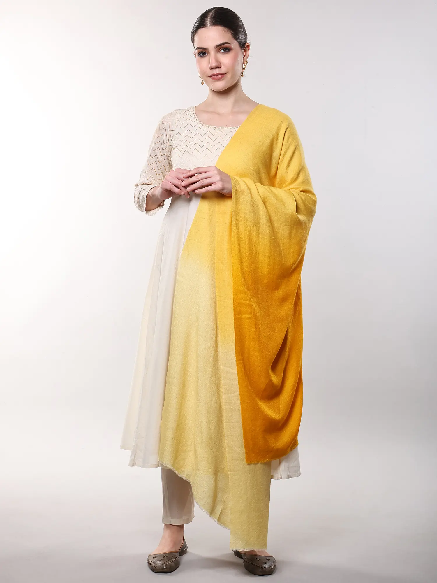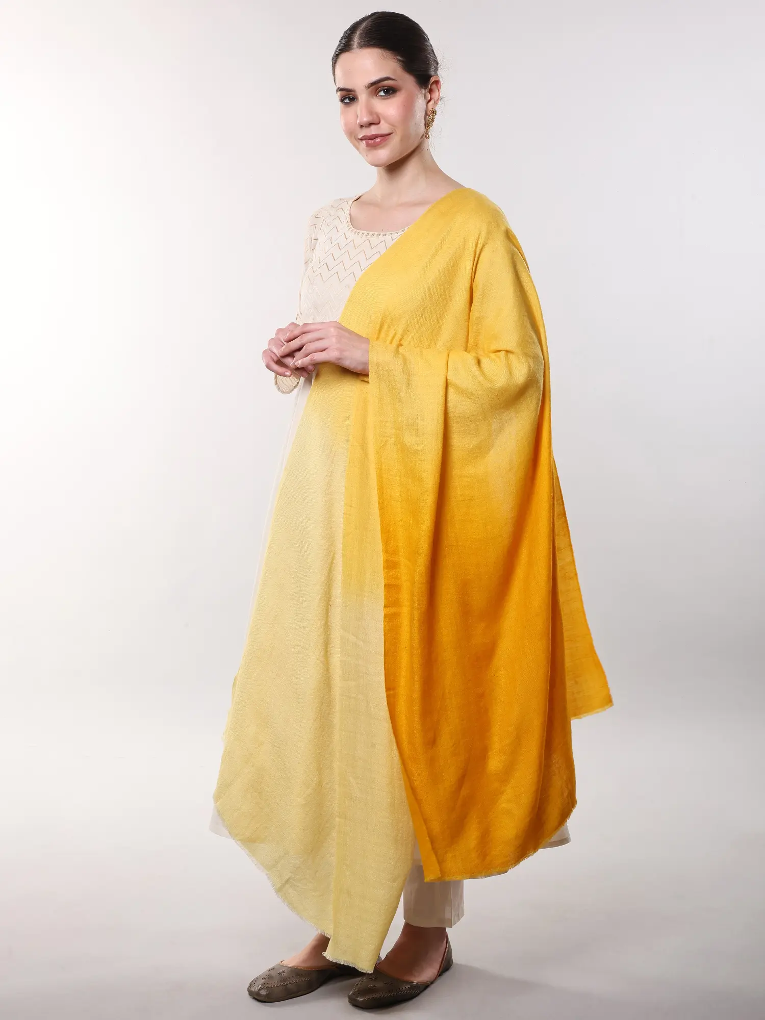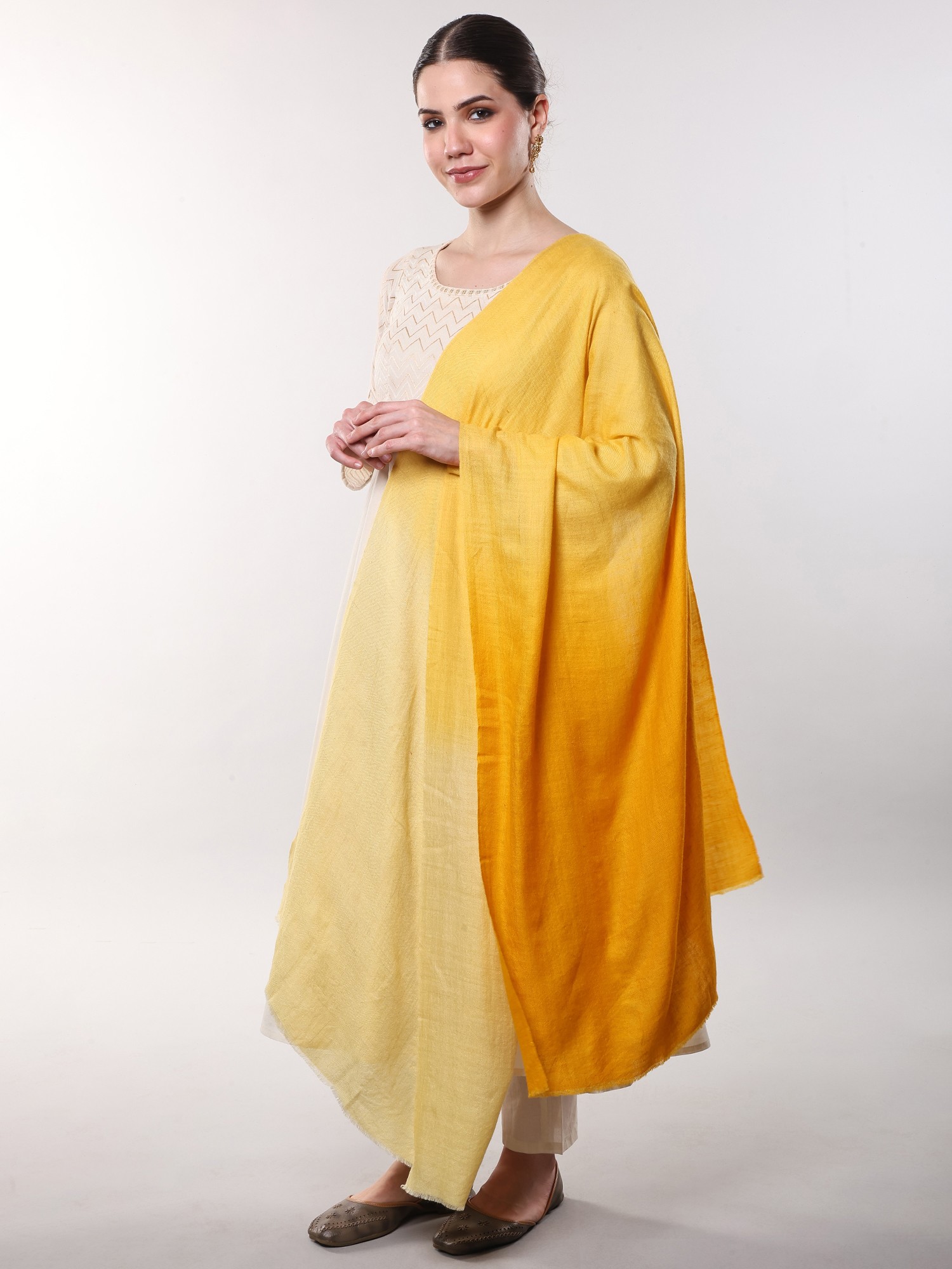 The enchanting gradient, transitioning from a soft buff to a vibrant, sun-kissed yellow, evokes the gentle passage of dawn to midday. This subtle yet striking color play adds depth and visual interest to any outfit. Its generous dimensions, measuring a considerable 78 inches in length and 29 inches in width, provide ample fabric to drape, wrap, or style in myriad elegant ways.
