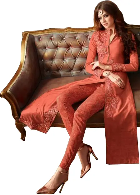 The versatility of this Burnt-Coral Designer Trouser Salwar Kameez Suit makes it a standout addition to any wardrobe. Whether you choose to accessorize with statement jewelry and heels for a grand affair or opt for more understated elegance, this suit is sure to impress. The rich color and intricate detailing make it a piece that can be worn season after season, retaining its timeless appeal. It's an investment in quality and style, perfect for creating unforgettable memories.