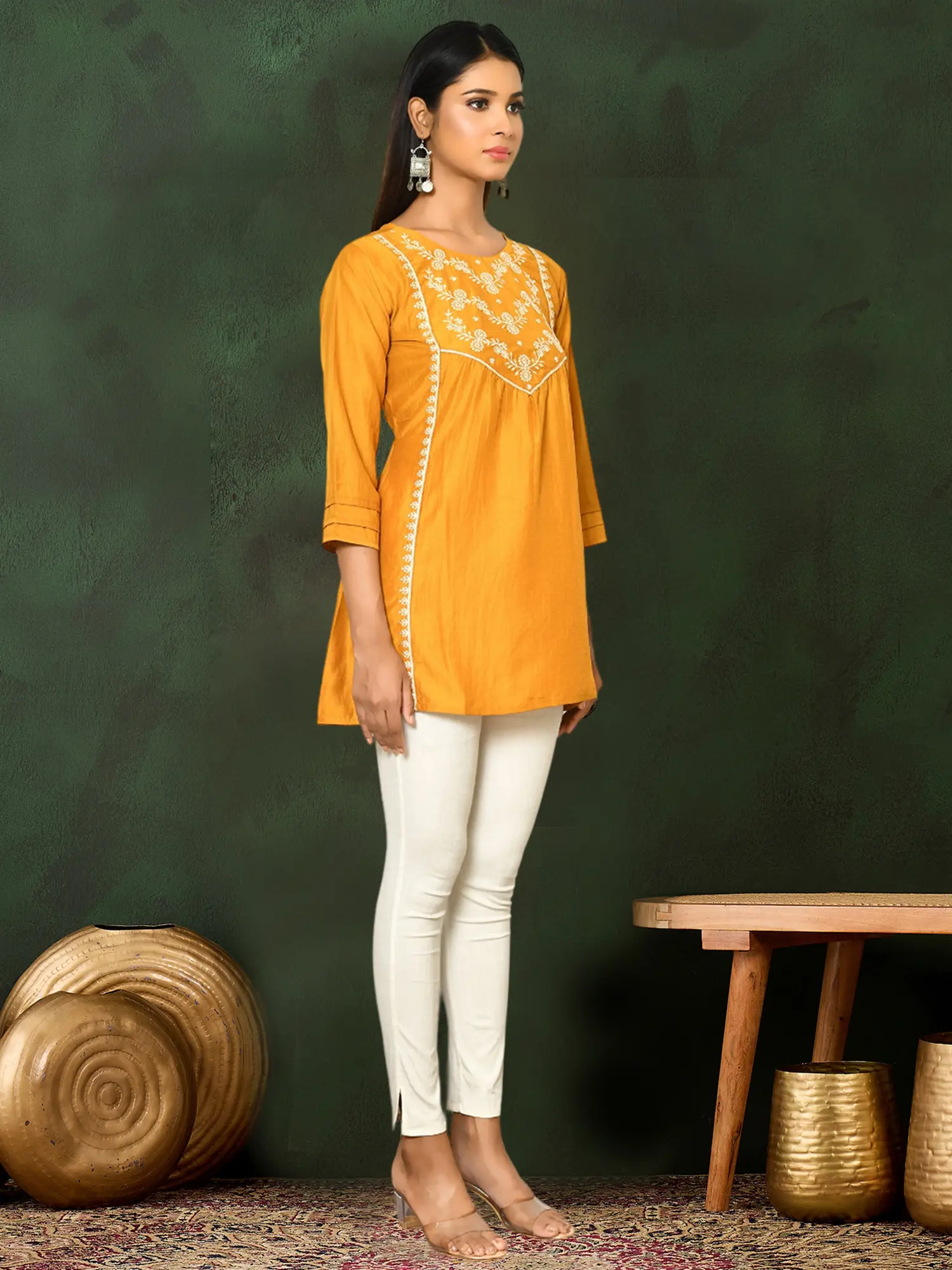 This top is a testament to versatile styling. Pair it with crisp white leggings or slim-fit trousers for a polished daytime look, perfect for running errands or meeting friends. For a more traditional aesthetic, consider teaming it with flowing palazzos or embroidered cigarette pants. The butterscotch shade harmonizes wonderfully with neutral tones, as well as bolder colors, allowing you to accessorize and personalize your outfit with ease. The refined embroidery makes it suitable for semi-formal events or family gatherings, offering a chic and comfortable alternative to more elaborate outfits.