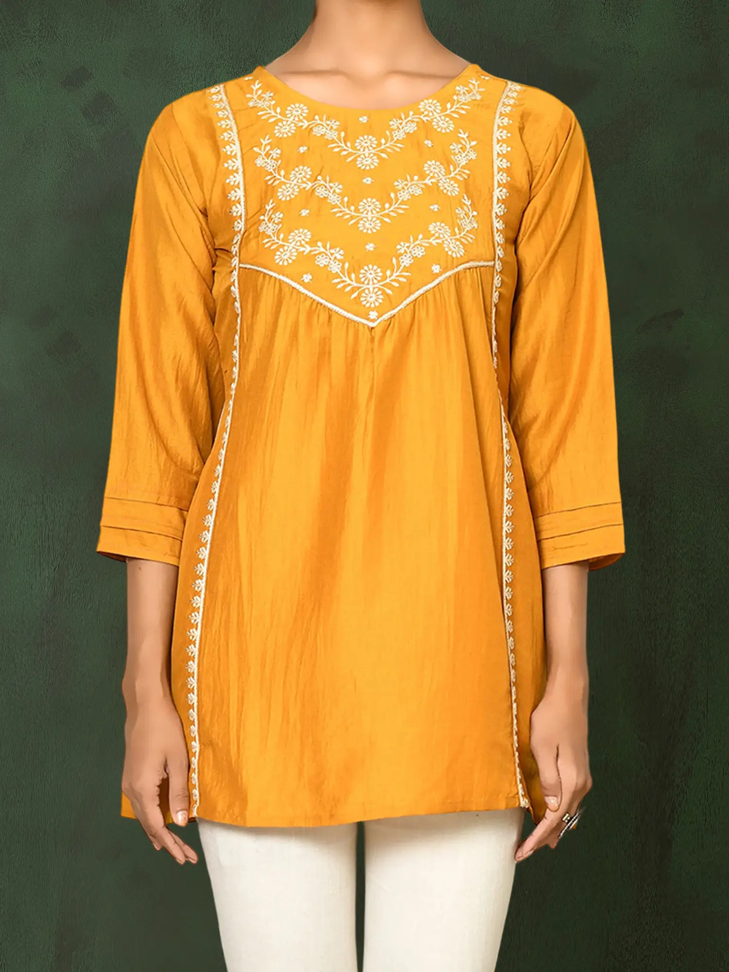 Butterscotch Viscose Blend Embroidered And Casual Ethnic Motifs Round Neck Short Top