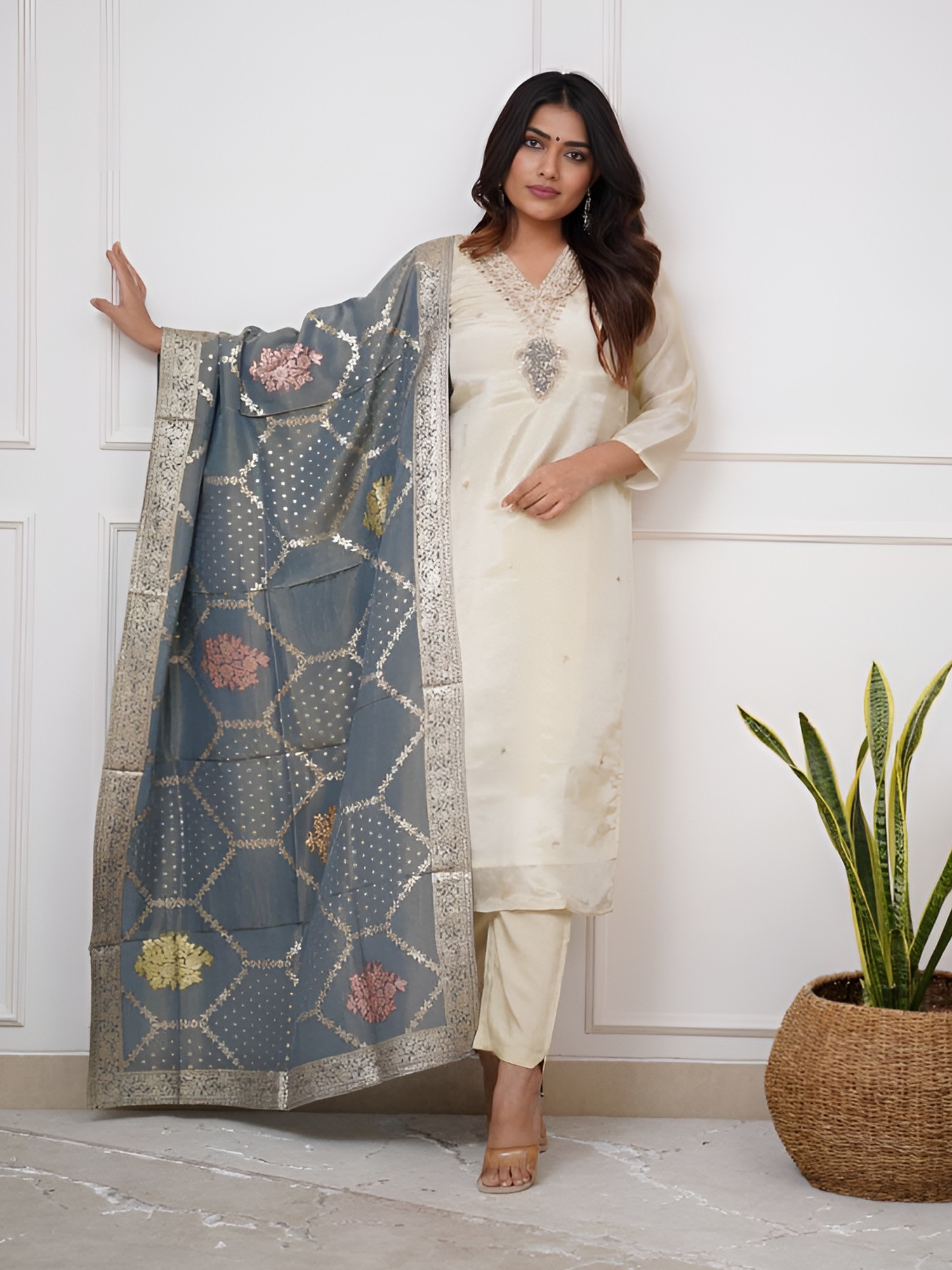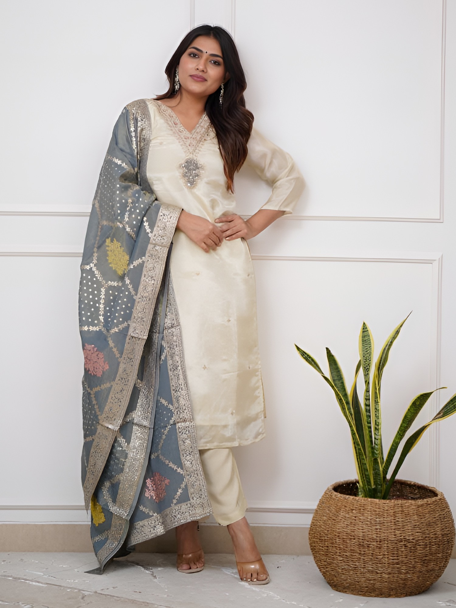 Designer Heavy Thread Embroidery And Sequins Work Chinon Palazzo Suit With Dupatta
