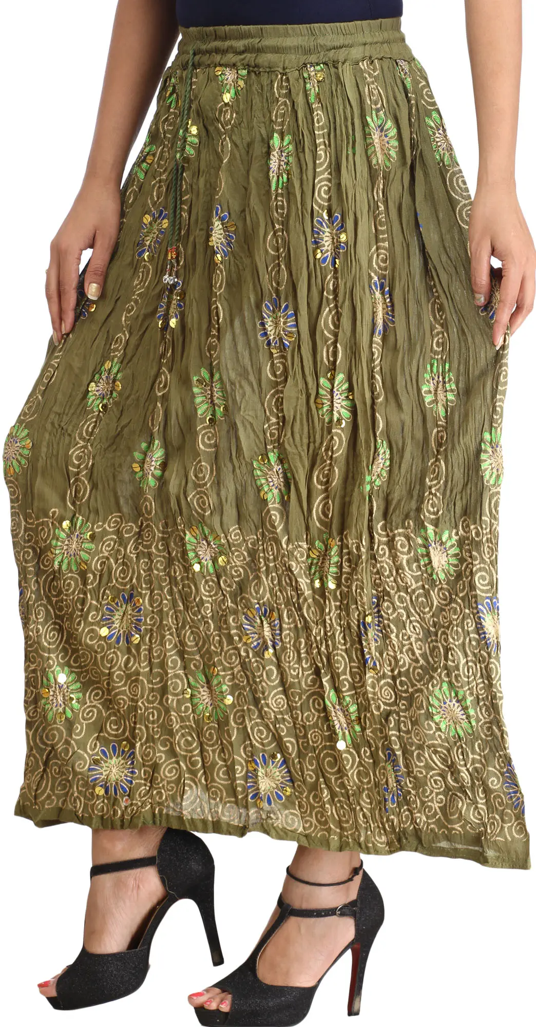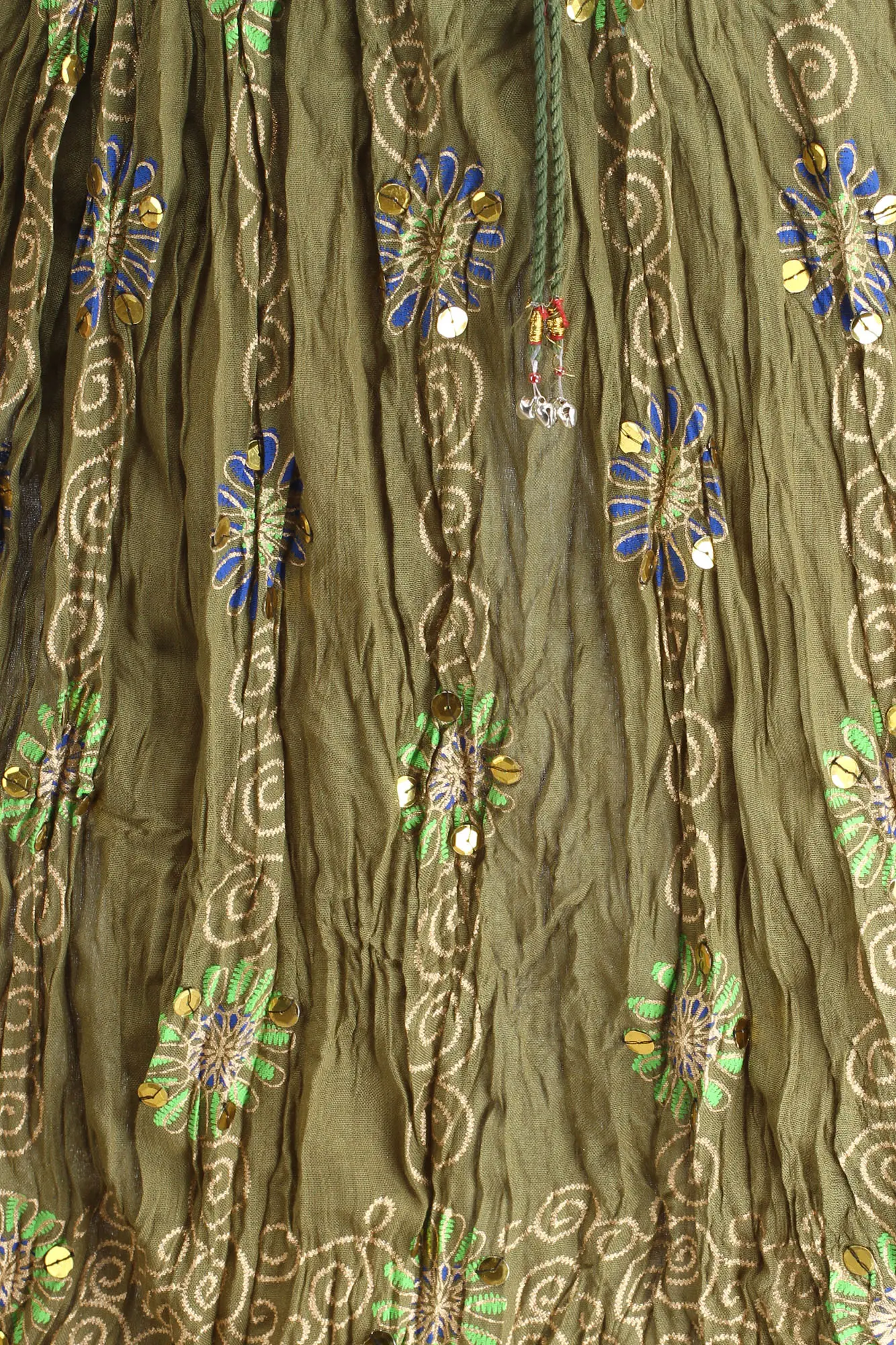 What sets this skirt apart is its meticulously detailed print. Delicate, golden spiral patterns intertwine with vibrant floral motifs in shades of green and blue. These embroidered flowers are further enhanced with tiny, shimmering sequins that catch the light, adding a touch of subtle glamour. The overall effect is one of artisanal craftsmanship, reminiscent of bohemian artistry and free-spirited fashion. The crinkled texture of the fabric adds depth and visual interest, enhancing the skirt's unique character. A delicate drawstring at the waist, complete with charming bead accents, allows for an adjustable and comfortable fit, ensuring you feel as good as you look.