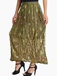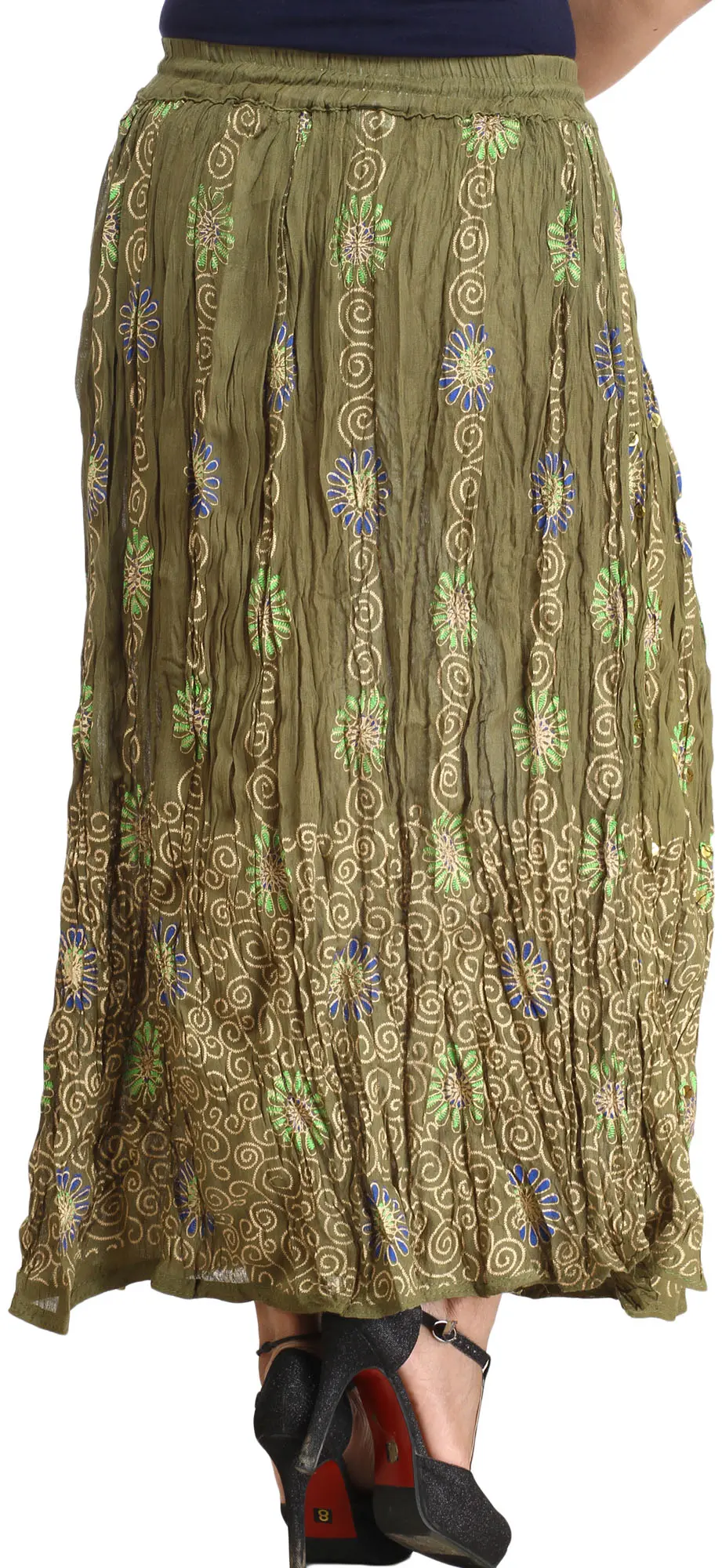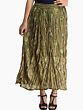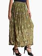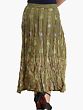 Discover a unique blend of comfort and style with this exquisite long skirt. Crafted from soft, breathable rayon, it drapes beautifully, offering a flattering silhouette for any occasion. The captivating olive-green hue serves as a perfect canvas for the intricate design that adorns its surface, making it a truly eye-catching piece.