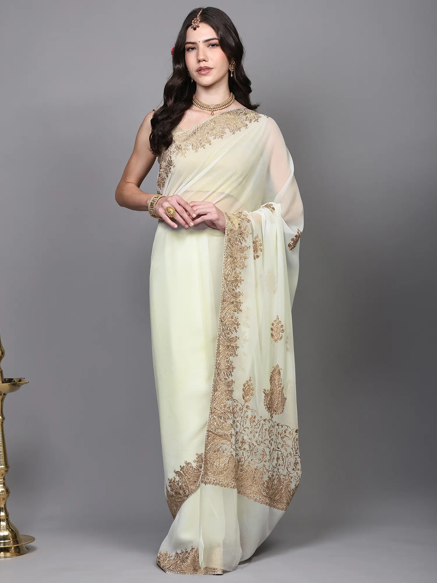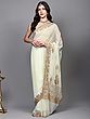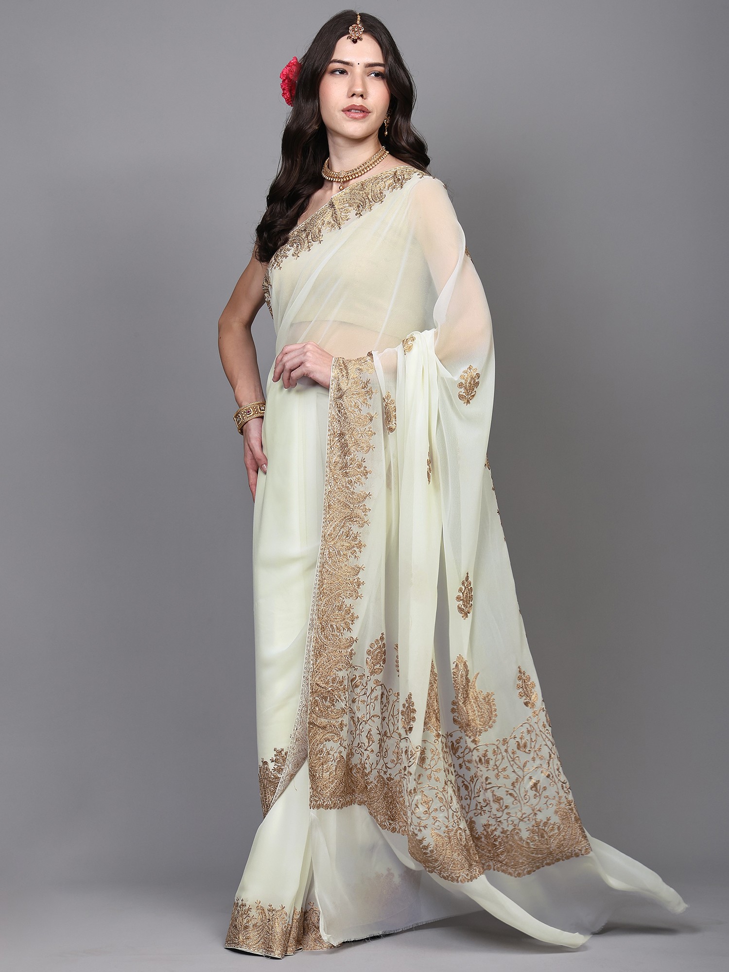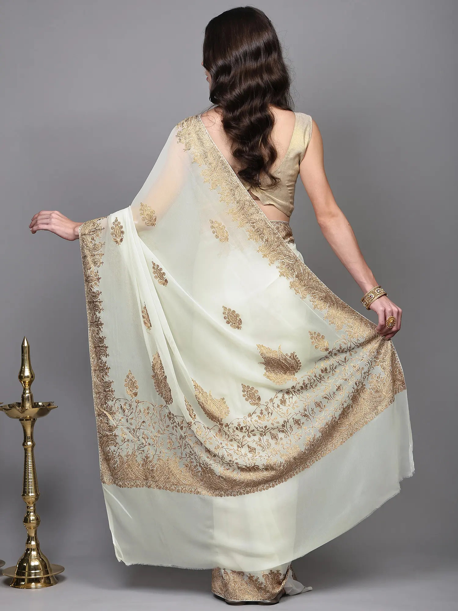 Lucent-White Georgette Saree with Aari Embroidered Floral Motifs from Kashmir