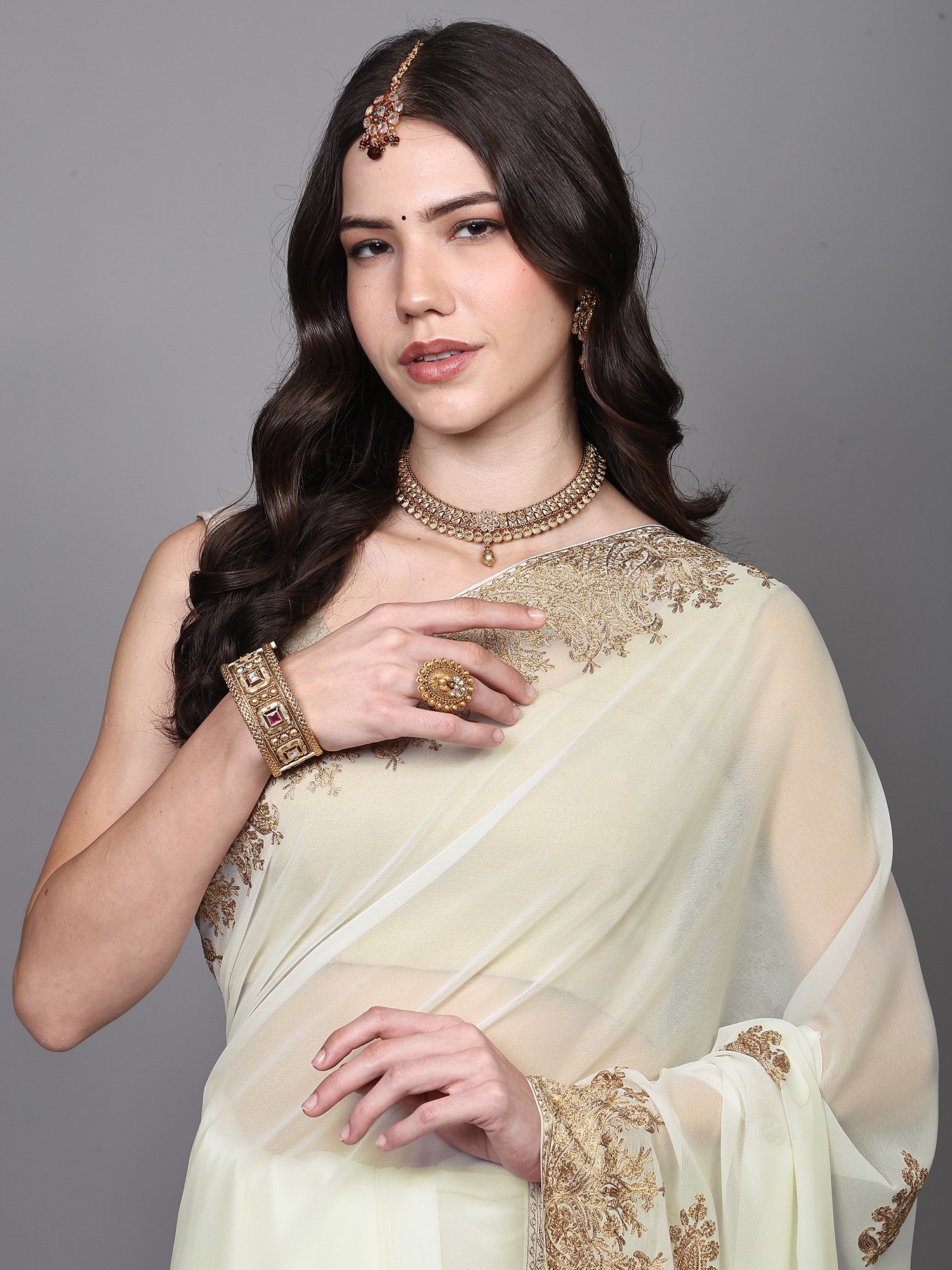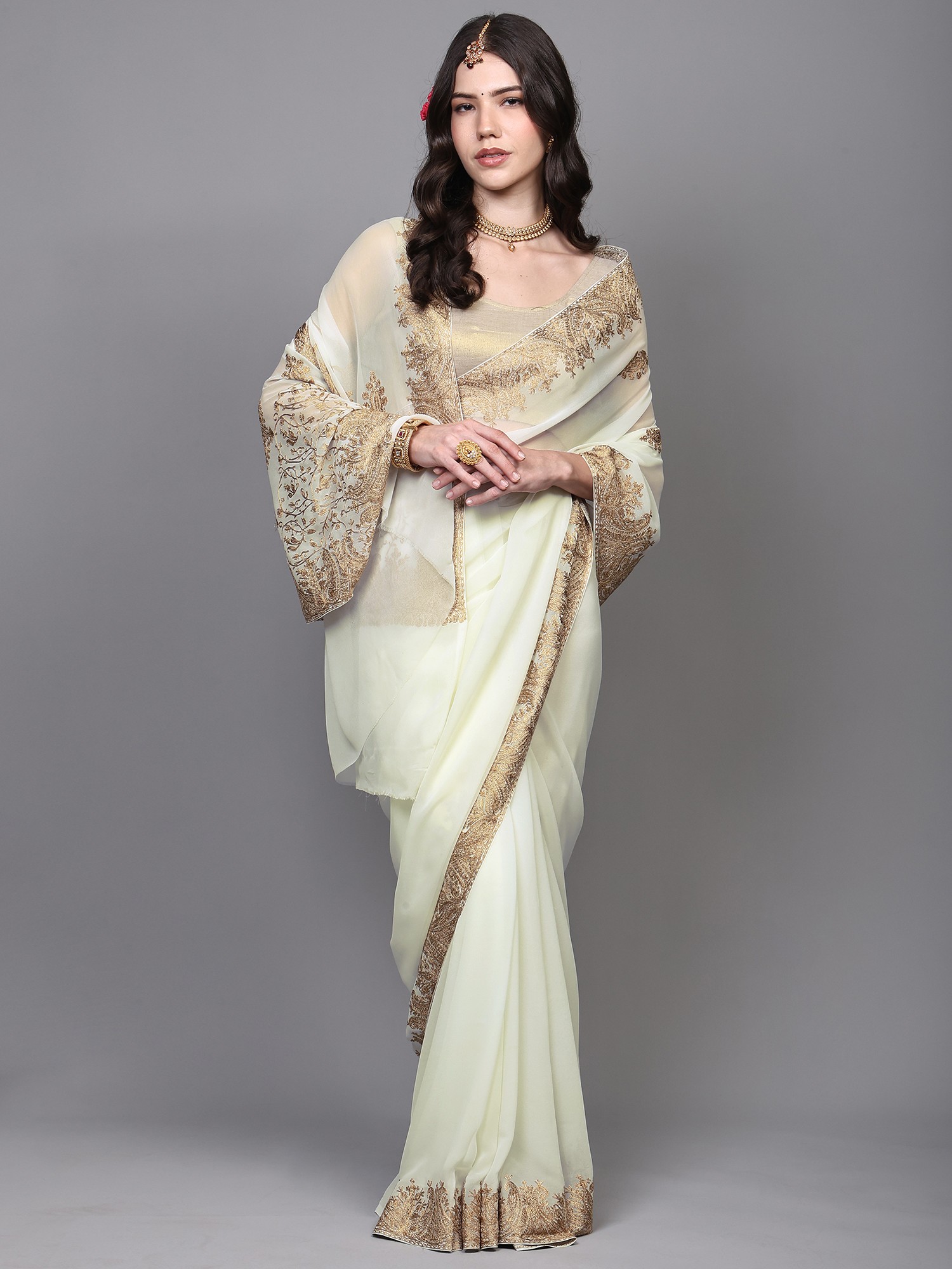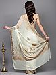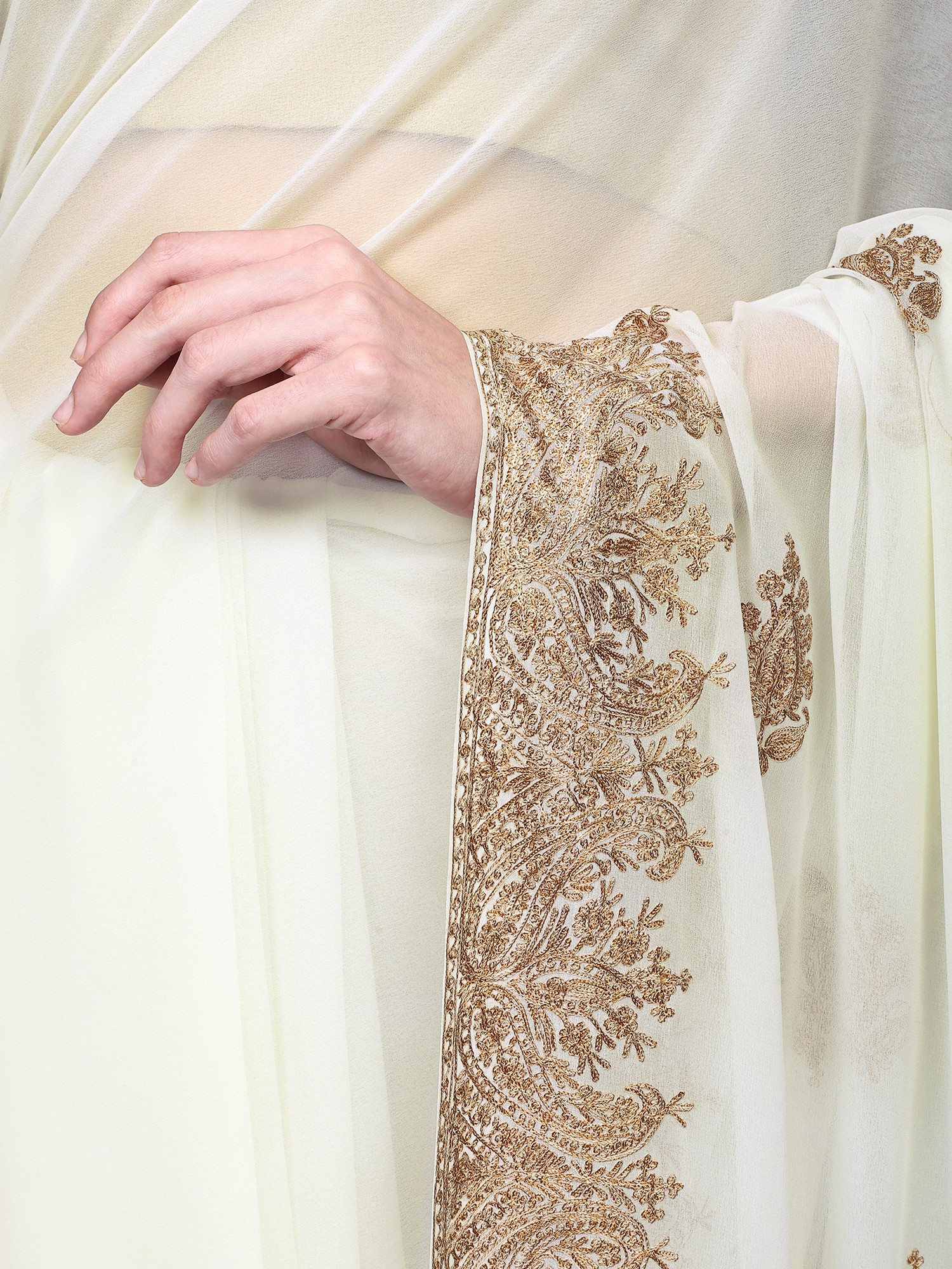 Lucent-White Georgette Saree with Aari Embroidered Floral Motifs from Kashmir