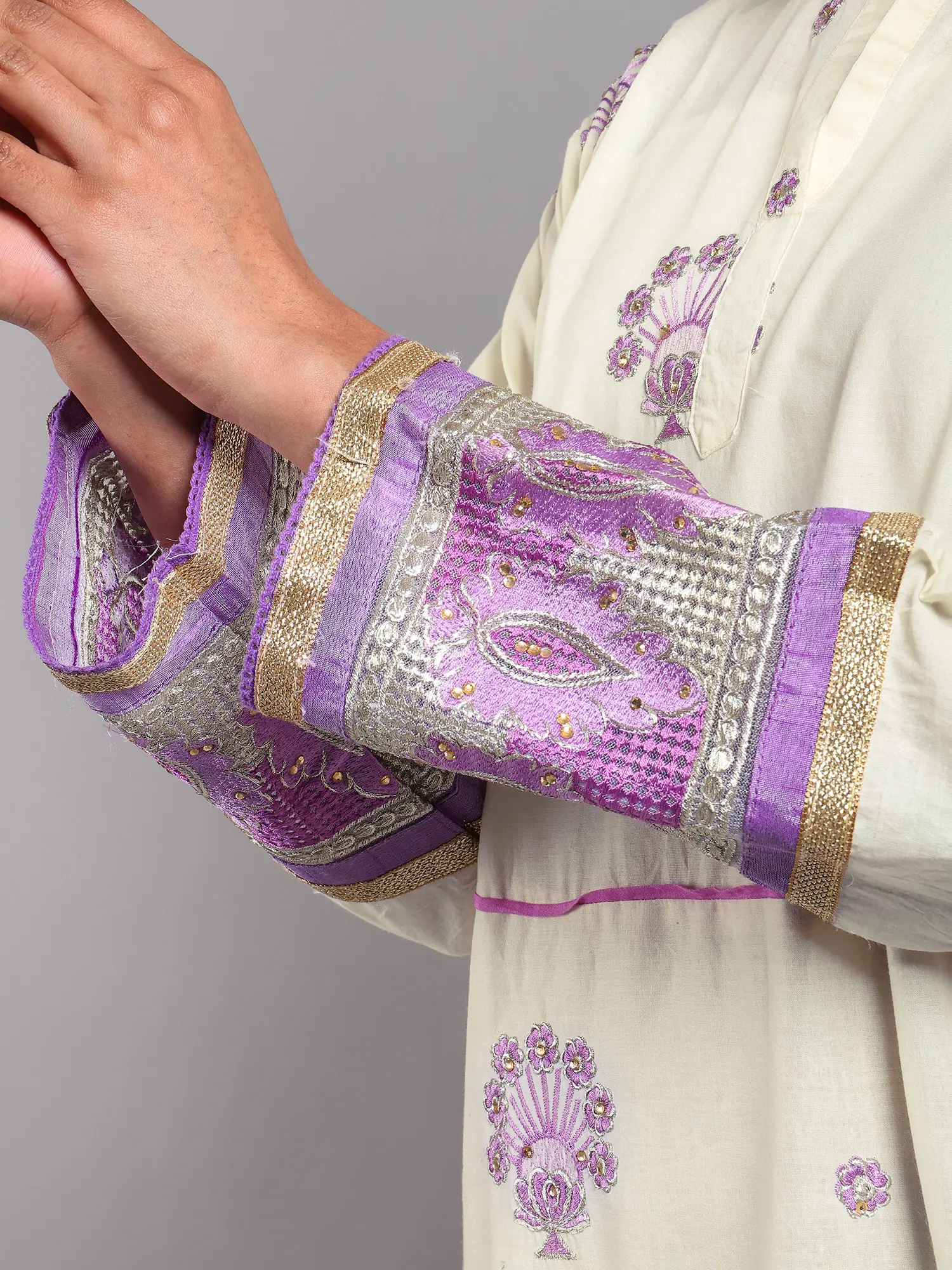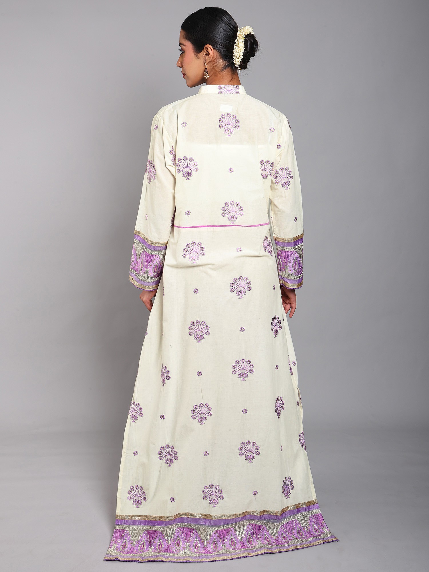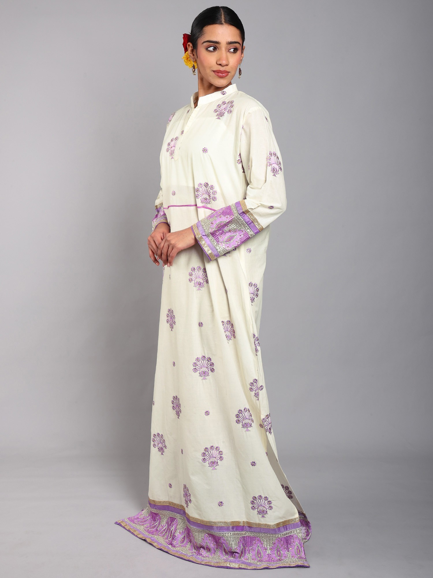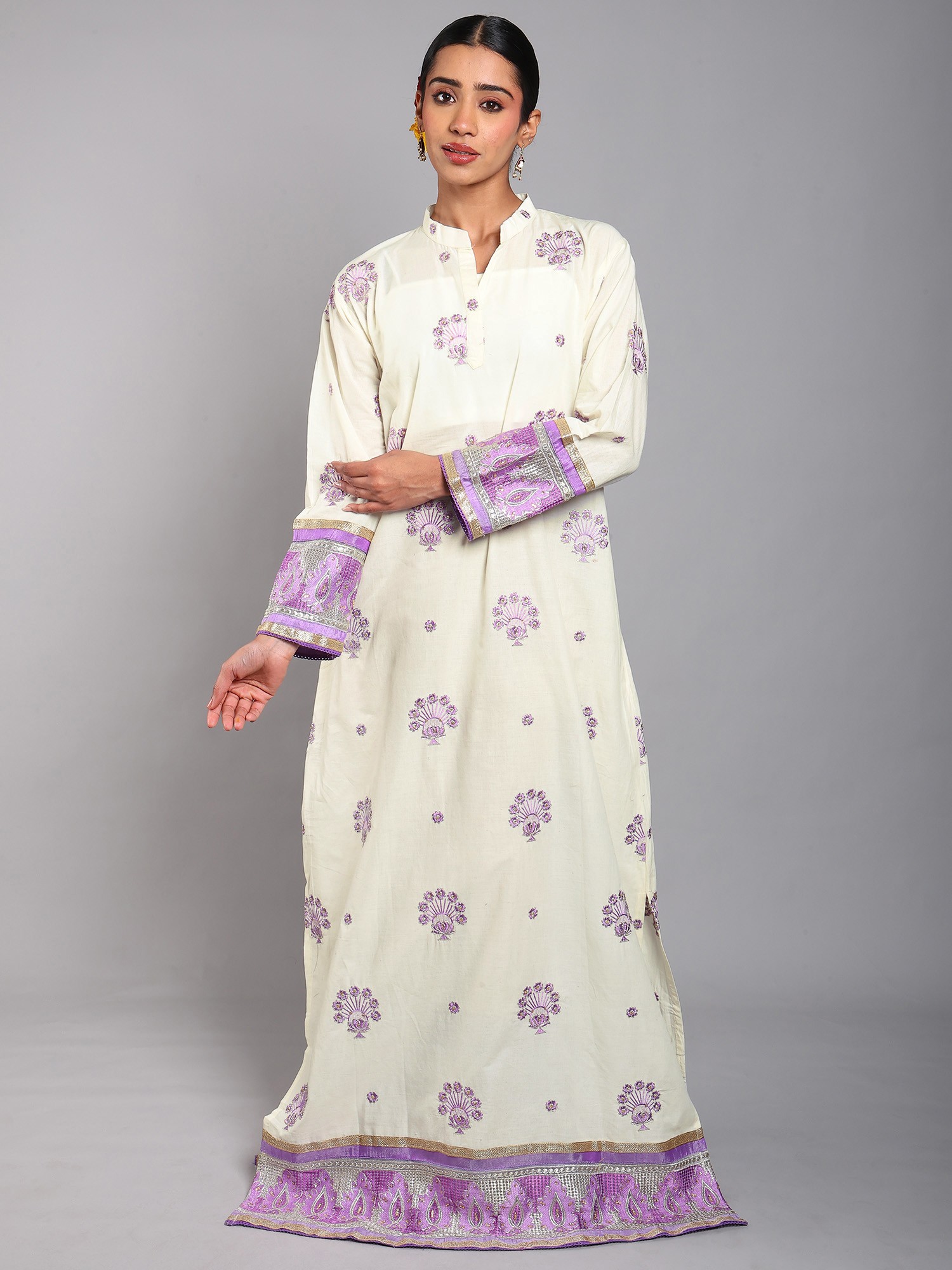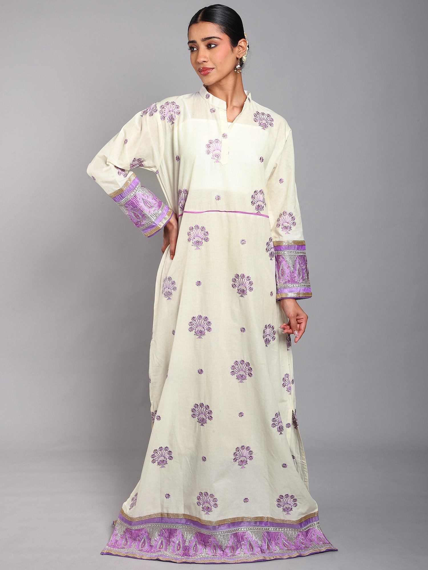 Cannoli-Cream Phiran from Kashmir with Multi Thread Embroidery on Neck and Floral Stripes