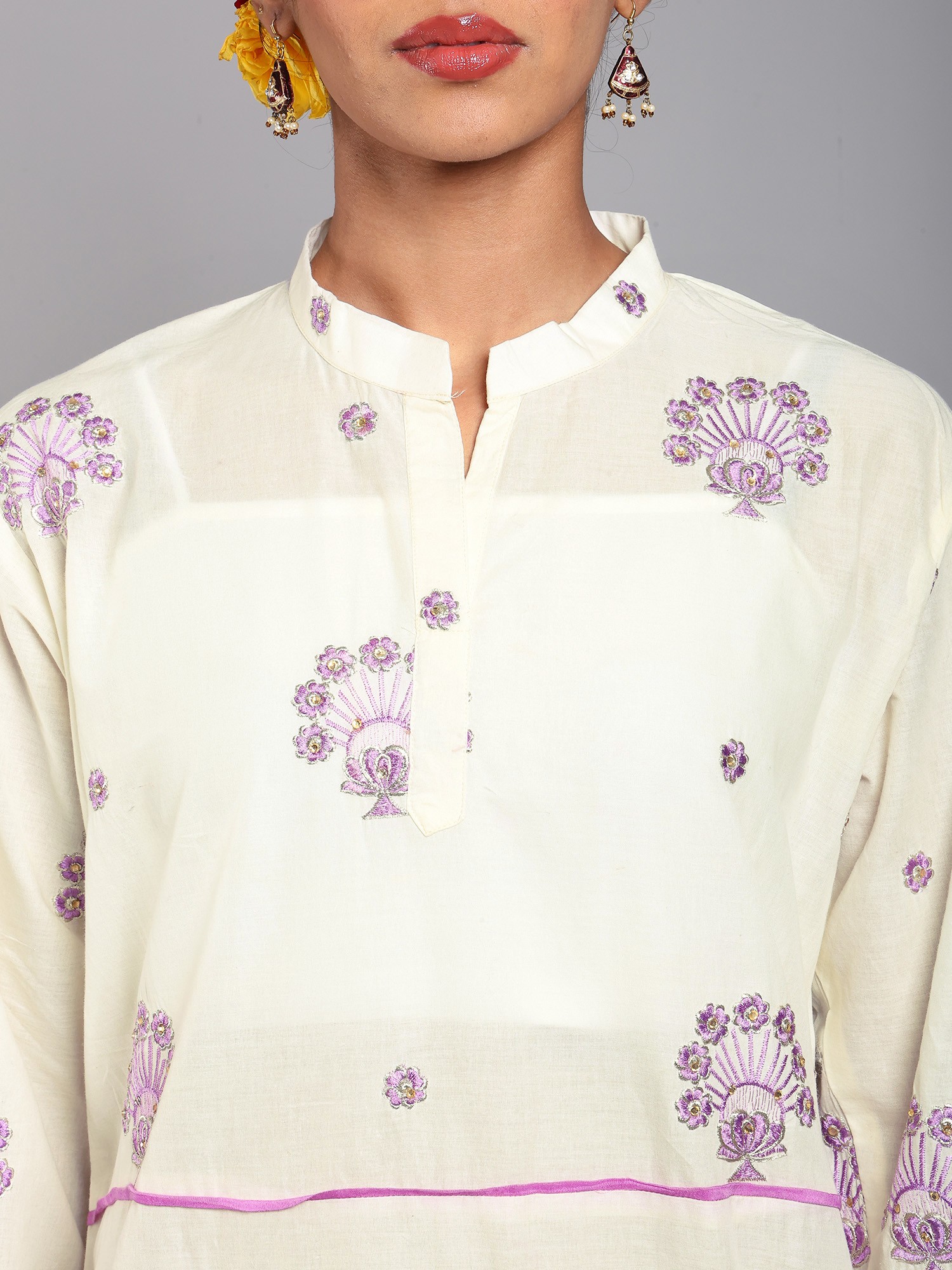 This piece is a celebration of traditional artistry and contemporary design, crafted for the woman who appreciates timeless elegance with a touch of modern flair. Imagine yourself draped in the soft embrace of pure cotton, a fabric known for its breathability and gentle feel against the skin. The subtle, creamy hue provides a blank canvas upon which intricate details come alive.