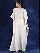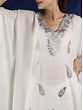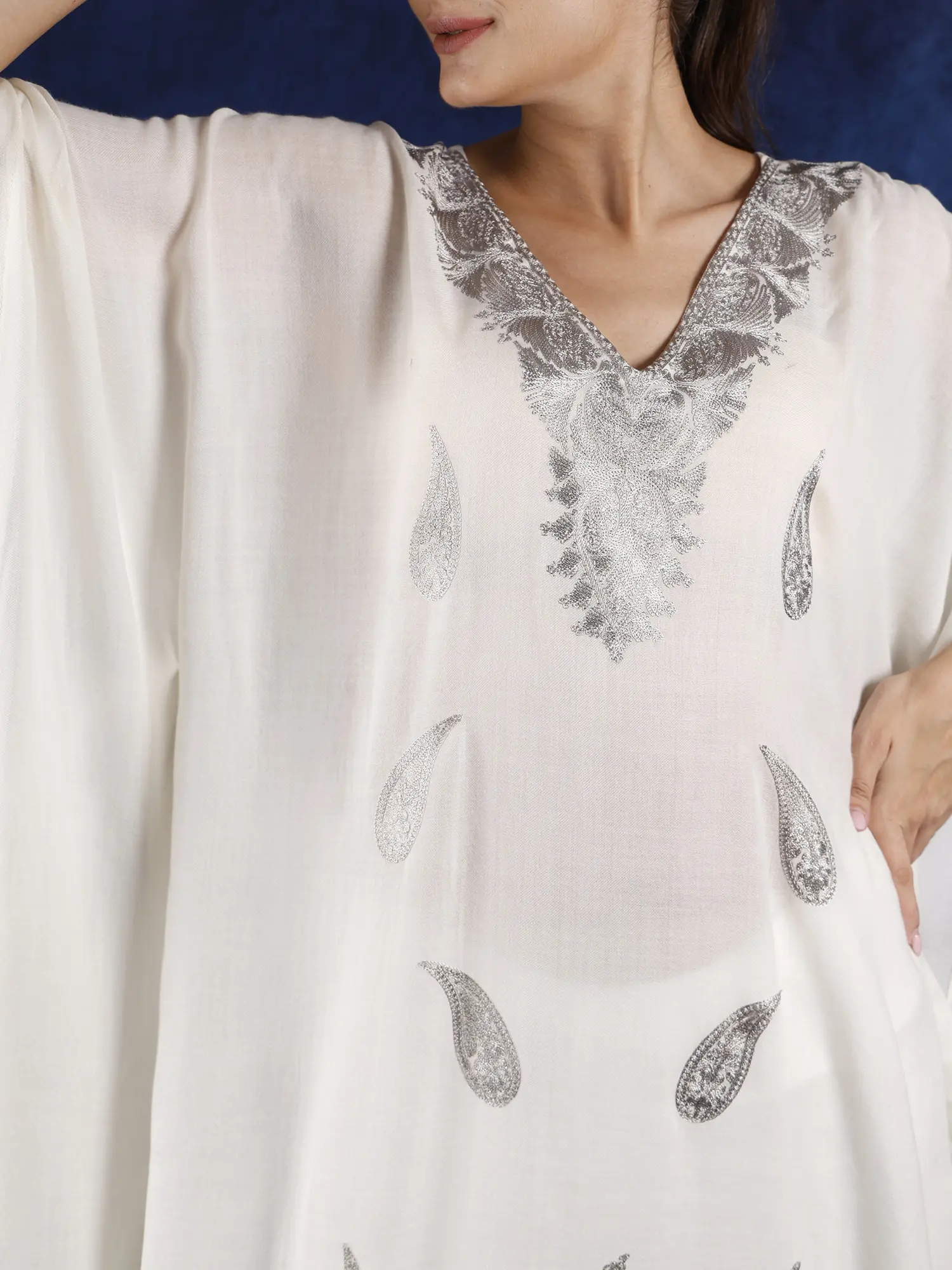 This Cannoli-Cream Pure Wool Long Kaftan from Kashmir, adorned with intricate paisley motifs in Aari embroidery, offers exceptional comfort and warmth.