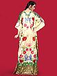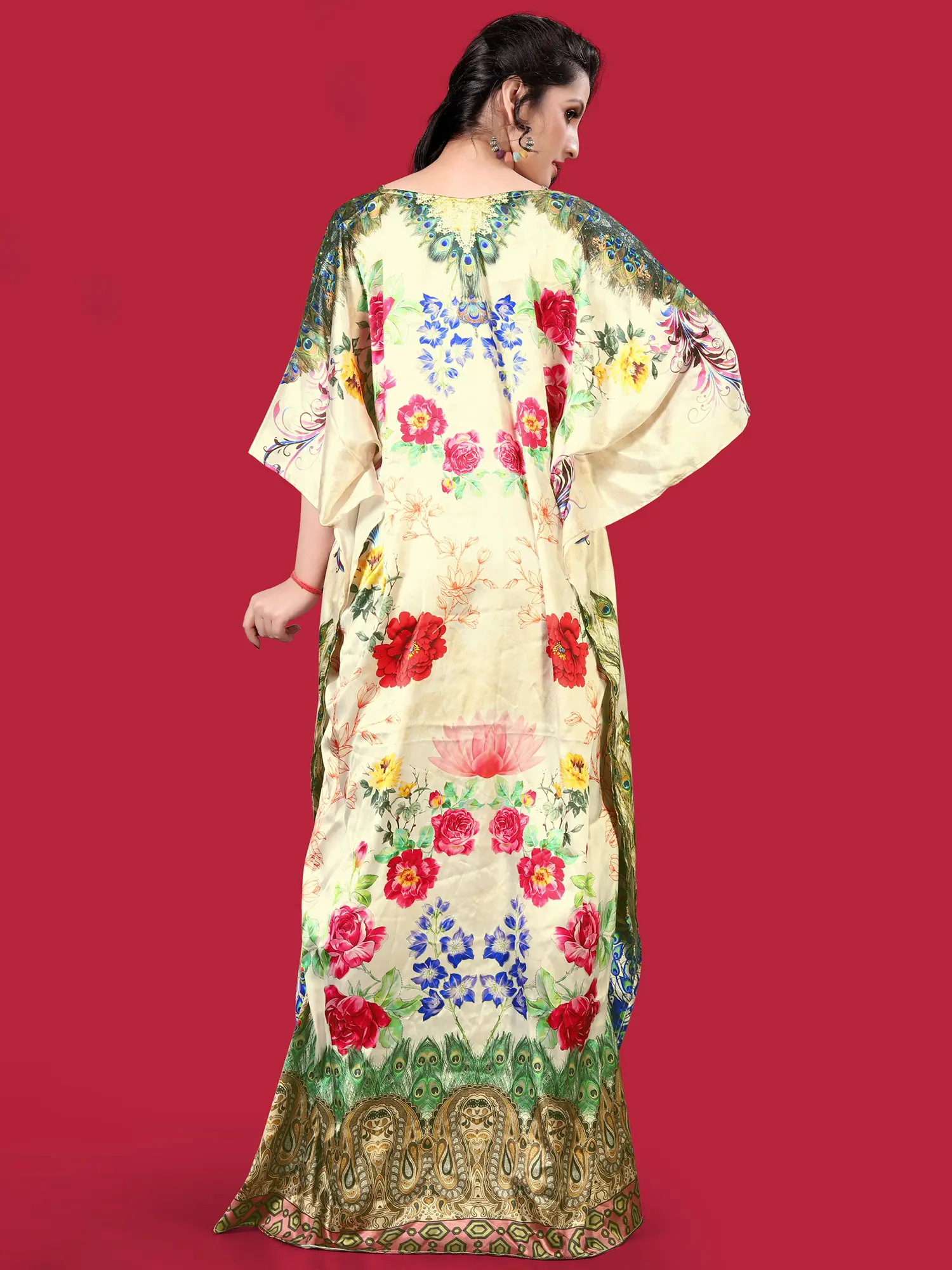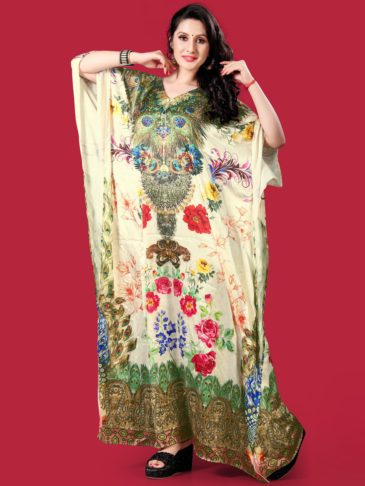A captivating blend of printed flowers and peacock feathers adorns this kaftan, creating a rich and vibrant visual experience. The intricate details of the peacock feathers, with their mesmerizing eye-like patterns, add a touch of exotic charm. Nestled among the feathers are a bouquet of colorful flowers, bringing a refreshing and feminine touch to the overall design. Subtle stonework embellishments add just the right amount of sparkle and texture, making this kaftan truly unique. The artwork is cleverly designed across the entirety of the dress, giving a visually stunning look.