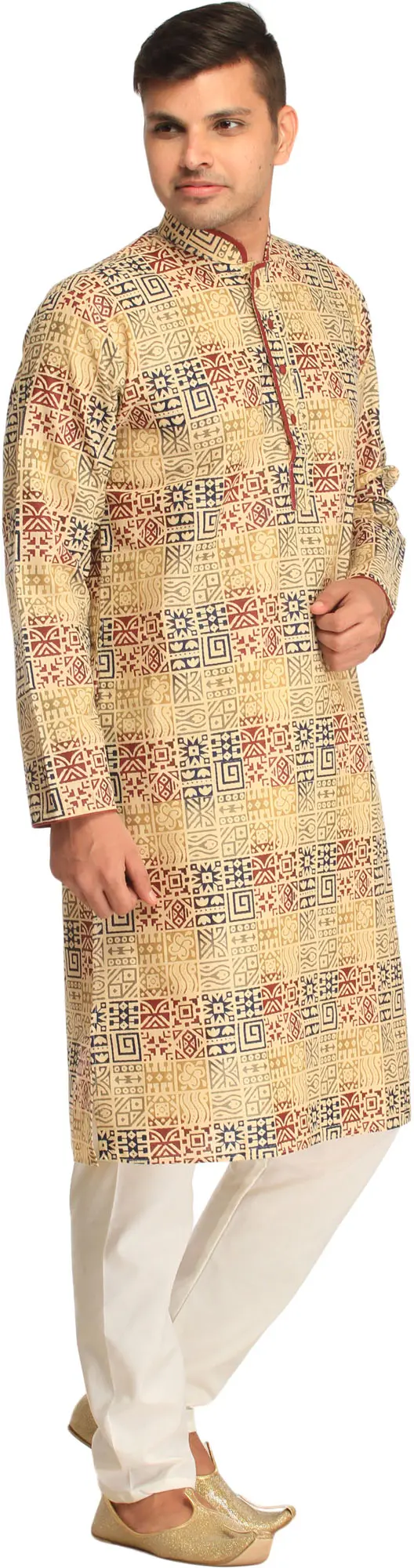 Crafted from pure cotton, this ensemble ensures a breathable and relaxed wearing experience. Its enchanting feature is the “Hieroglyphic Print” (Writing System of Ancient Egypt), adding a touch of artistry to the attire. Perfect for both casual and semi-formal occasions, this outfit strikes a balance between traditional elegance and contemporary flair. The “Kurta” boasts a classic design with a “Mandarin Collar” and “Button-Down Front”, while the Pajama offers a comfortable fit. This set is a tribute to the traditional craftsmanship, making it a cherished addition to any wardrobe.