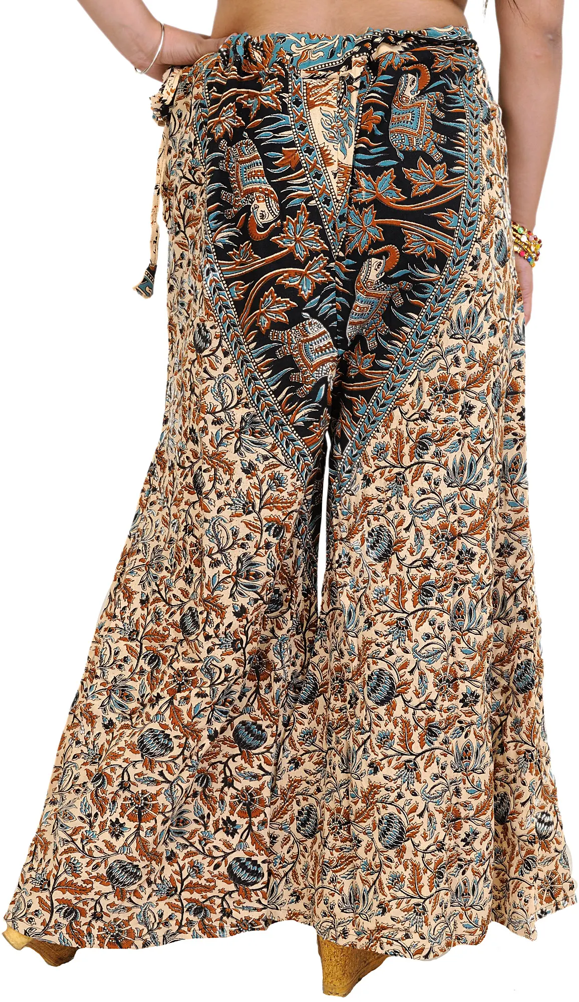 Make a statement of effortless style with these casual palazzo pants from Pilkhuwa, Uttar Pradesh. Pure cotton is used in tailoring these comfy, casual wear, adorned with ethnic Indian motifs such as elephants, peacocks, and flower vines all over, to give your loungewear wardrobe a touch of classic Indian charm.