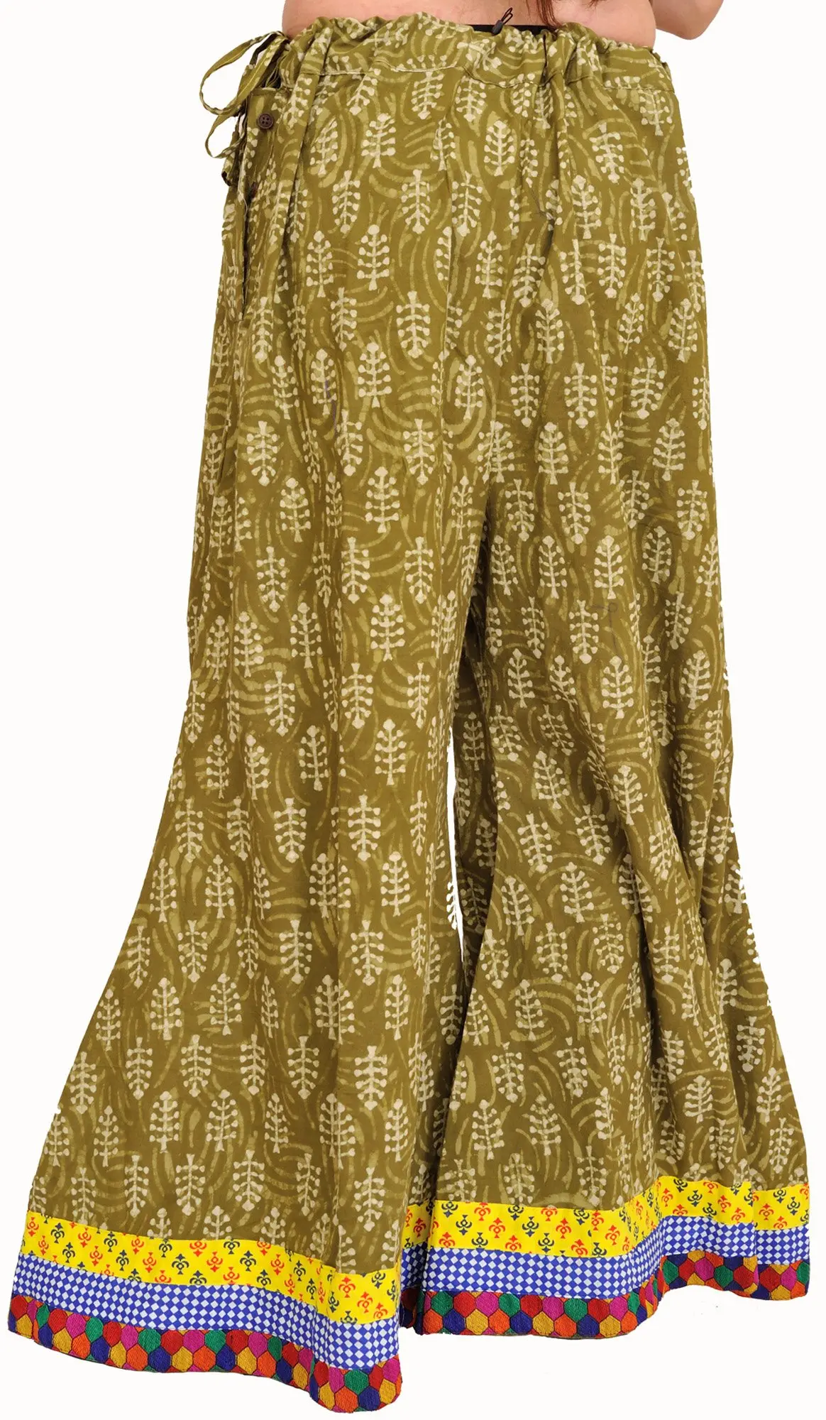 The true magic of these palazzo pants lies in their beautifully designed patch border. This vibrant addition showcases a lively interplay of colors and patterns, creating a striking contrast with the main fabric. Featuring a band of sunny yellow, a border of intricate blue and white geometric motifs, and a final hem adorned with a mosaic of colorful diamond shapes, this border is a celebration of festive and joyful design. Each element is carefully placed, drawing the eye and elevating the overall aesthetic of the garment. The wide leg silhouette ensures a graceful flow with every step, while the drawstring waist provides a customizable and comfortable fit, allowing for ease of movement and a flattering drape.