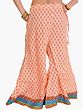 The cream base of these palazzo pants is adorned with a delicate and repeating printed leaf motif in a vibrant coral hue. This intricate pattern adds a touch of subtle elegance and a hint of bohemian flair. Adding to the visual appeal is a beautifully designed patch border at the hem. This border is a celebration of color and pattern, featuring a captivating mix of geometric designs and bold hues, including shades of blue, green, orange, and gold, all working in harmony to create a truly eye-catching detail. This unique border elevates the pants from simple to statement, offering a delightful contrast that adds personality and character.