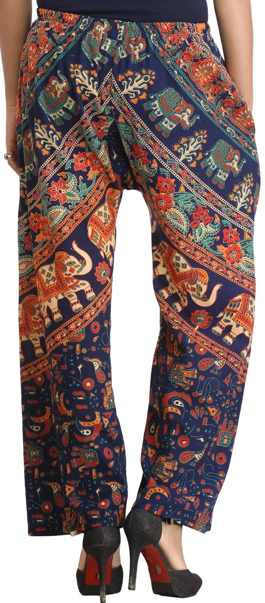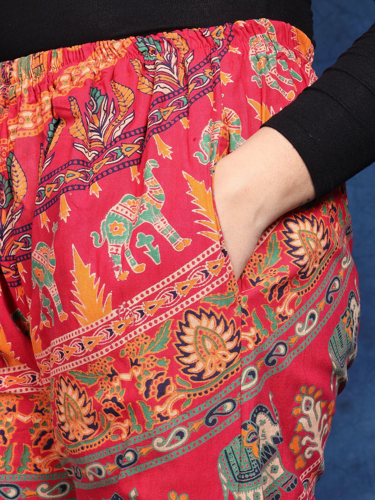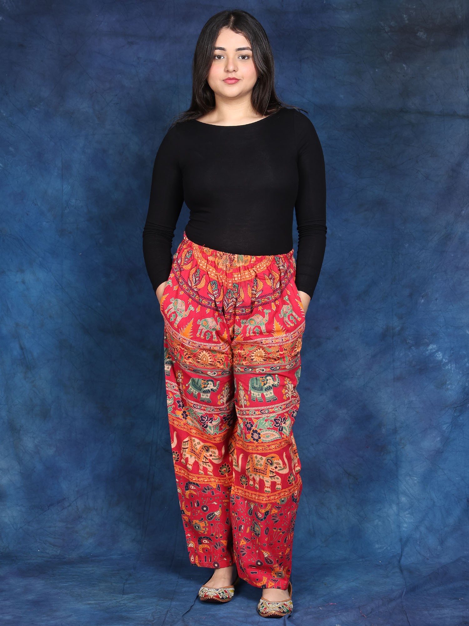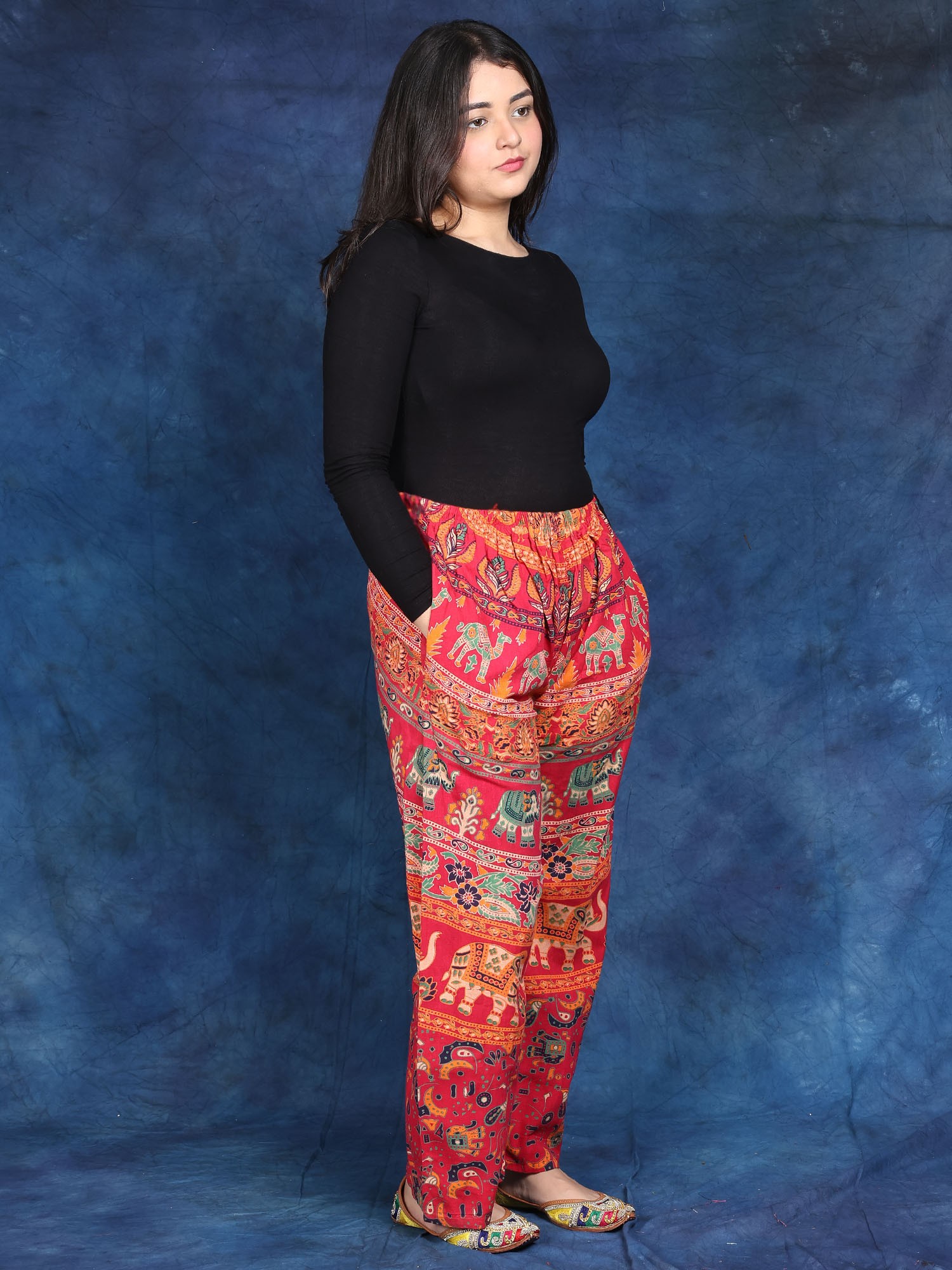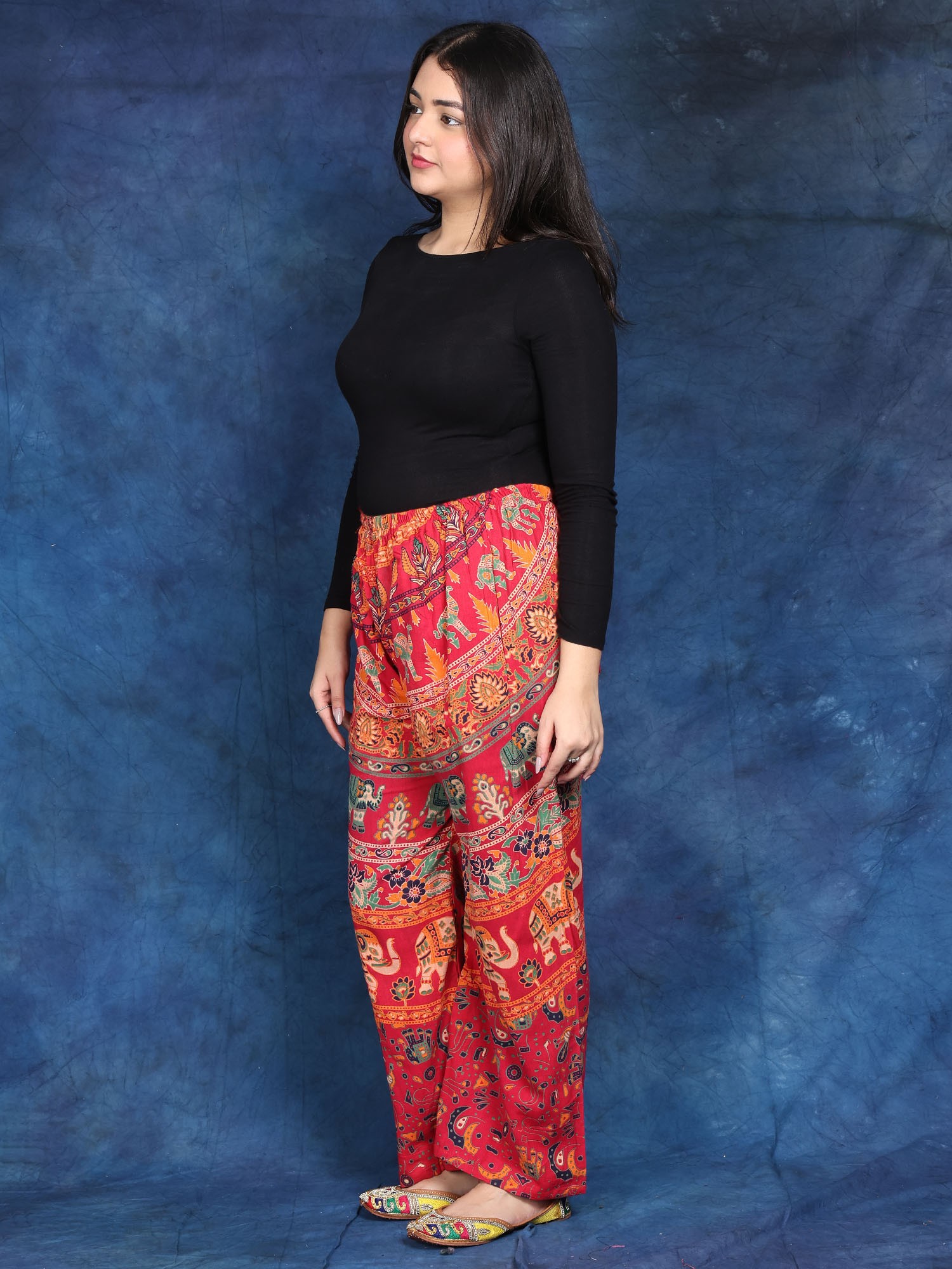 With its striking motifs, this casual Trouser from Pilkhuwa embodies luxury and comfort. This pant is made from pure cotton and coloured with natural vegetable dyes, making it the epitome of eco-conscious design. Enjoy the comforting sensation of a breathable cloth against your skin, which allows you to move freely with each step. Symbolizing grace and wisdom, the printed elephants add a touch of whimsy to your ensemble, inviting admiration and conversation. This outfit seamlessly integrates efficiency with cultural charm.