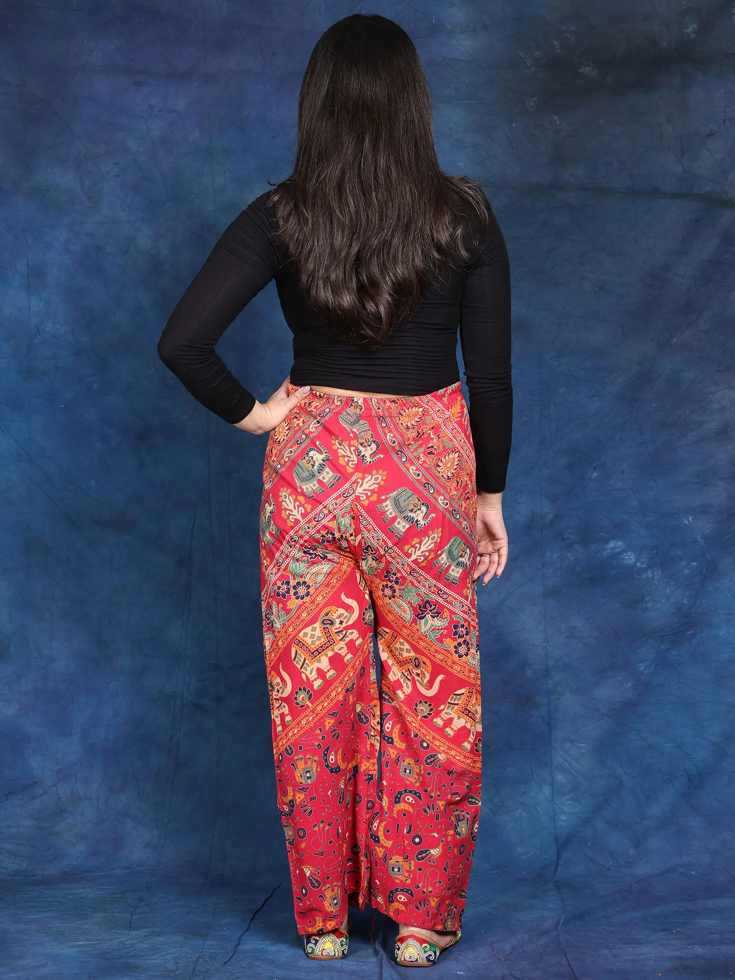 Step into a world of effortless style and unparalleled comfort with these beautifully crafted trousers. Designed for the free-spirited individual, these pants are a celebration of vibrant patterns and natural materials. The rich, eye-catching print features a charming procession of elephants, interspersed with intricate floral motifs and traditional designs, all rendered in a captivating palette of colors. This unique design is not just visually appealing; it carries a sense of cultural artistry, bringing a touch of global flair to your wardrobe.