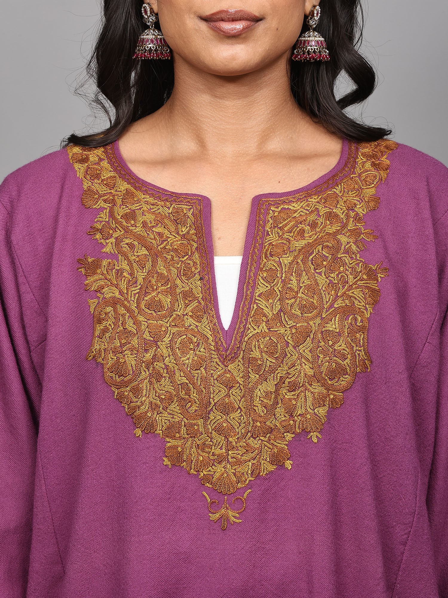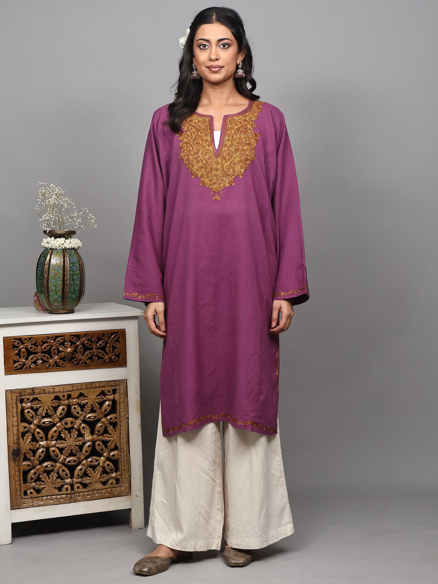 Discover the timeless charm of Kashmir woven into this exquisite pure wool phiran. Designed for the contemporary woman who appreciates heritage craftsmanship, this garment offers a luxurious feel and a silhouette that gracefully drapes. The rich, deep purple hue evokes a sense of regality, making it a perfect statement piece for any occasion. Whether you're attending a festive gathering or enjoying a quiet evening, this phiran promises both warmth and unparalleled style.