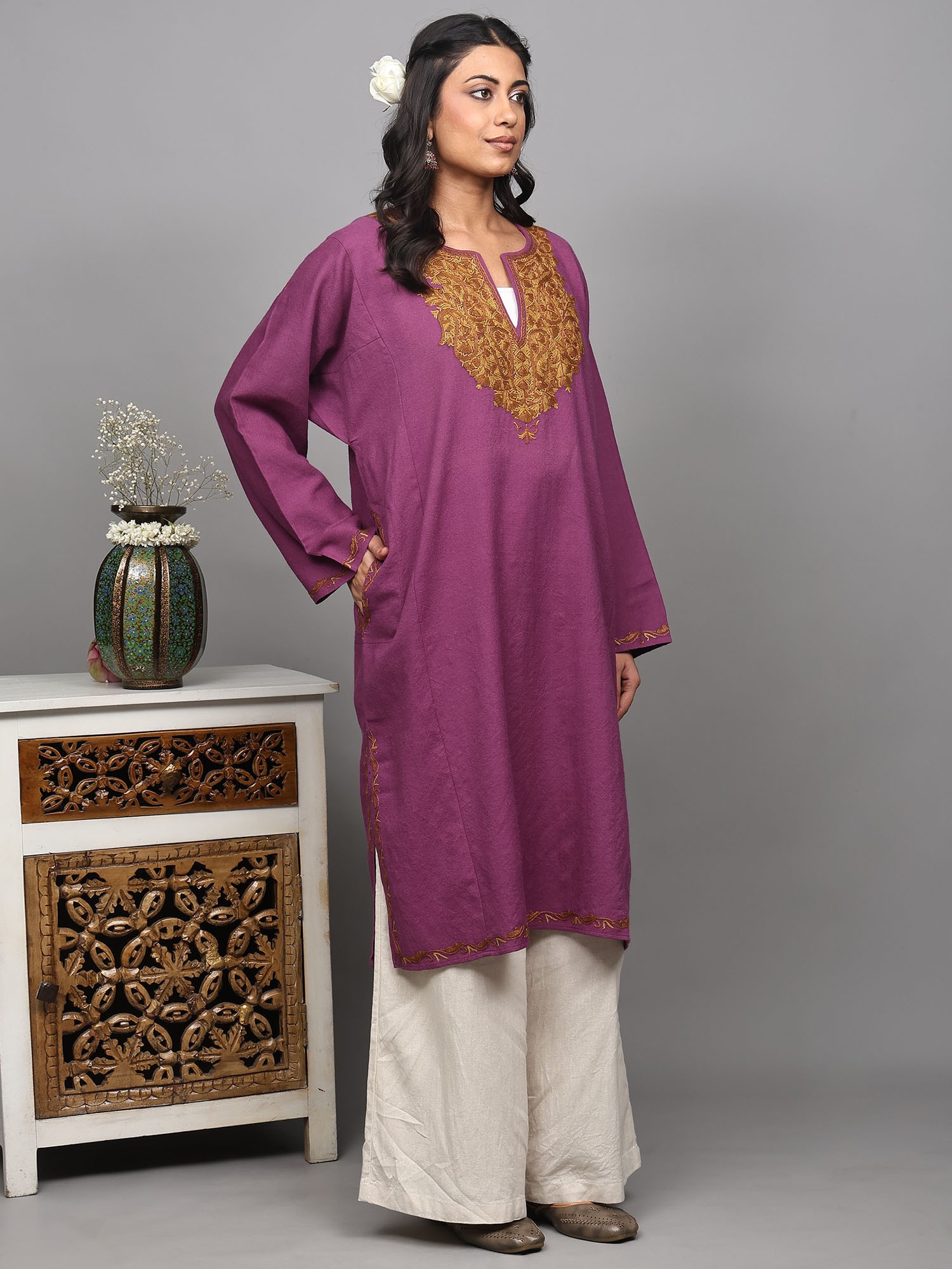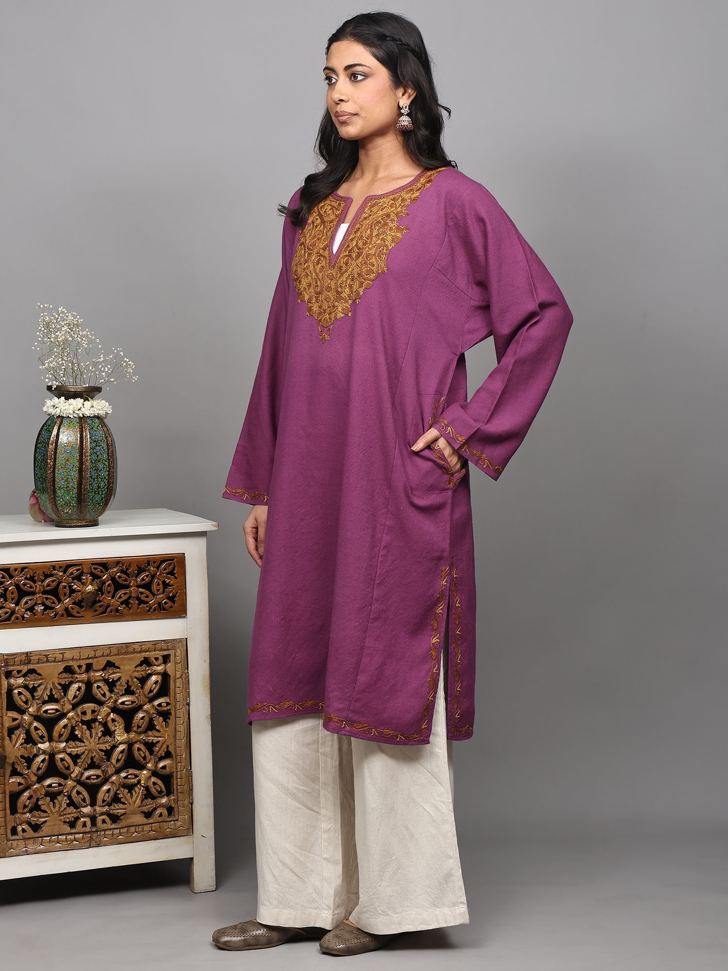 Wool Kashmiri Phiran with Aari Embroidered Paisleys on Neck and Side Pockets