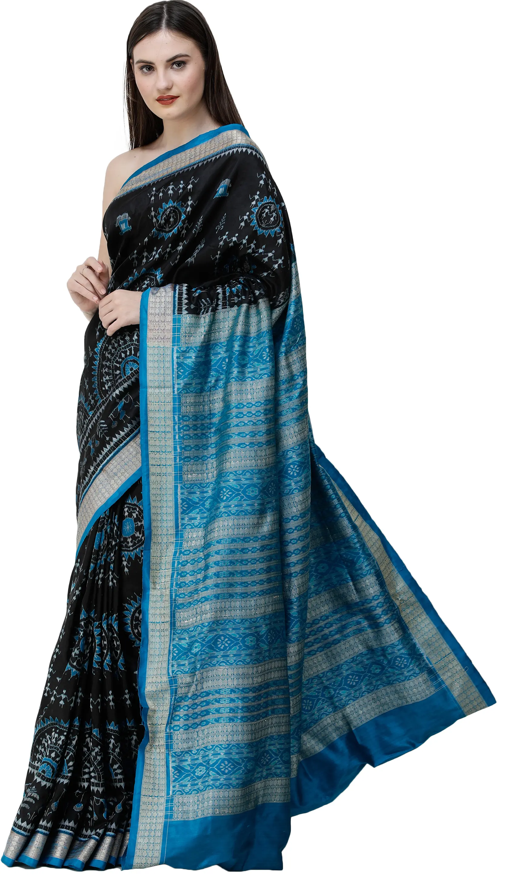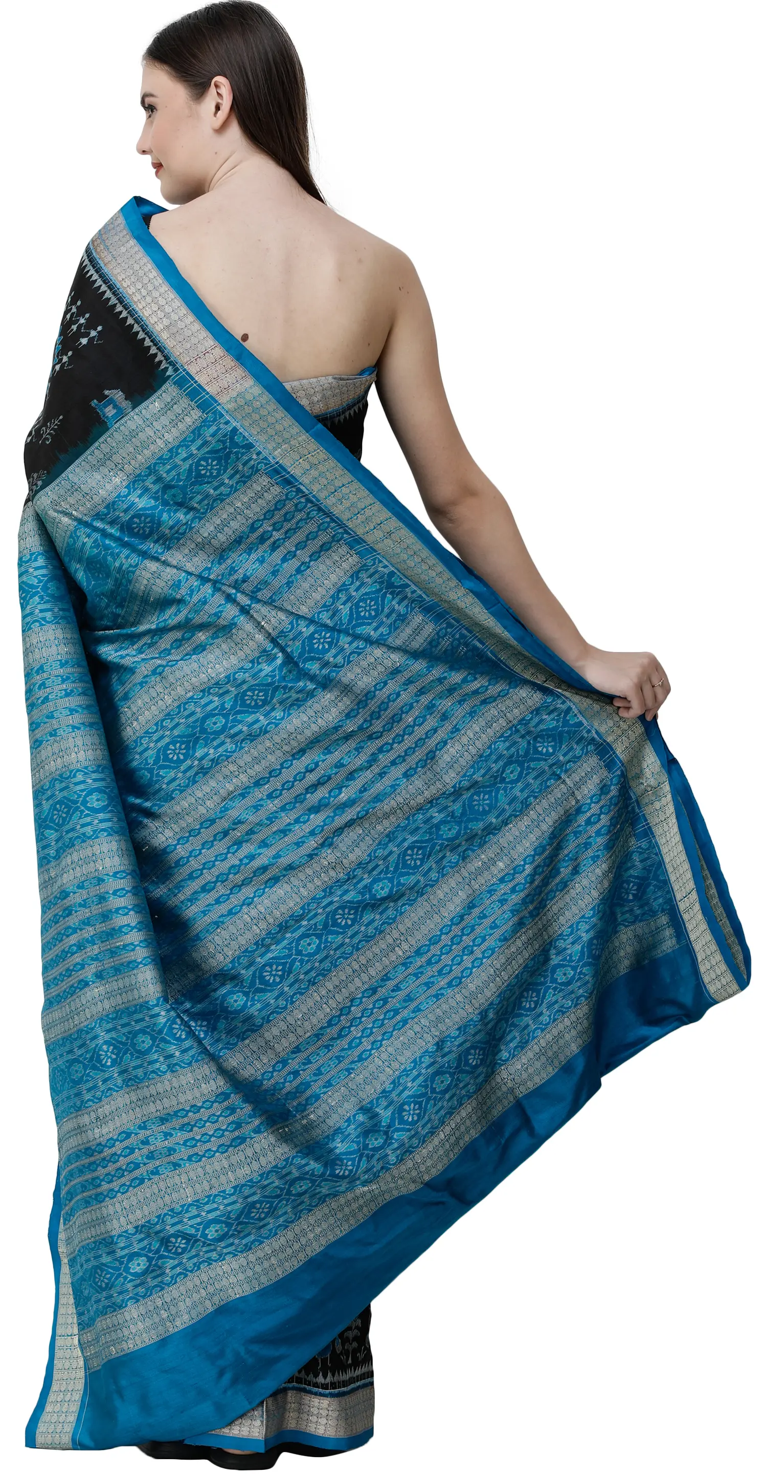 The Indian dusk colour palette of black and azure makes this a great evening saree. The black of the field is woven in with a plethora of warli-style figures, in tints of blue and white that match the colours of the endpiece. Warli is a style of folk art that belongs to the Southwest, but its minimalistic style and dynamism are replicated in regional fashion across the subcontinent, as could be seen here.