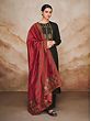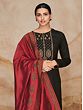 Strike a fashion choice with the Woven Dupatta and Zari-Embroidered Caviar-Black Palazzo Salwar-Kameez Suit. This group exudes a classic charm while remaining sophisticated. The delicate Zari embroidery adds to the overall attractiveness, and the caviar-black tone lends a sense of classic elegance.