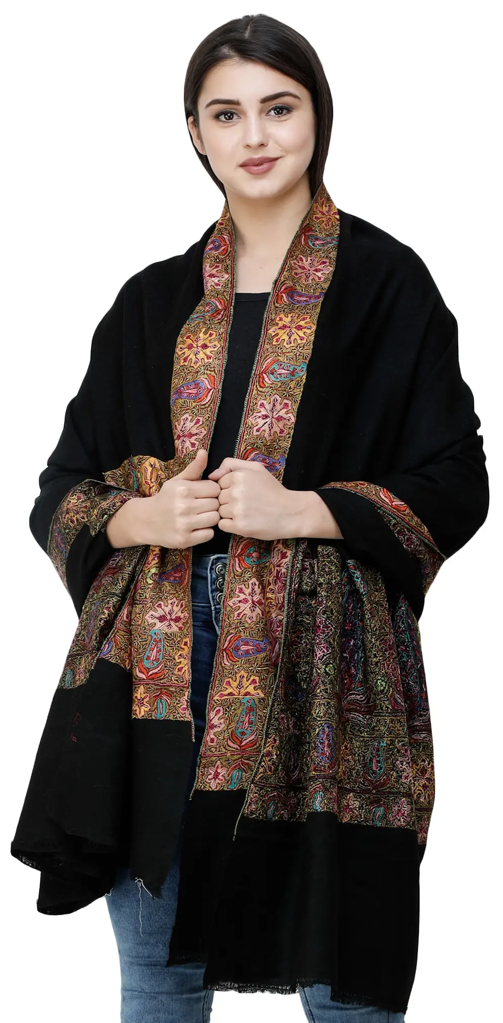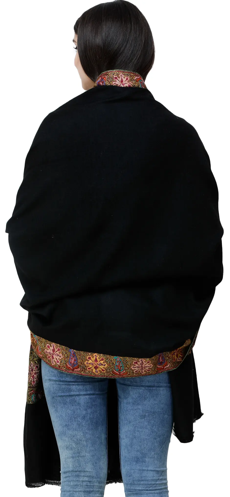 Pirate-Black Pure Wool Stole from Kashmir with Paisleys Aari Embroidery by Hand in Multicolor