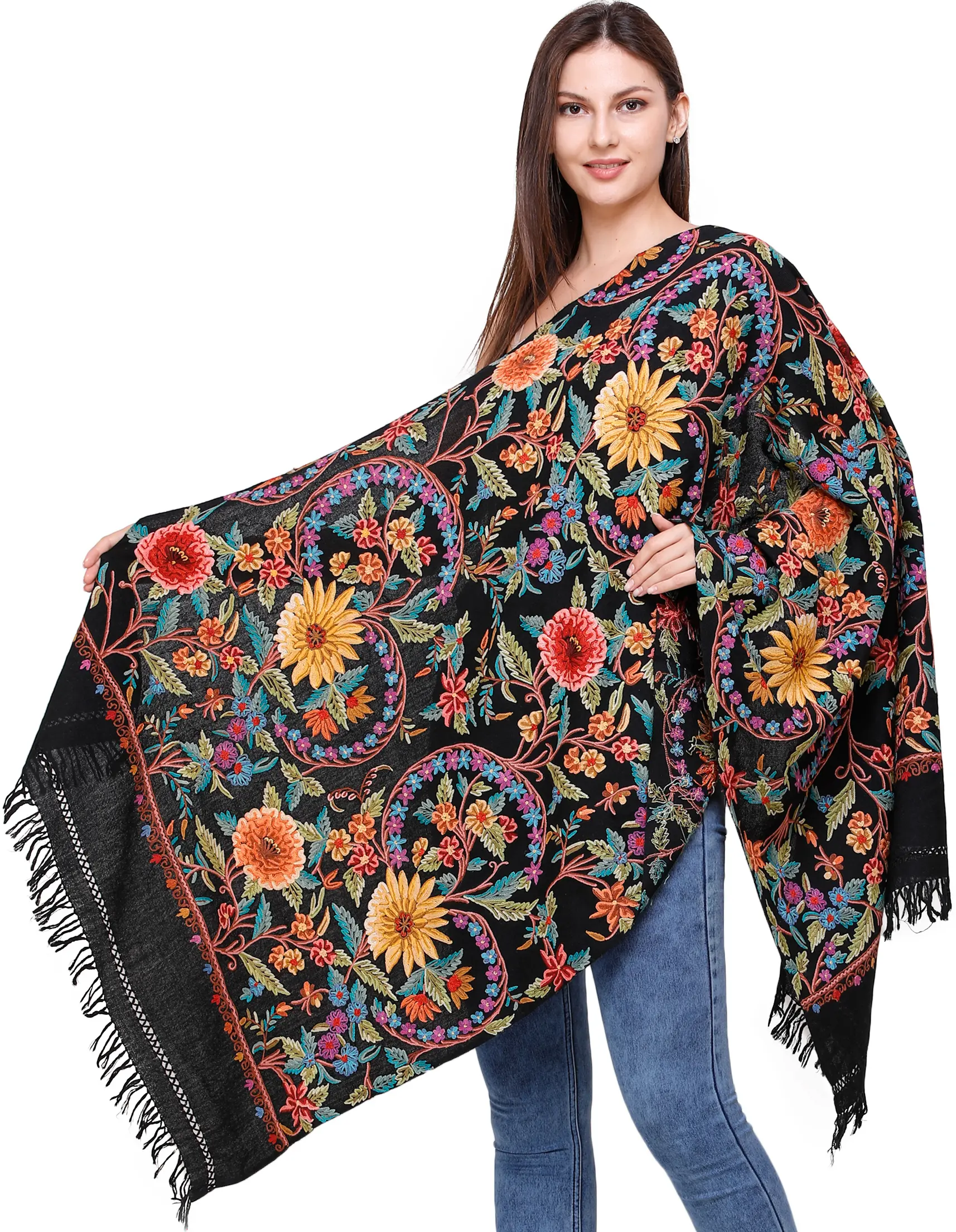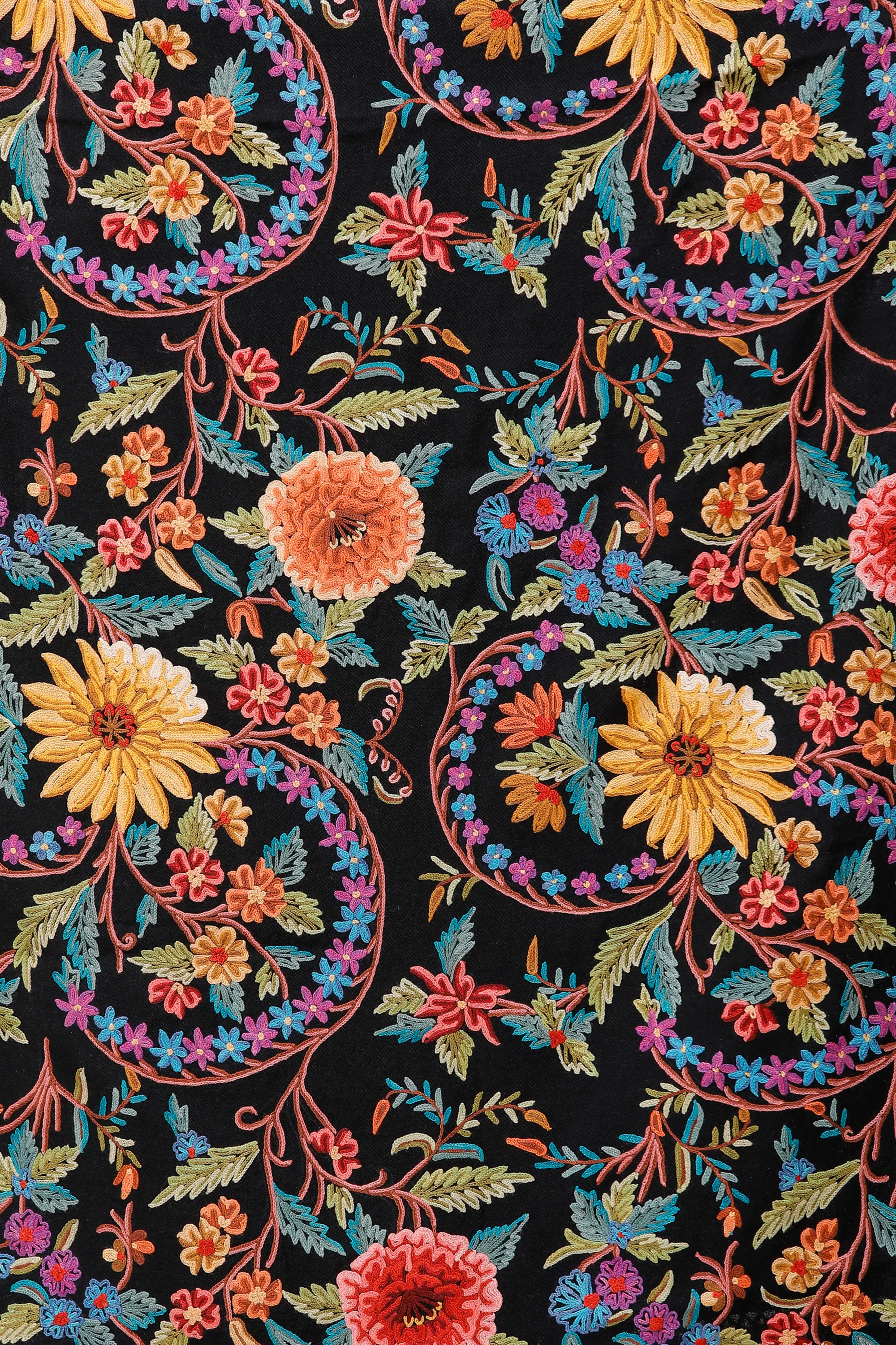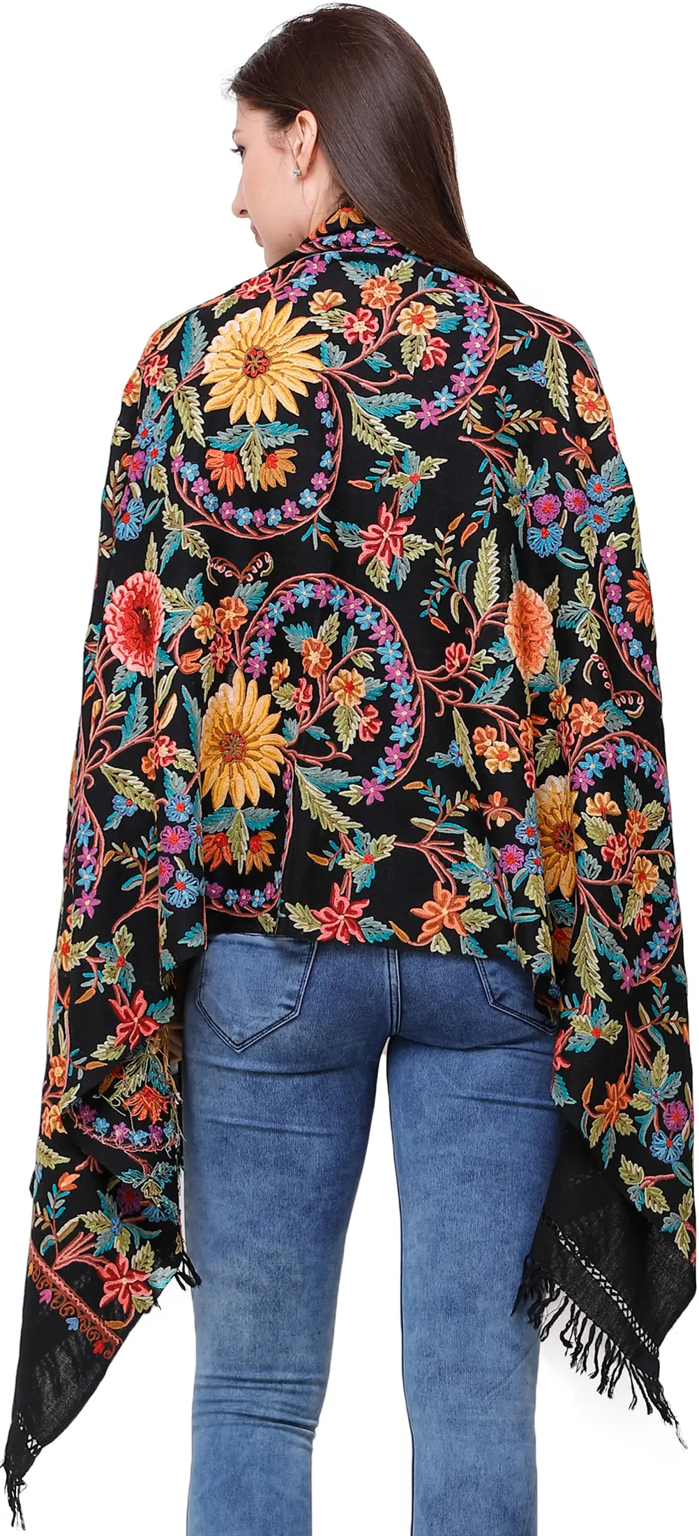 Caviar Black Stole from Kashmir with Aari Hand-Embroidered Flowers All-Over