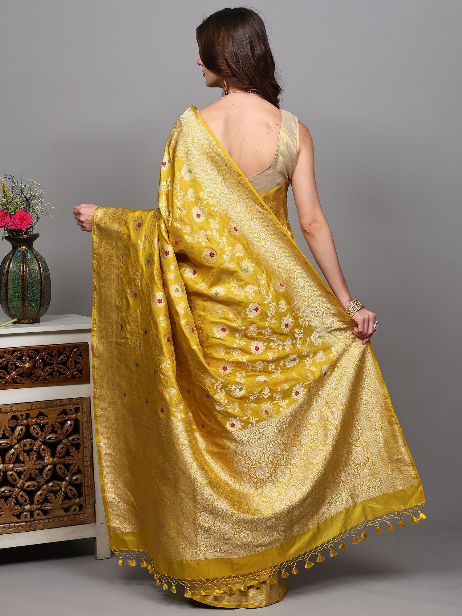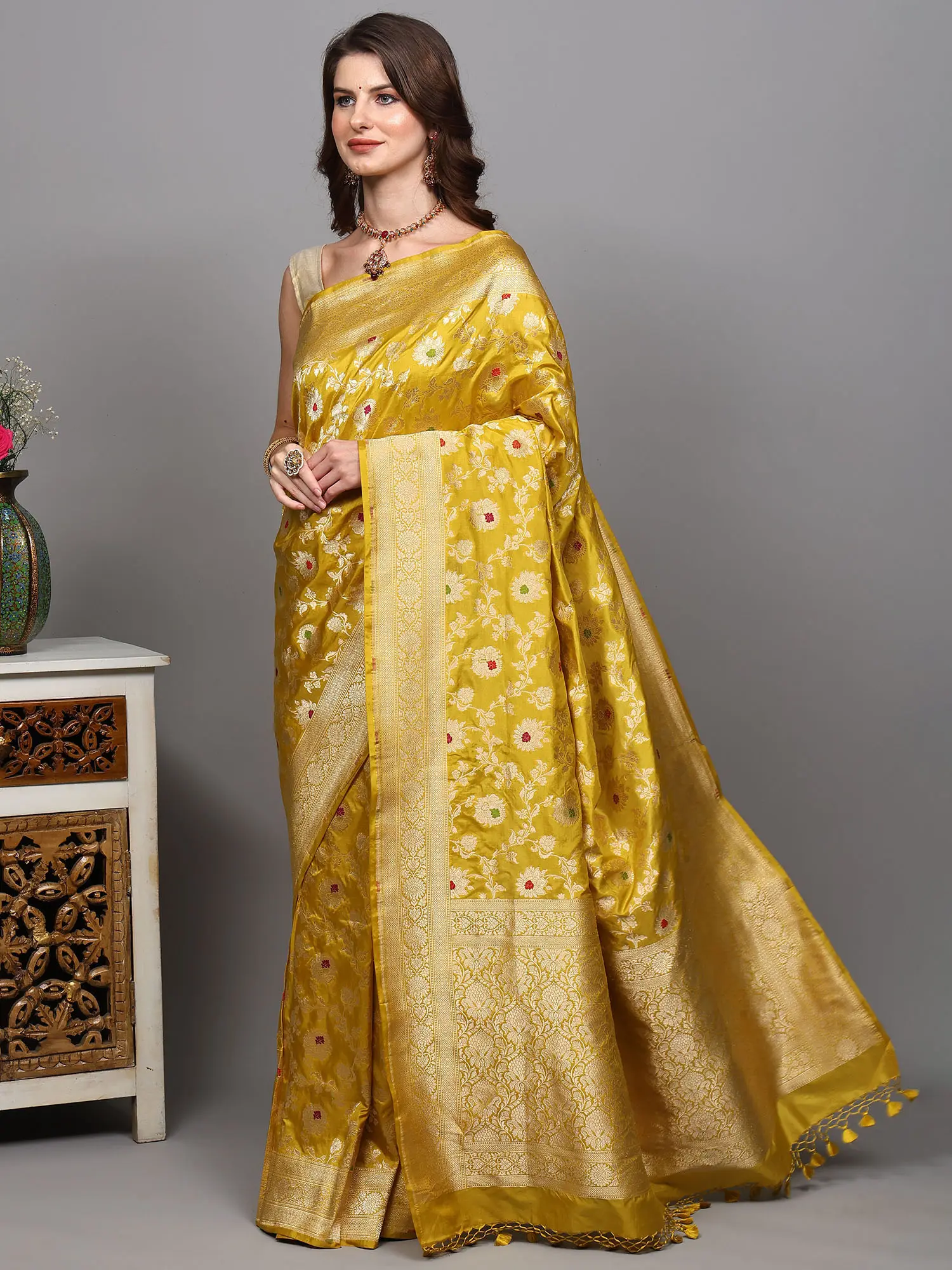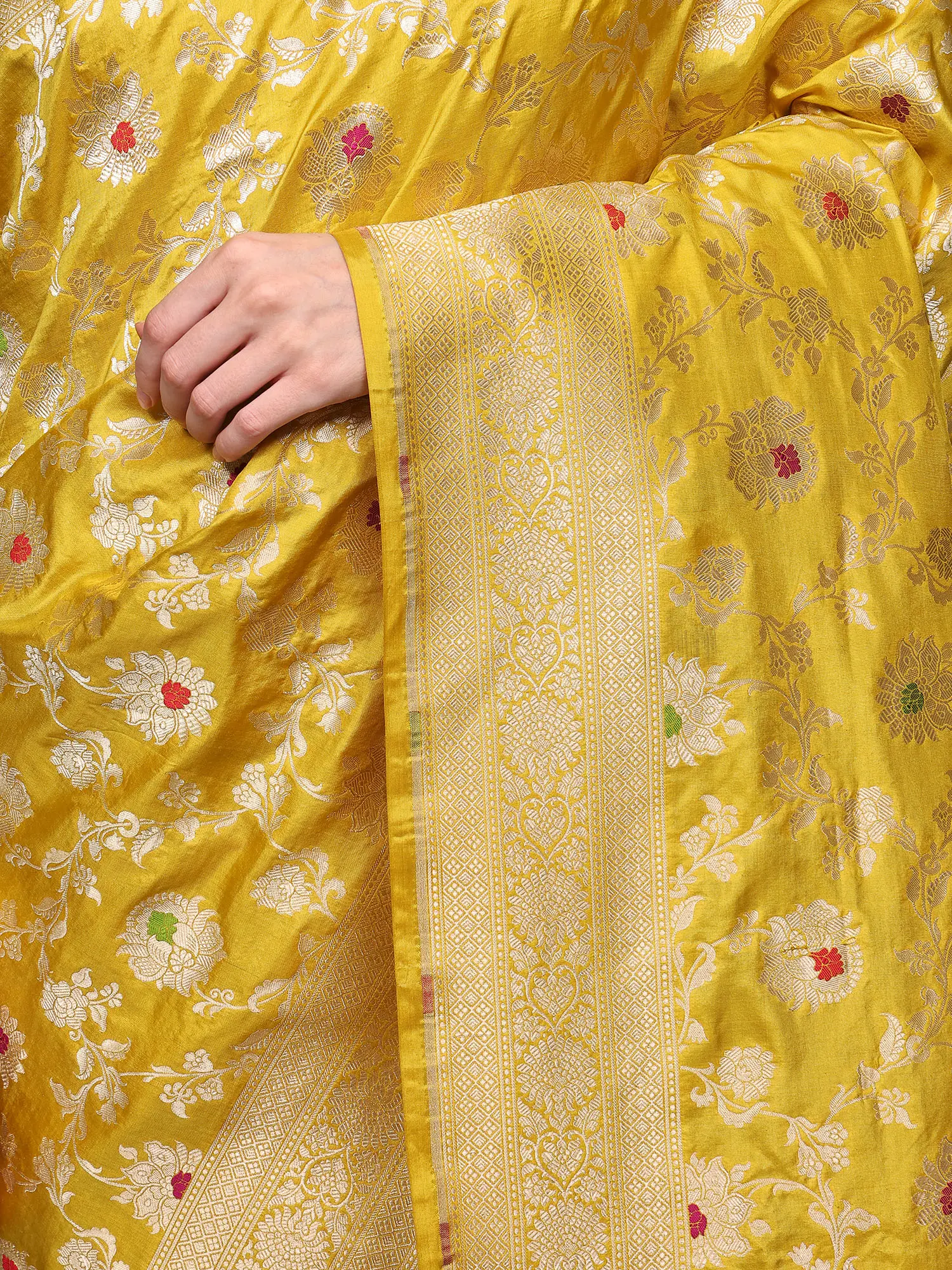 Golden-Rod Pure Silk Banarasi Saree with Woven Meenakari Floral Motifs