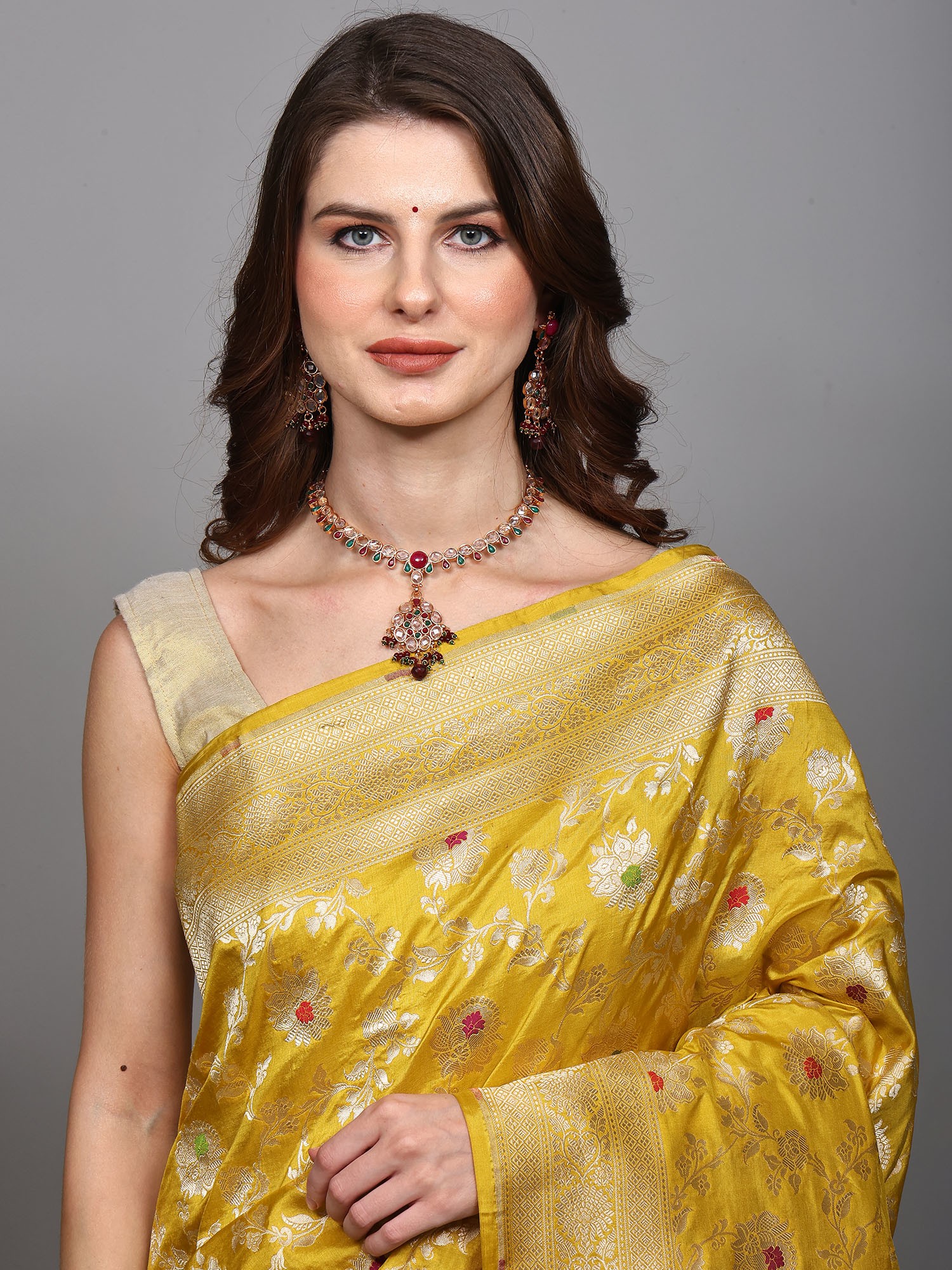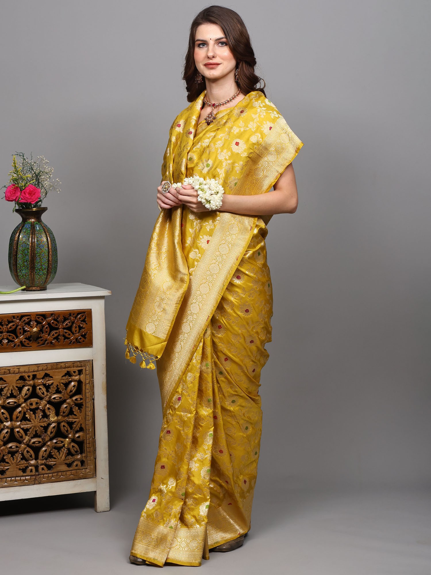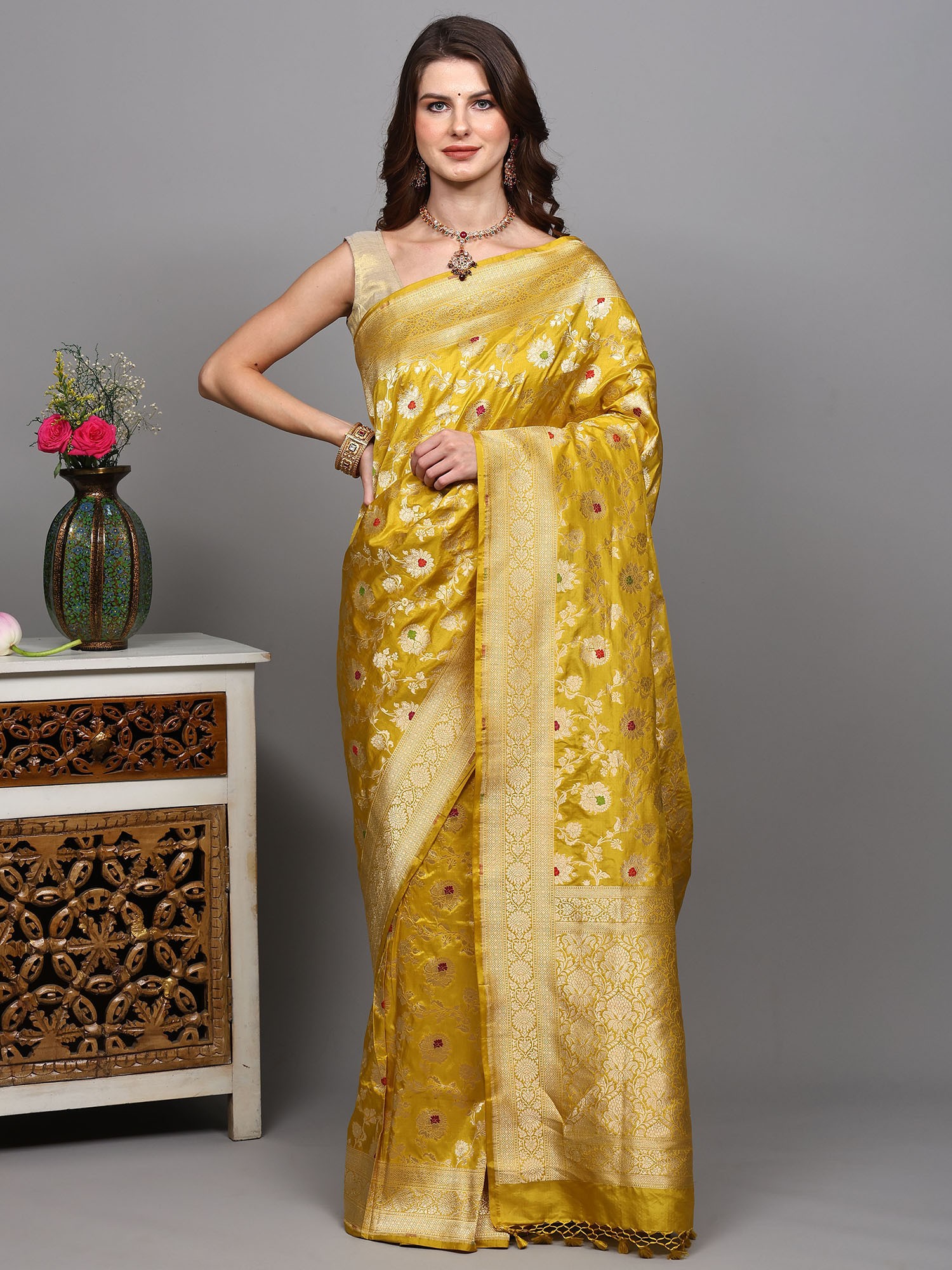 Golden-Rod Pure Silk Banarasi Saree with Woven Meenakari Floral Motifs