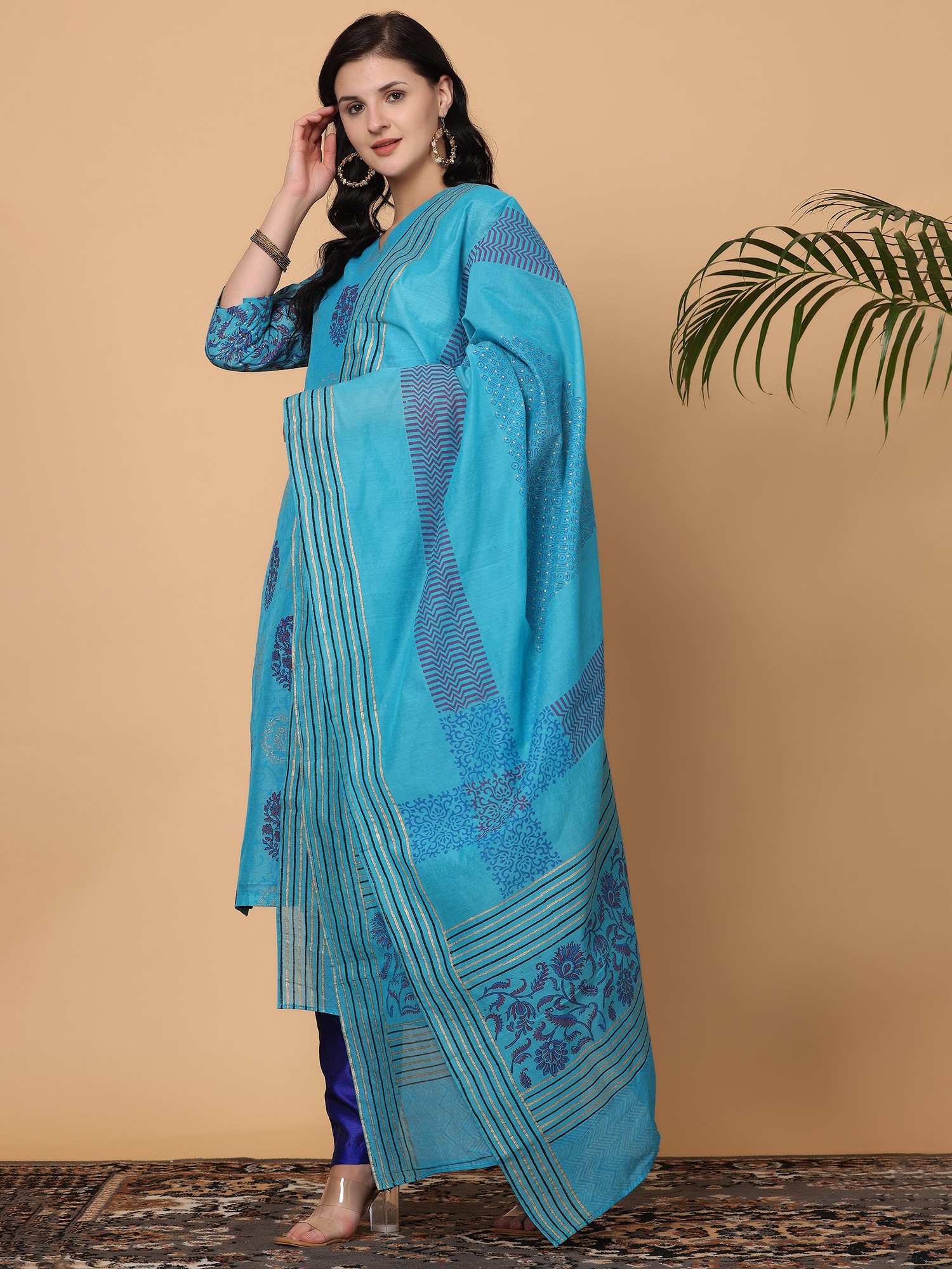 Embrace the spirit of festivity and elevate your wardrobe with this exquisite Chanderi kurta set, designed to make you shine at any party or special occasion. Crafted from the finest Silk Chanderi, this ensemble offers a luxurious drape and a subtle sheen that speaks of refined taste. The vibrant aqua blue hue forms a captivating canvas for the intricate floral block print, featuring traditional motifs in a deep indigo. Each floral element is rendered with precision, showcasing the artistry of block printing and adding a touch of heritage to this contemporary design.