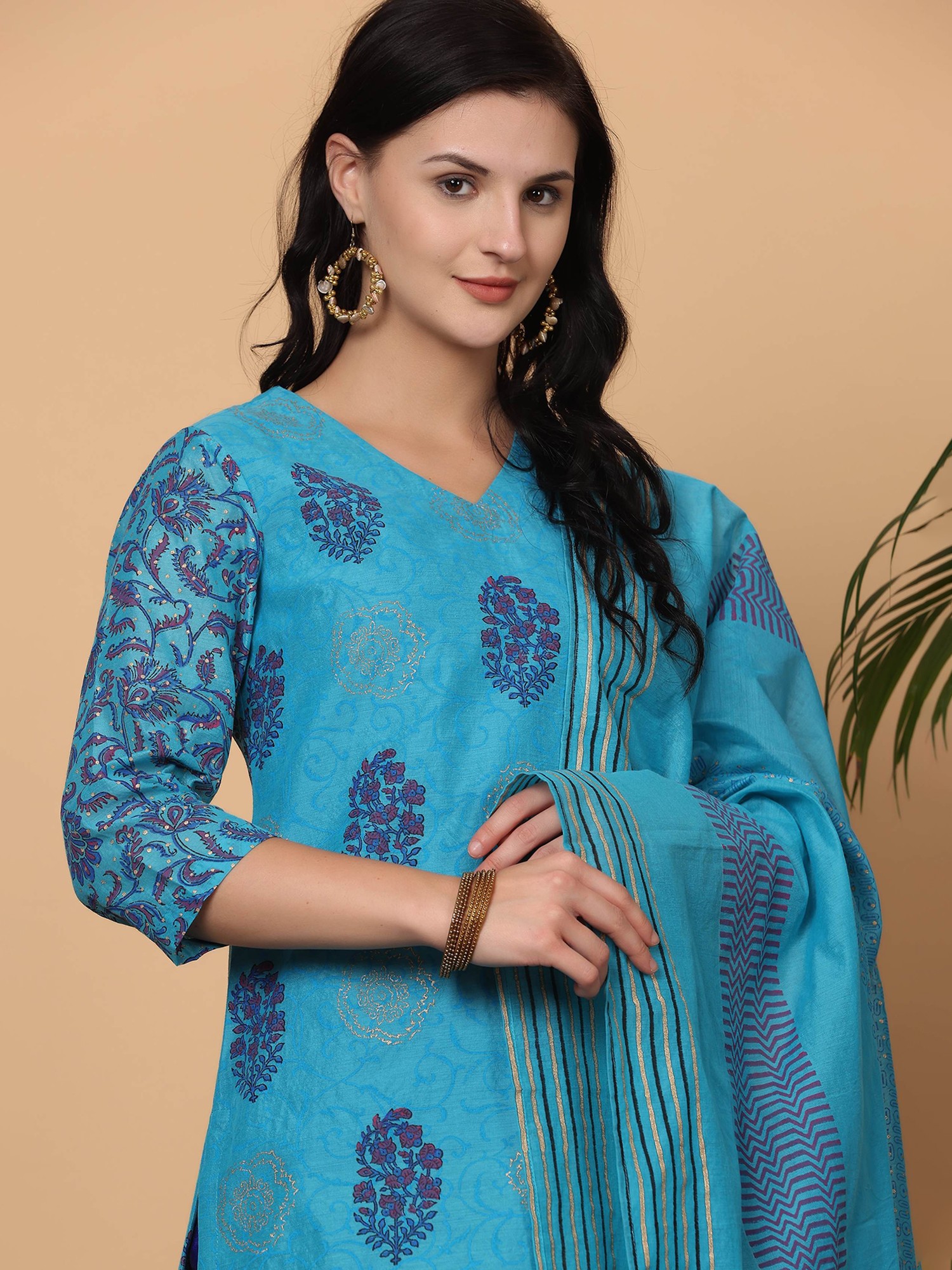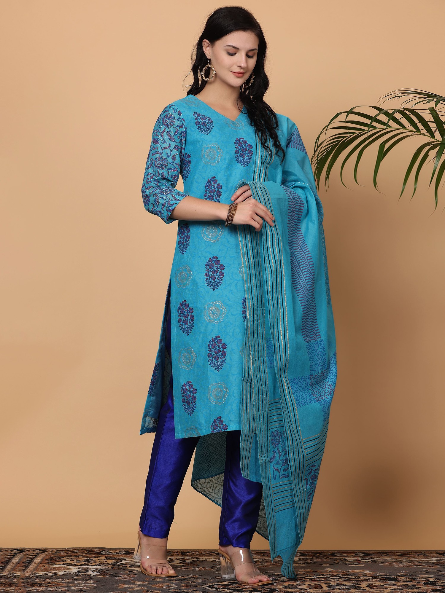 Turquoise Chanderi Block Print Kurta Set Paired With Silk Bottoms And Printed Chanderi Dupatta