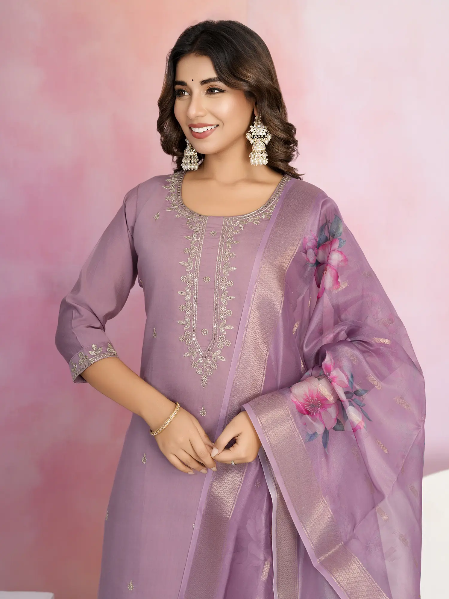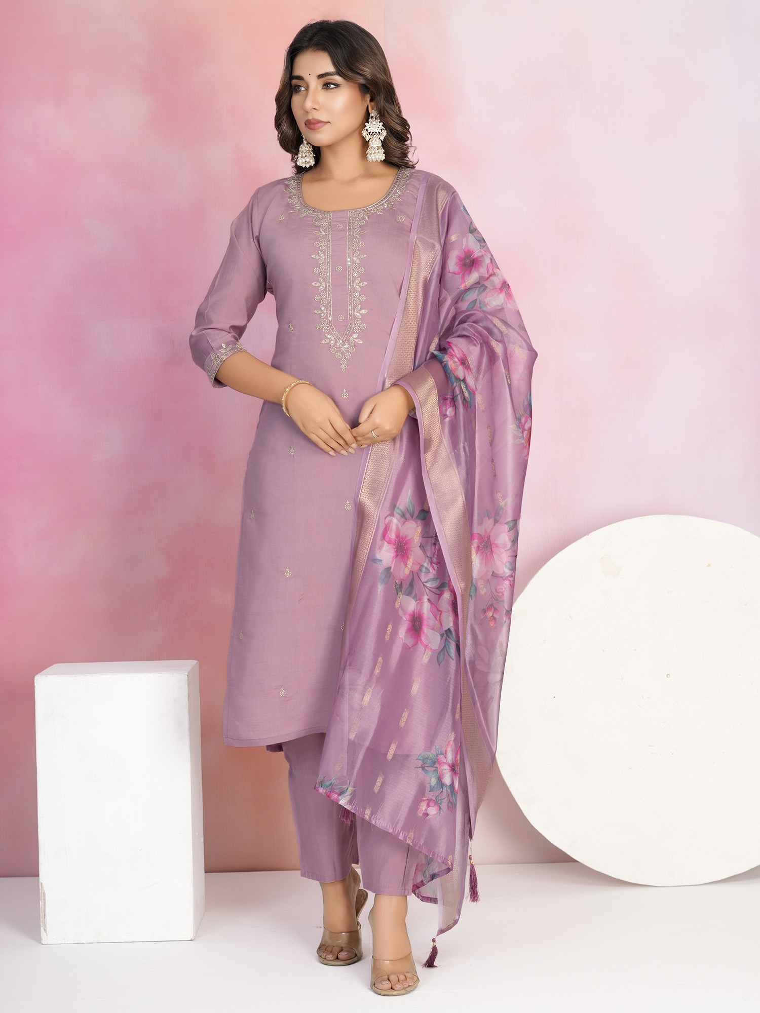 Mint-Green Designer Flowy Gown with Embroidered Flowers