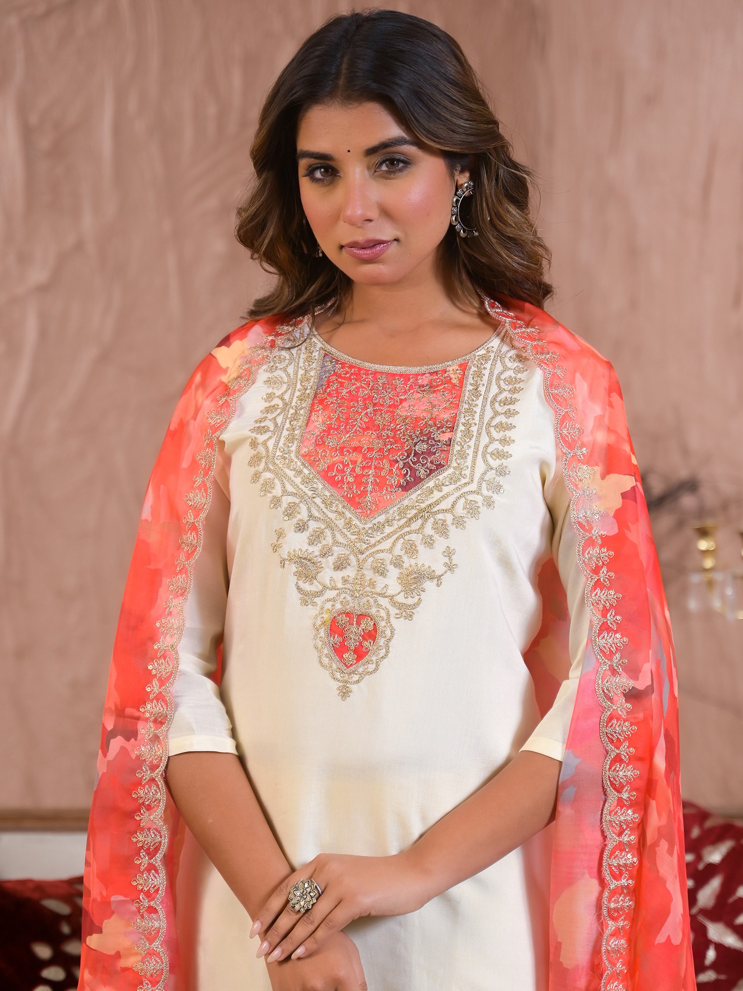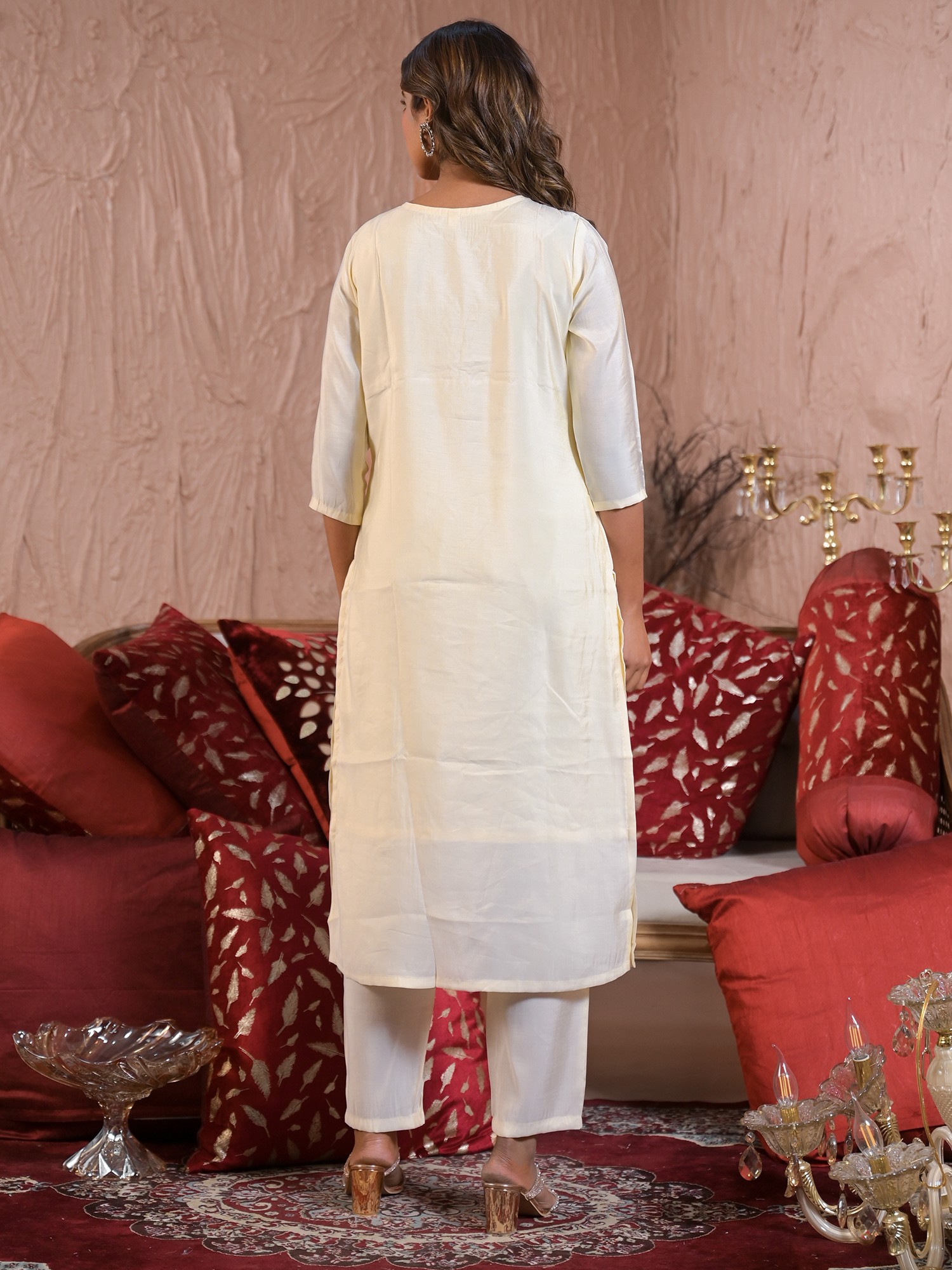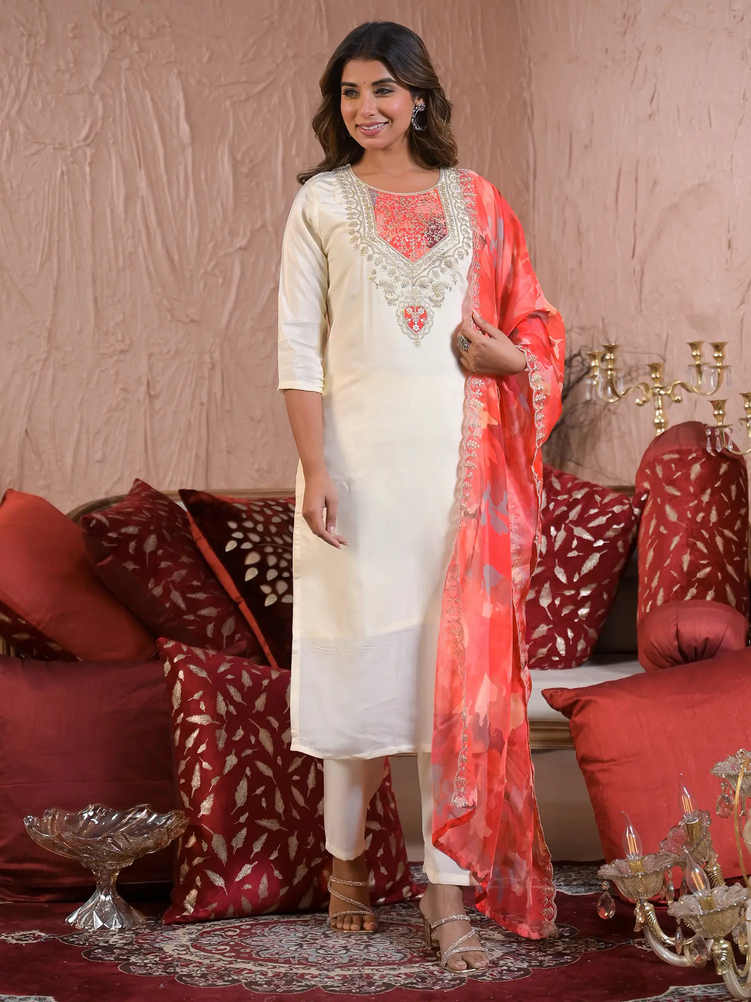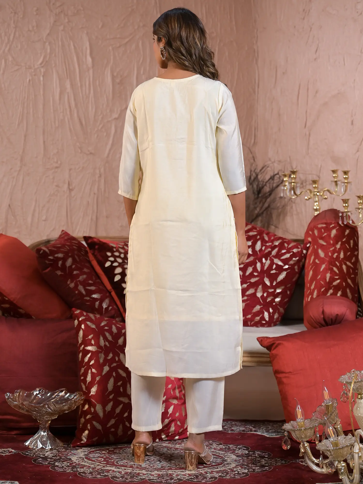White Viscose Chanderi Embroidery Work Festive Wear Kurta Set With Dupatta