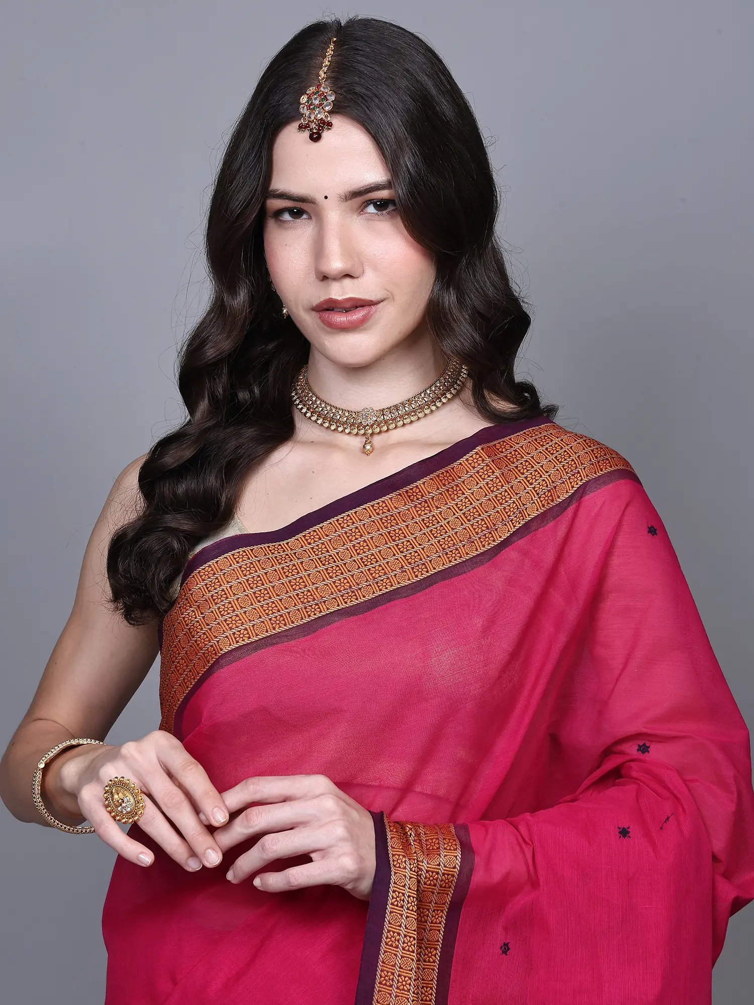 Experience the timeless elegance of Chettinad cotton with this exquisite saree. Hailing from the renowned weaving traditions of Kumbakonam, this garment is a testament to skilled craftsmanship and enduring style. The rich, vibrant pink hue serves as a captivating canvas, while subtle, woven buttis are artfully scattered across the fabric, adding depth and visual interest. These delicate motifs offer a sophisticated touch without overpowering the inherent beauty of the cotton.