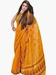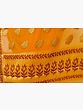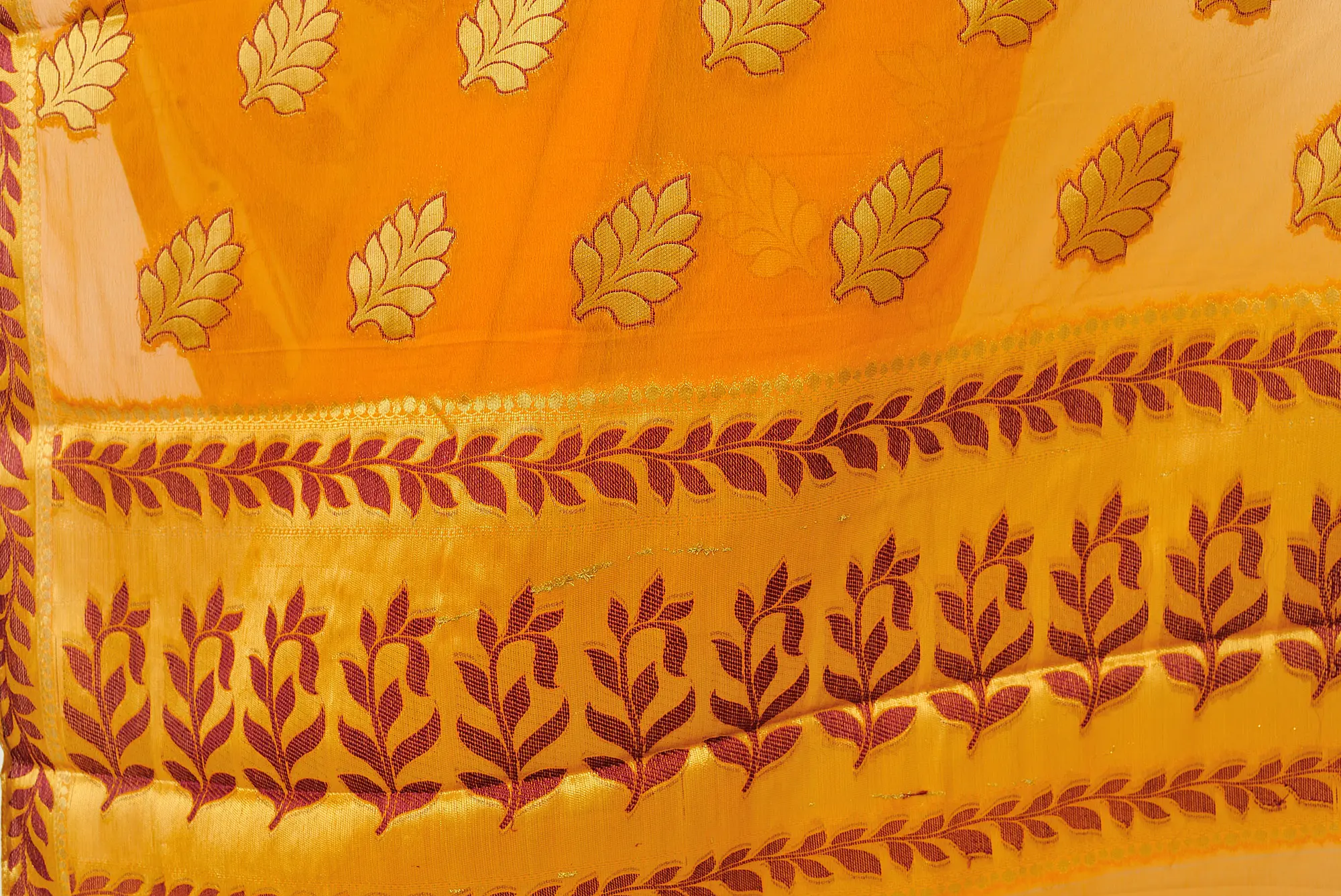 A lovely yellow- the color of joy, auspiciousness and divinity is spread on the field of this chiffon saree, the perfect pick for a special day. A graceful embrace of chiffon is embellished with beautiful golden leaves and a contrasting vine border. The pallu is covered in golden thread base over which floral patterns bloom.