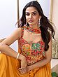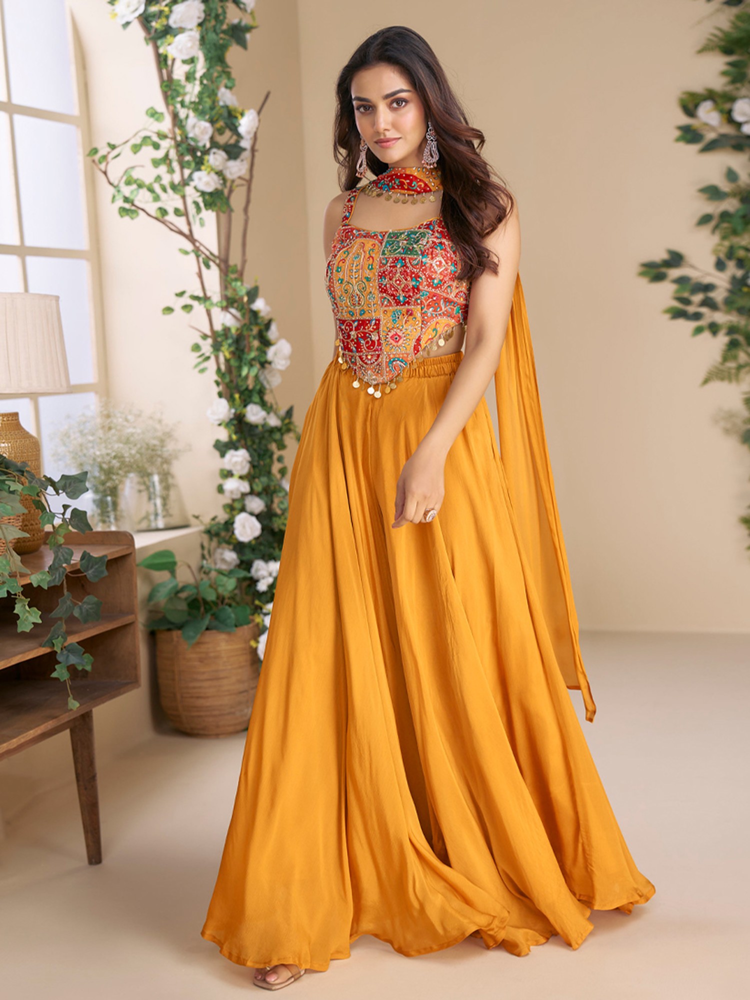This ensemble draws inspiration from the rich heritage of Indian textiles, reinterpreted for the contemporary connoisseur. The Bandhani technique, a time-honored method of tie-dye, is subtly referenced in the vibrant patterns of the crop top, evoking a sense of cultural depth and artistry. It represents a bridge between tradition and modern fashion, offering a piece that is both culturally significant and effortlessly chic.