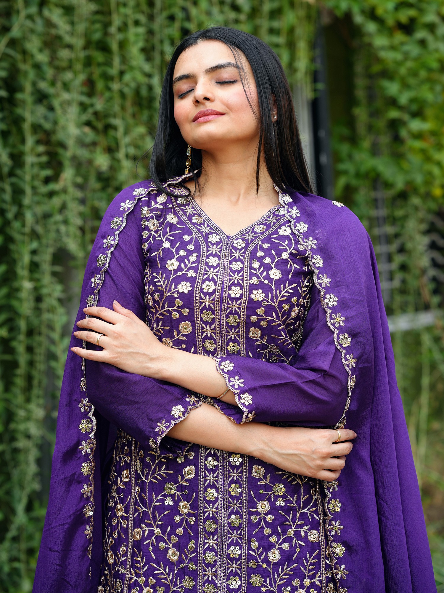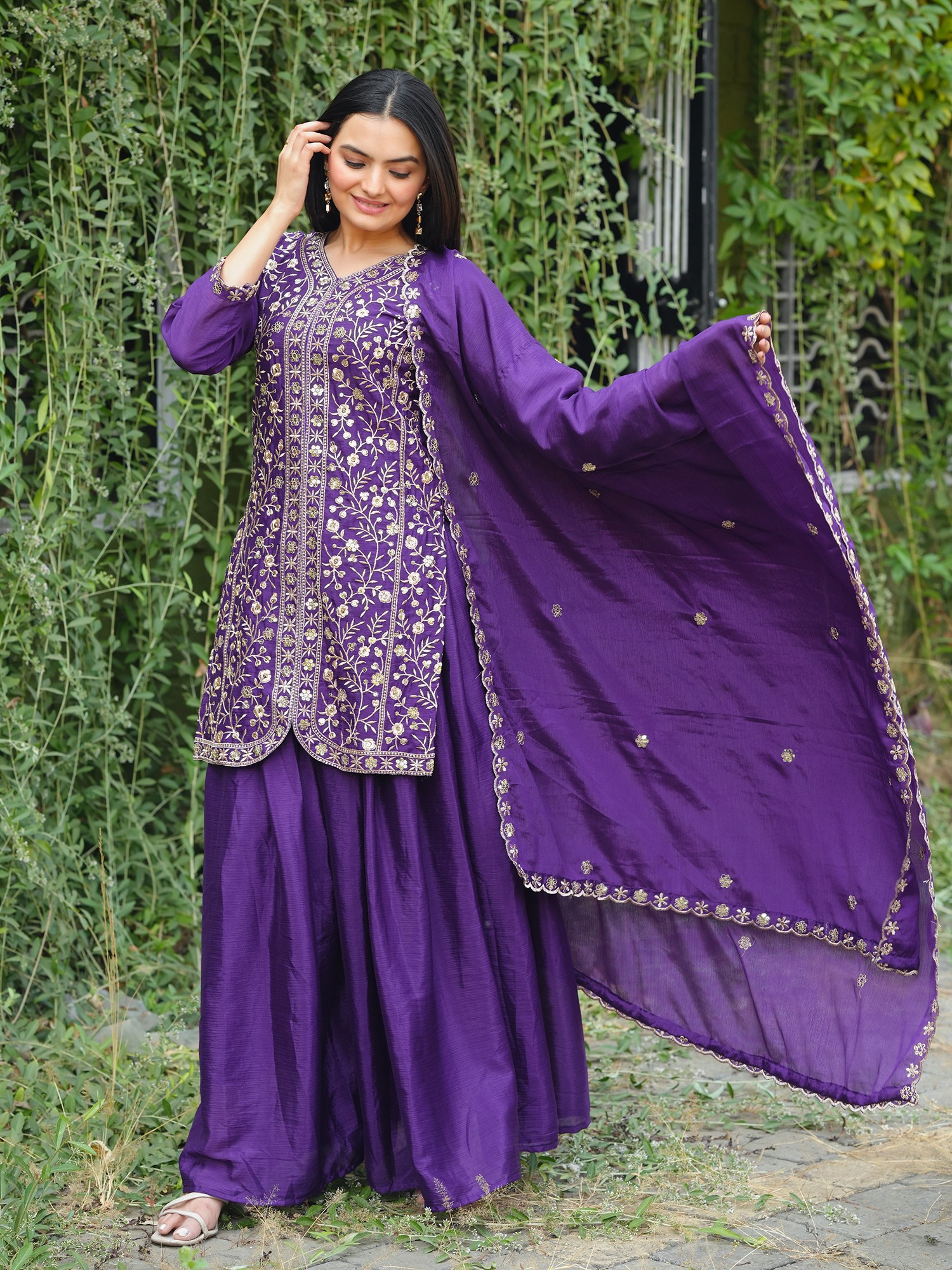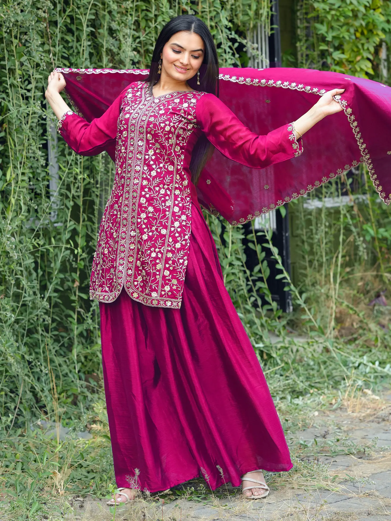 Chinon Embroidery And Sequins Work Kurti With Sharara And Dupatta For Festival Occasion