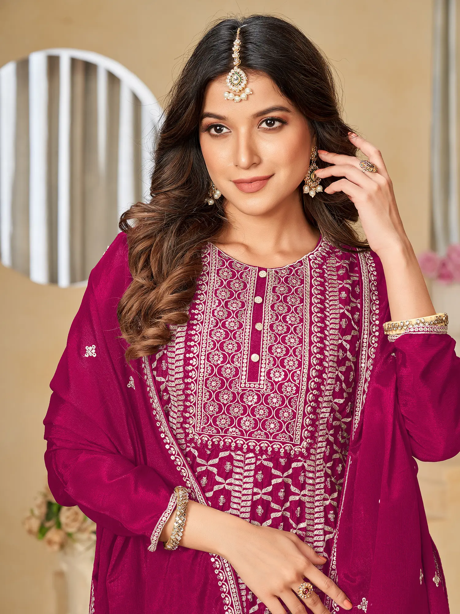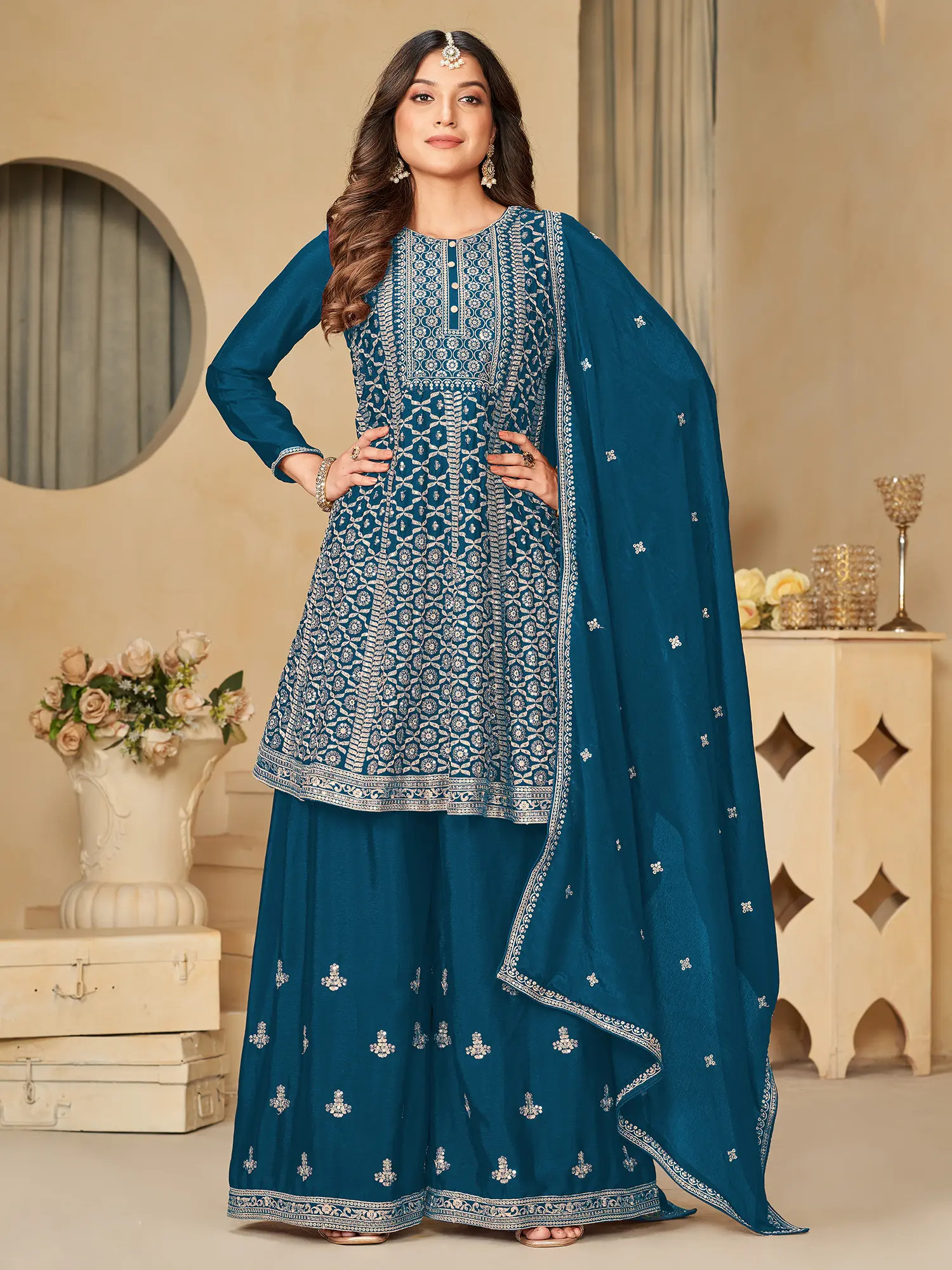 Complementing the resplendent suit is a beautifully coordinated dupatta. Crafted from the same lustrous Chinon fabric, the dupatta is generously sized and features a delicate border of the same intricate floral embroidery seen on the kameez and palazzo. This thoughtful detailing ensures a seamless flow of design, making the entire ensemble a work of art. The lightweight nature of the dupatta allows it to be draped with effortless grace, adding a final layer of elegance and sophistication to your attire. This palazzo suit is more than just clothing; it's an expression of timeless style and a celebration of exquisite artistry, perfect for making an unforgettable impression at any wedding celebration.