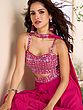 Crafted from the finest Chinon fabric, this creation drapes beautifully, offering a luxurious feel against your skin. The crop top is a canvas of intricate thread and sequin embroidery, meticulously applied by skilled artisans. Each stitch and shimmer tells a story of dedication, transforming a simple garment into a wearable work of art. The flowing palazzo pants are designed with a thoughtful cut, ensuring graceful movement with every step.
