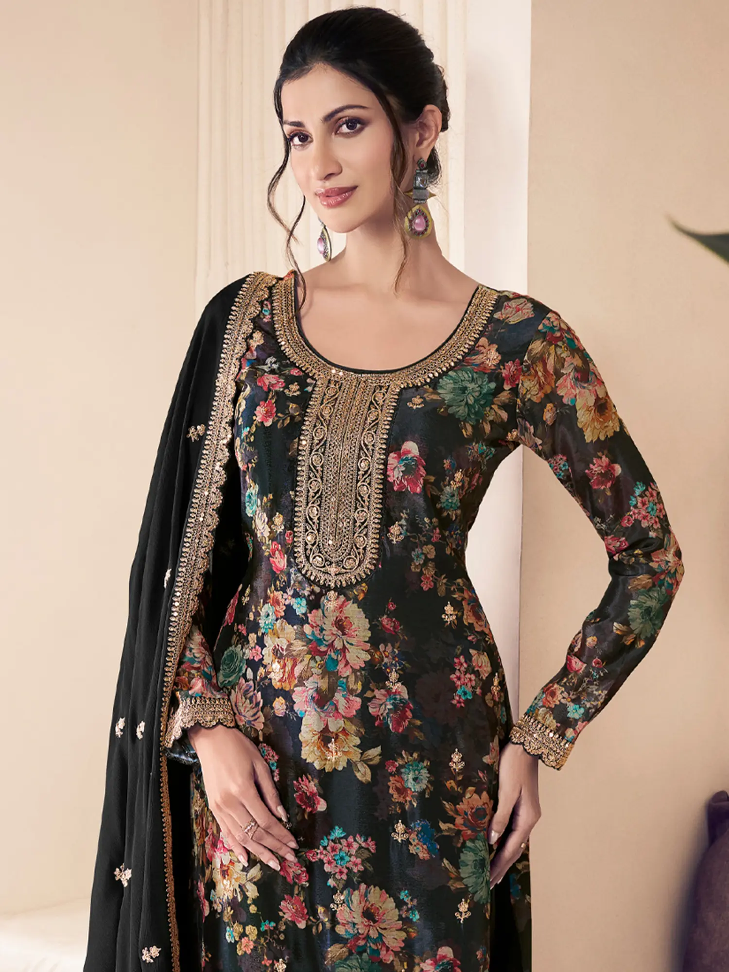 The ensemble features a gracefully long suit, perfectly complemented by a coordinating salwar and a flowing dupatta. The rich floral motif is a feast for the eyes, further enhanced by exquisite embroidery around the neckline and along the borders of the suit and dupatta, shimmering with subtle elegance. The accompanying dupatta, in a complementary shade, is adorned with delicate scattered motifs and fringed tassels, adding a final flourish of sophistication. This is the perfect expression of refined style, designed to flatter and enchant.