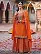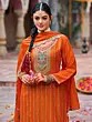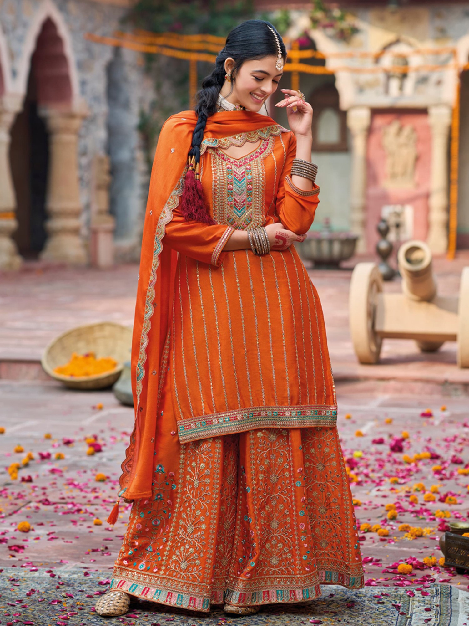 The striking orange hue evokes a sense of warmth and celebration, beautifully complemented by the elaborate embellishments. Vertical lines of delicate sequins adorn the kurta, creating a visually elongating effect. The neckline and hem are framed by richly embroidered borders, featuring a symphony of vibrant threads and sparkling accents, adding depth and opulence. The flowing dupatta mirrors this artistry, offering a touch of coordinated elegance. This piece is presented in a Size #38 (Medium), tailored to offer a flattering fit for discerning individuals.