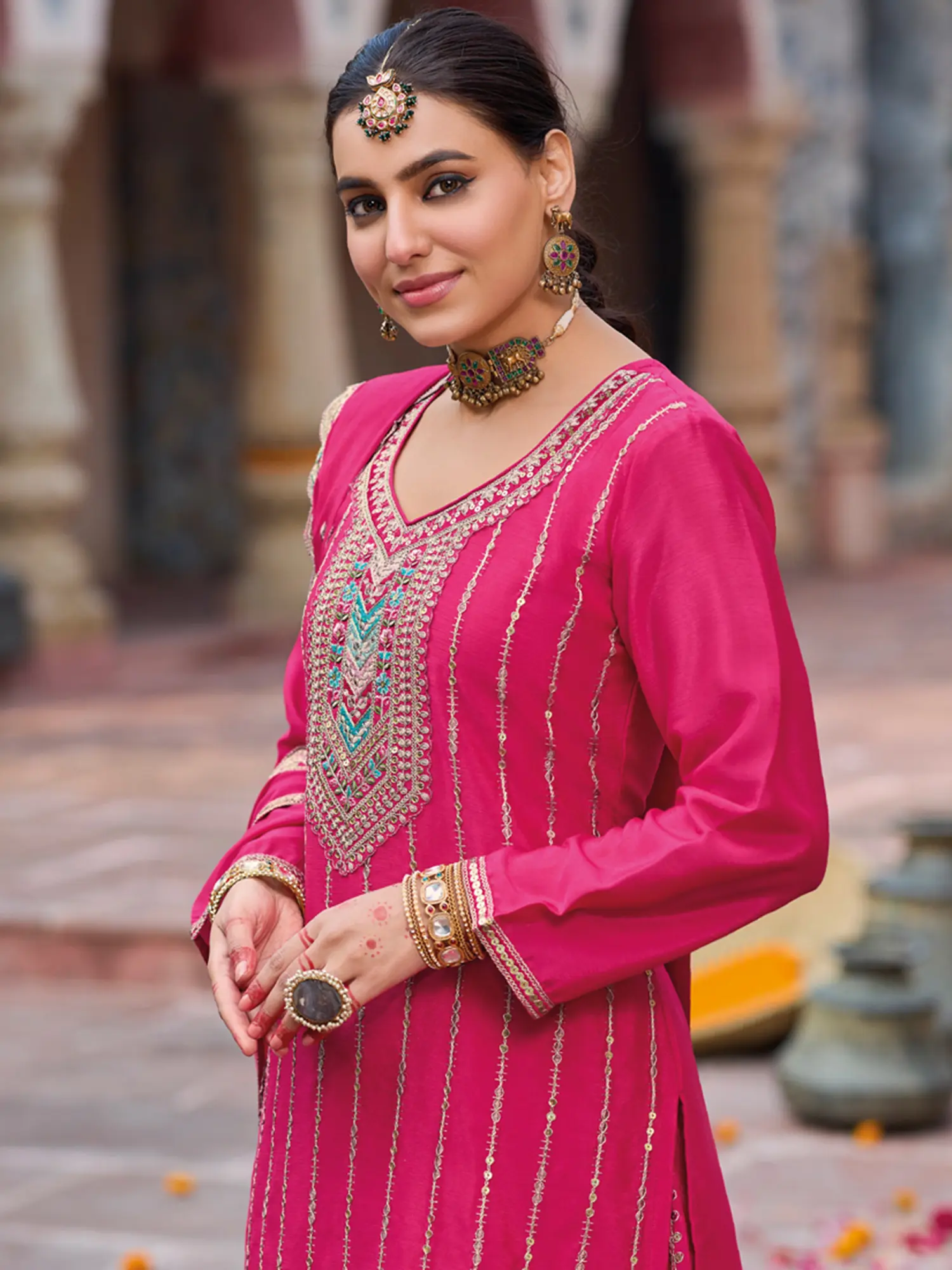 Designer Heavy Thread Embroidery And Sequins Work Chinon Palazzo Suit With Dupatta