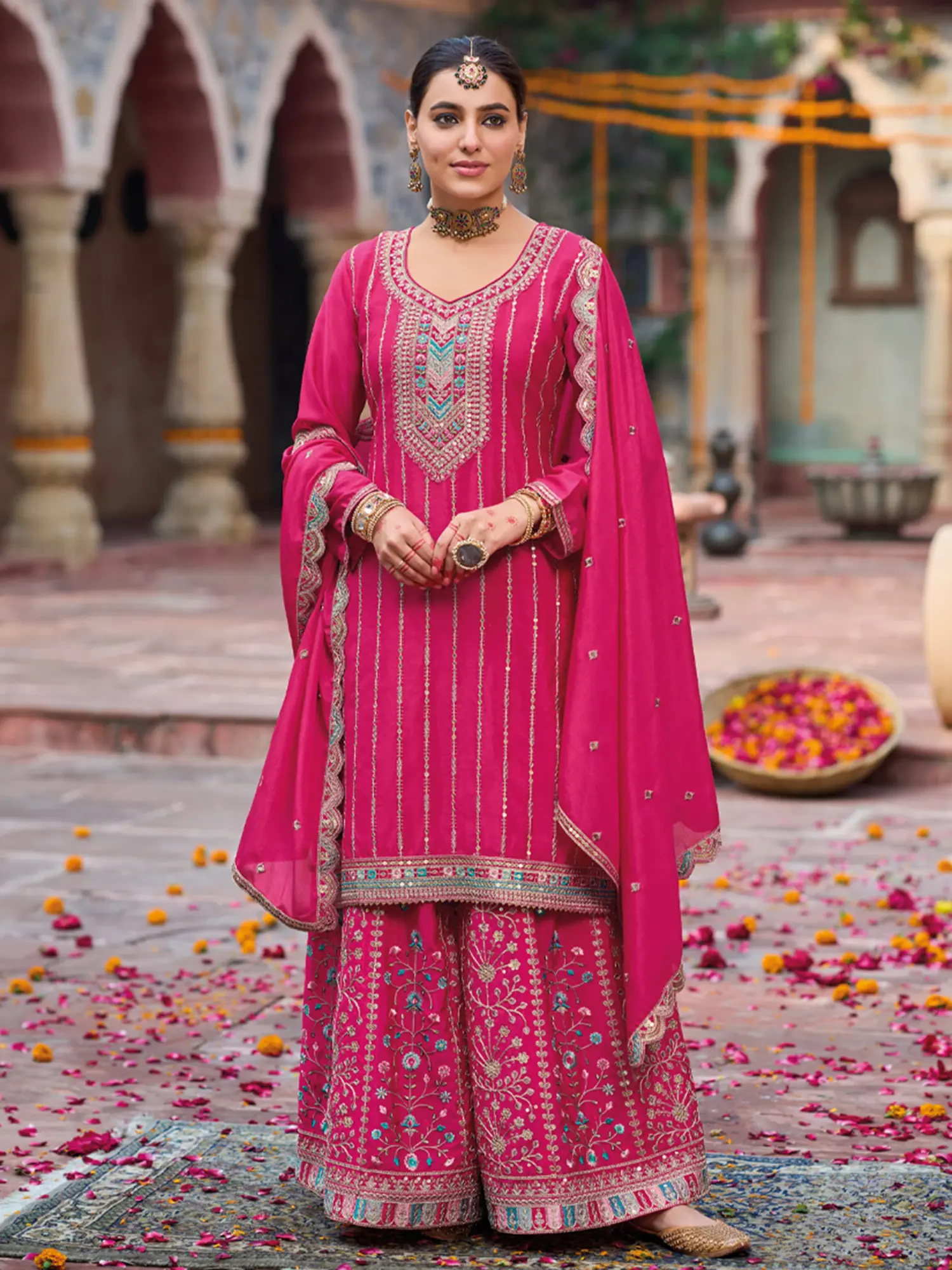 Heavy Thread Sequin Embroidery Chinon Palazzo Suit With Matching Dupatta For Elegant Festive Wedding And Party Wear