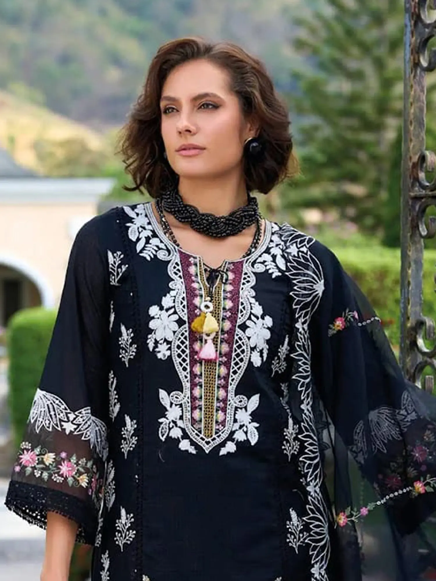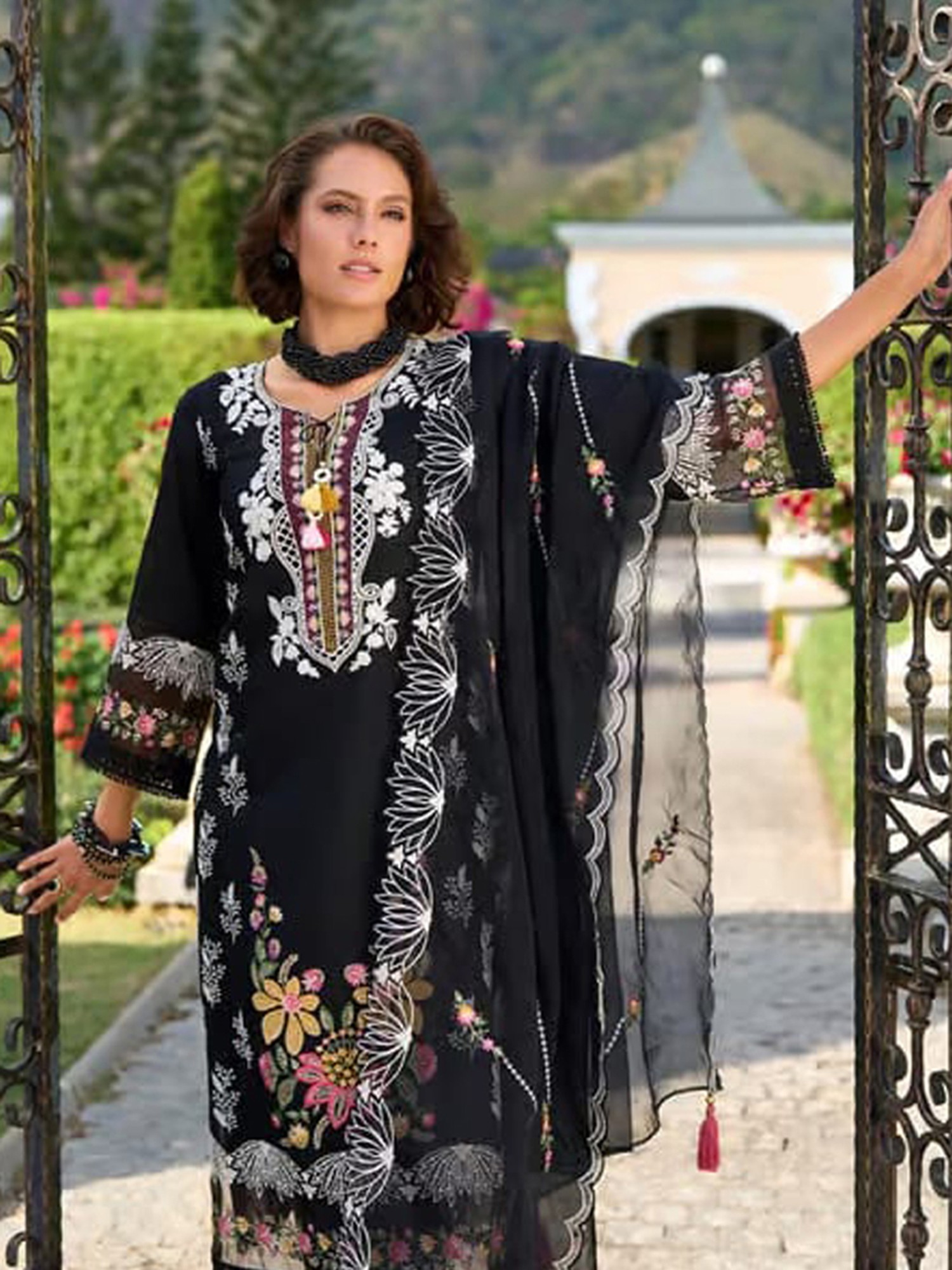 You'll appreciate the breathtaking detail that defines this ensemble. The embroidery, rendered in a captivating palette of colors, flows across the fabric, creating a visual tapestry that is both vibrant and sophisticated. The accompanying organza dupatta, designed for medium-sized frames, is finished with delicate scalloped edges and scattered floral accents, mirroring the richness of the main garment. The interplay of textures and embellishments creates a truly captivating piece that speaks of understated luxury.