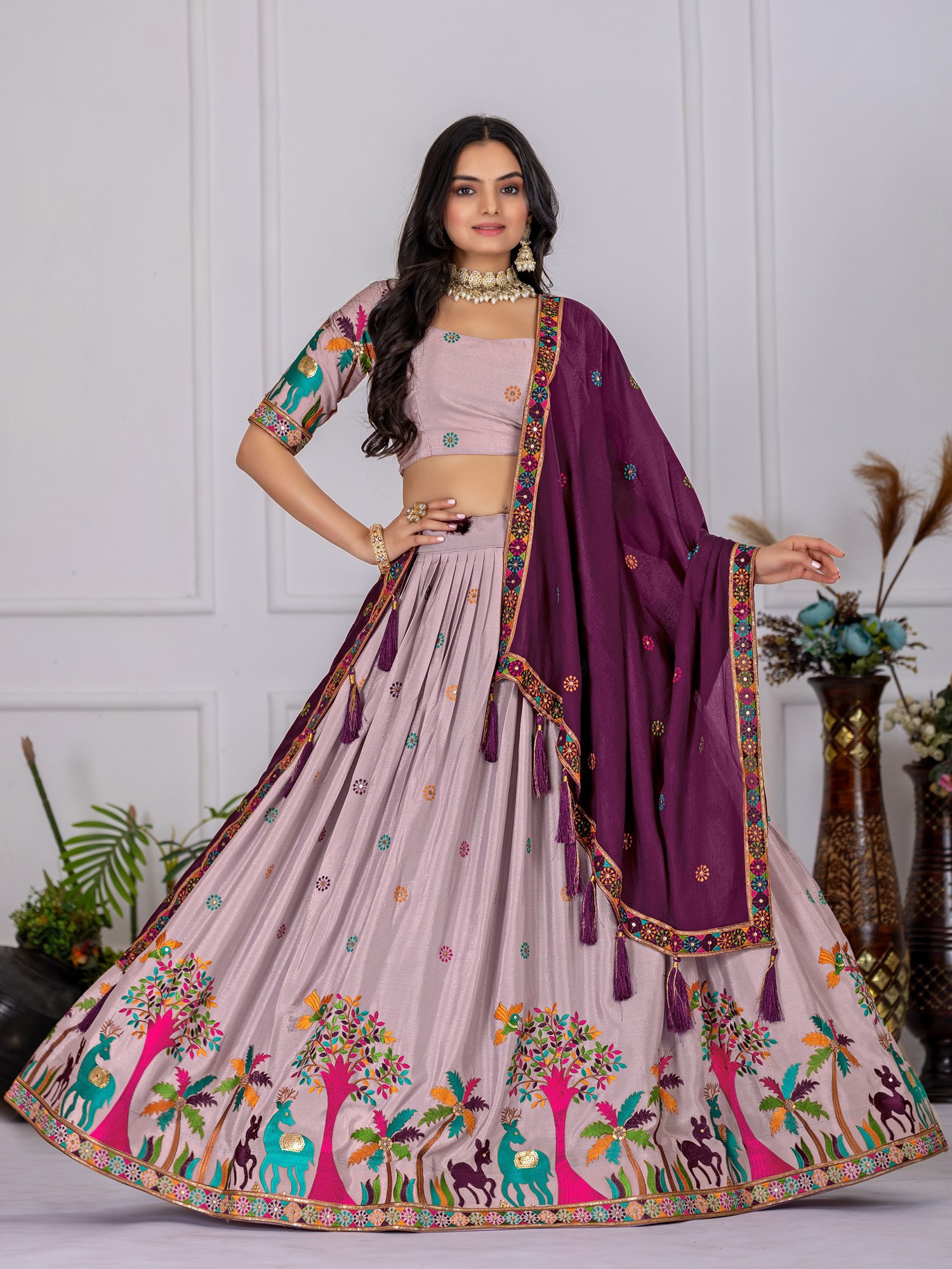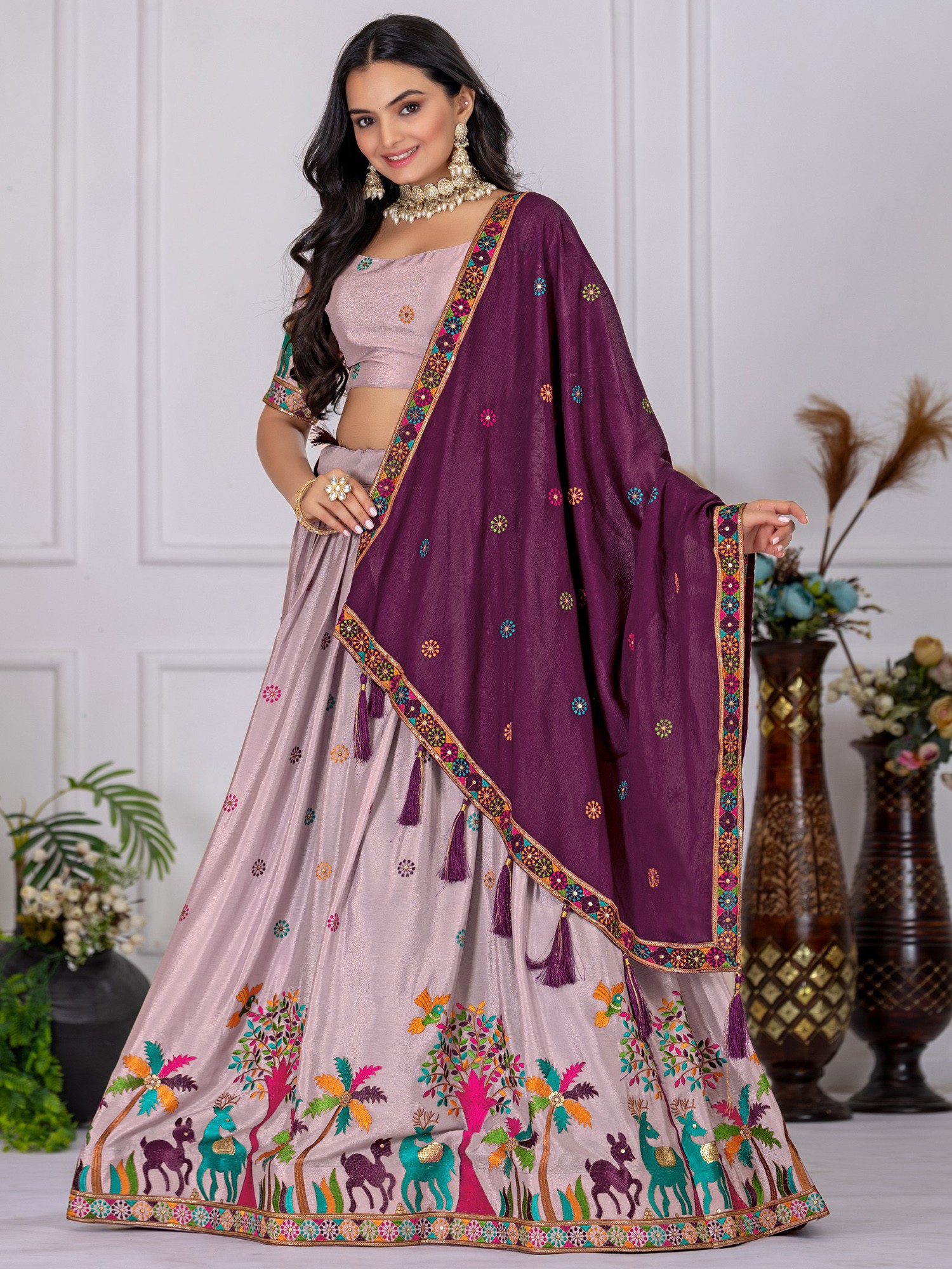 Light-Pink Soft Net Thread Embroidered Lehenga Choli with Sheer Dupatta